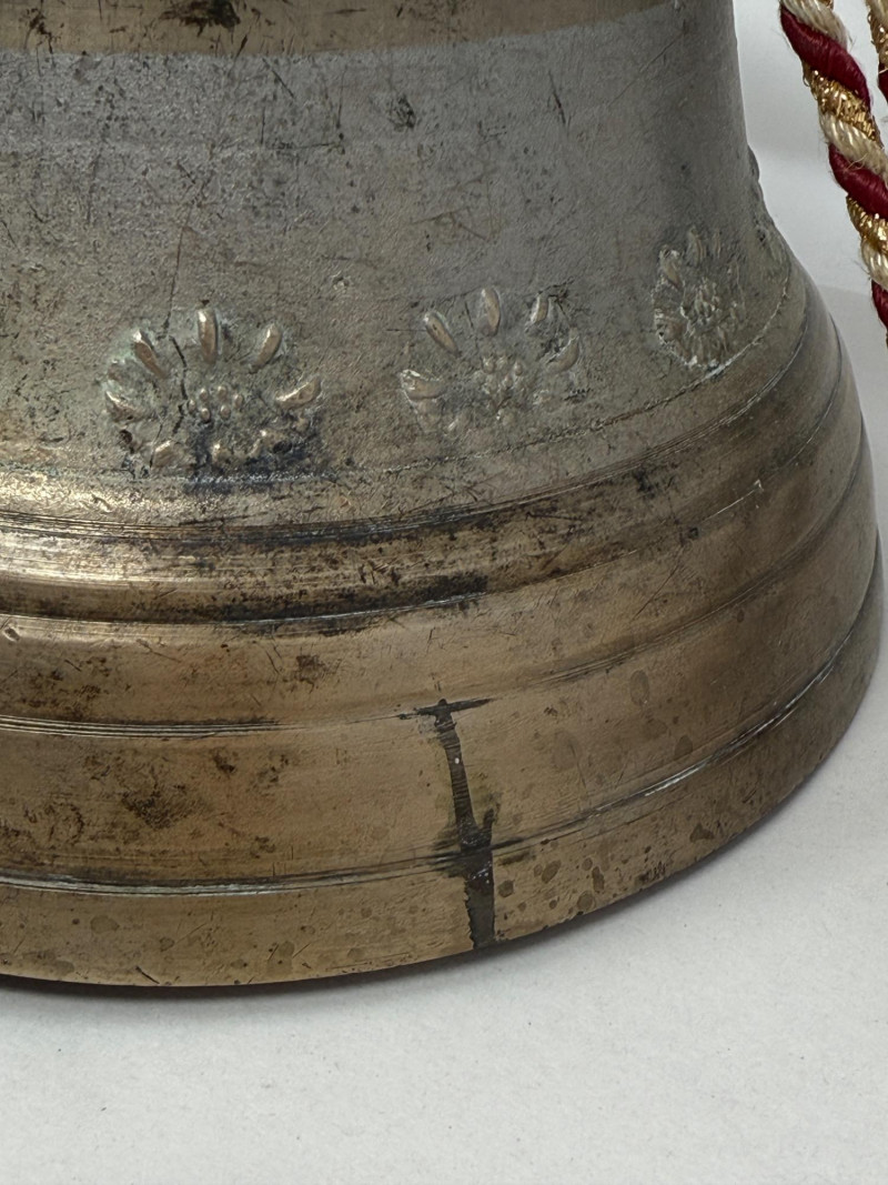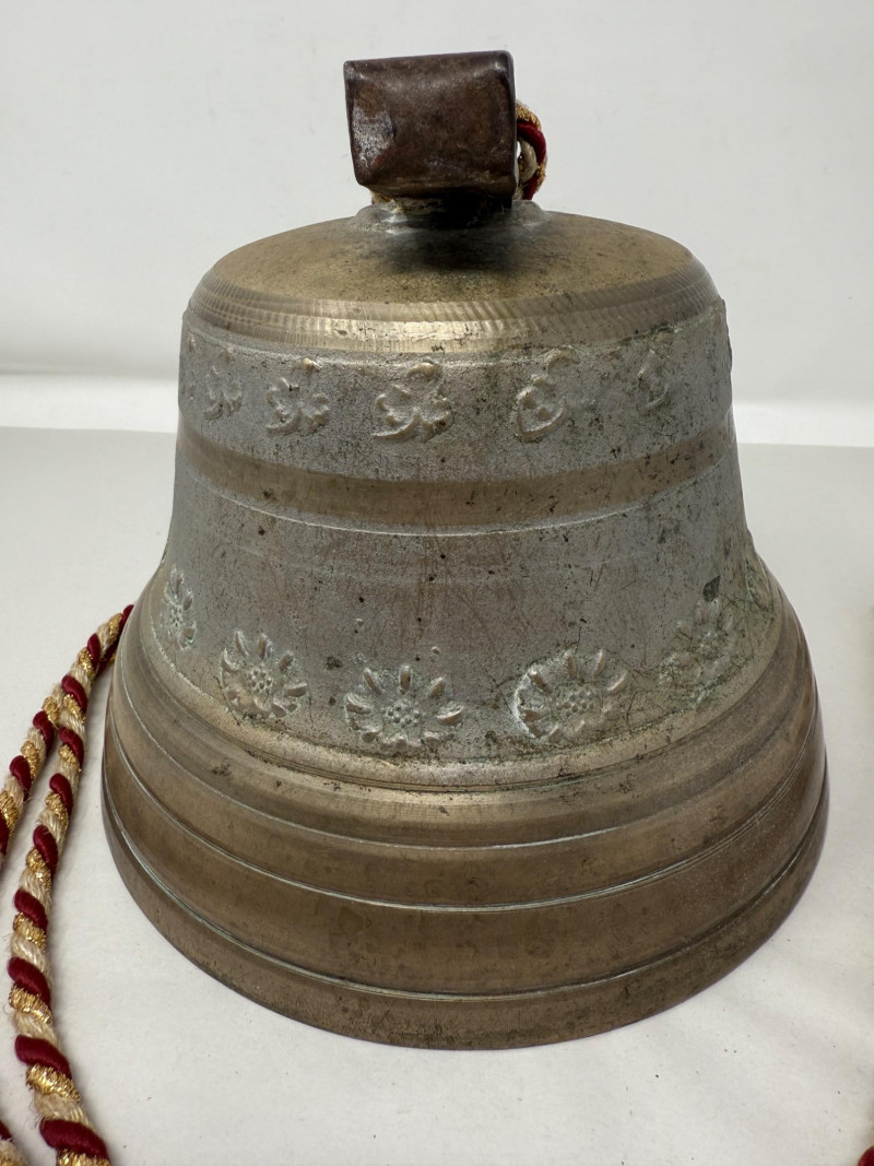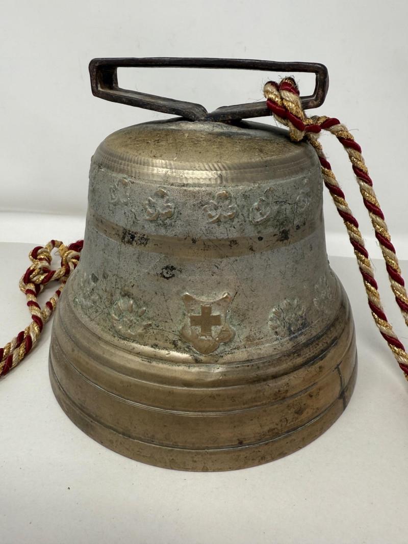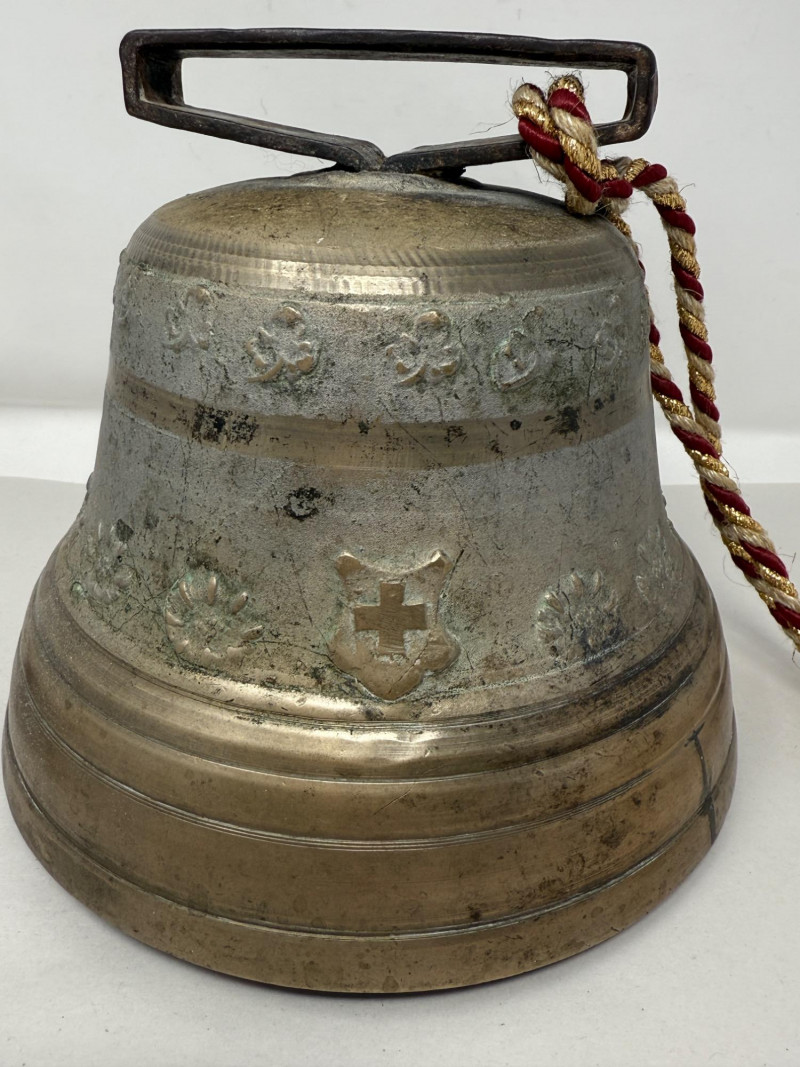 Large Antique Swiss Cowbell or "Kuhglocken" By Alb. Gusset Made by the Alb. Gusset foundry in Uetendorf, Switzerland in the late 19th and first half of the 20th century These bells were used by shepherds in the Alps to keep track of their cattle. They are typically made of bronze or brass and feature high relief motifs of flowers and the Swiss coat of arms. Original leather strap is missing and has been replaced with a decorative red, white, and gold cord. This piece has a beautiful patina and appears to be bronze in very nice condition. Bell: 7" tall x 8" diameter (at the base)
