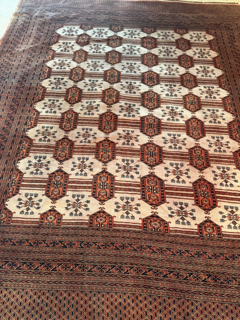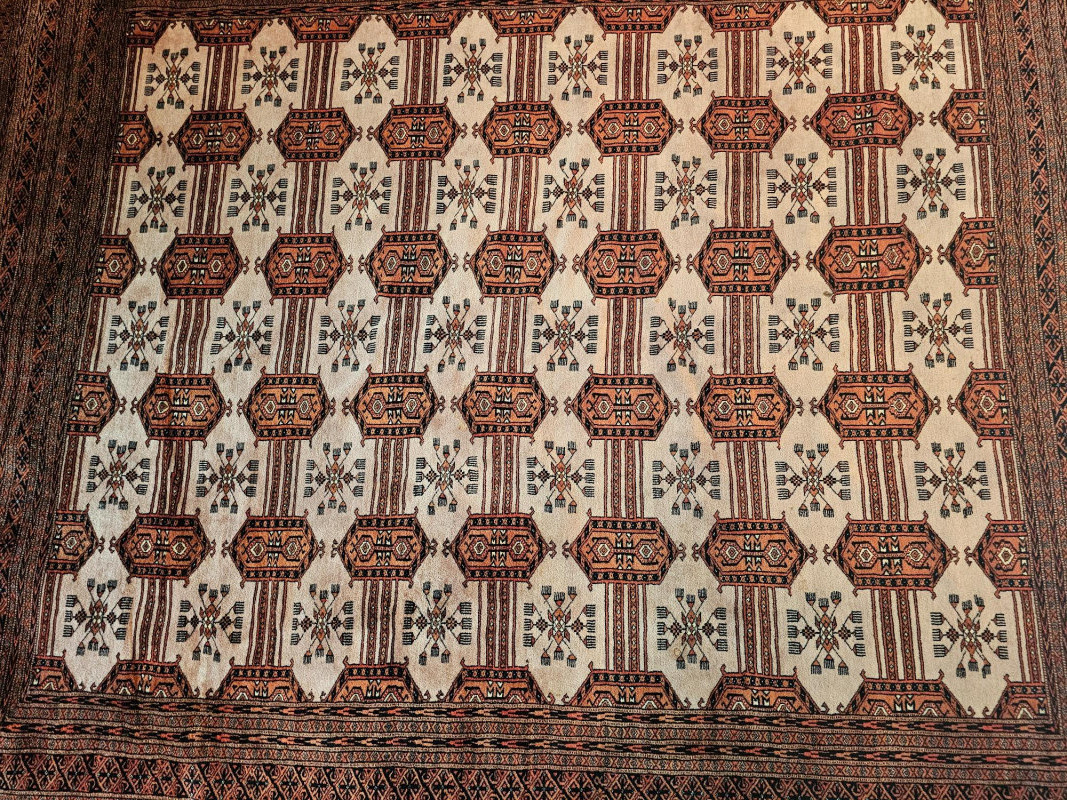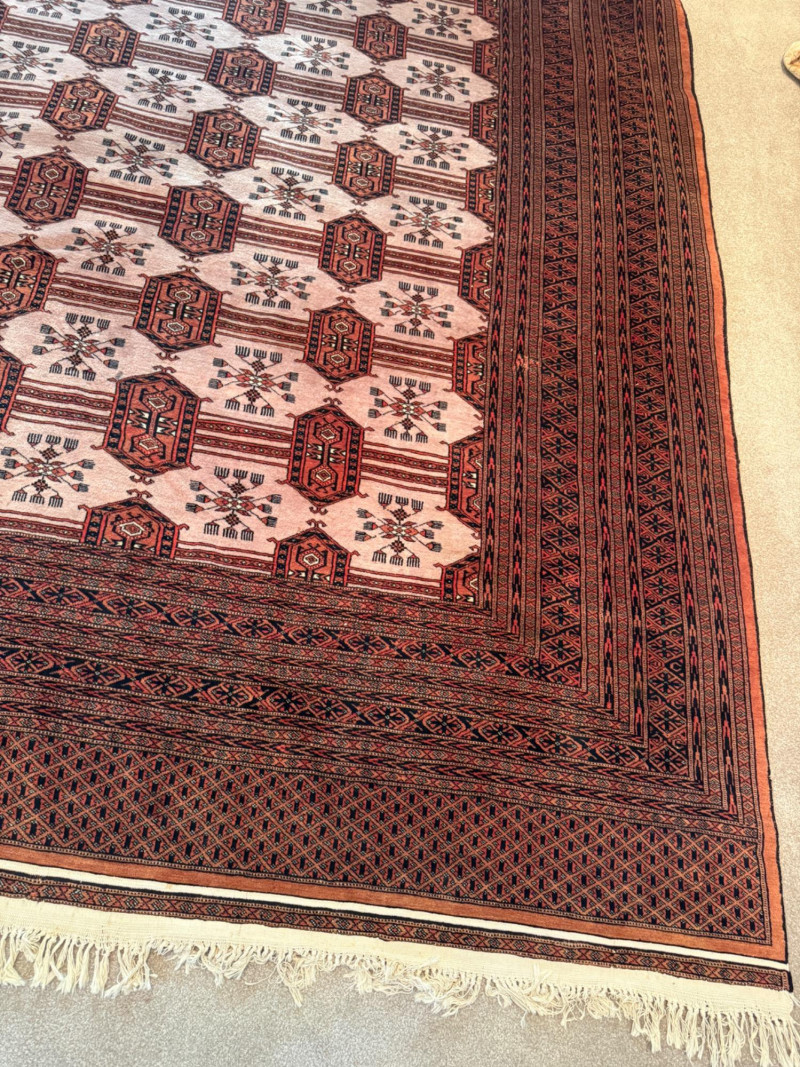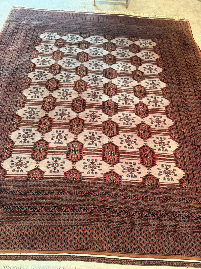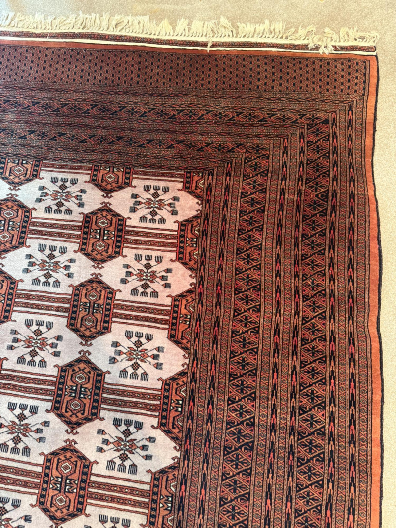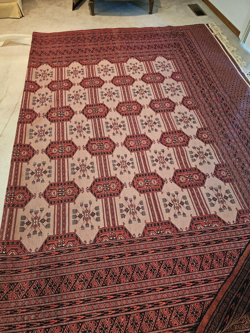 Gorgeous 1980s Pakistani Bukhara Hand-Made Rug Pakistani Bukhara carpets are a type of handmade rug known for their geometric patterns, particularly repeating octagonal designs (gules), and are typically made with a wool pile and cotton foundation. They are inspired by the rugs woven by the Tekke tribe in Turkmenistan and are often found in a rich burgundy red, blue, ivory, or green color. While historically popular, they are less common now, with many being mistaken for more valuable silk or Persian rugs Pakistani Bukhara rugs are known for their shiny appearance, often achieved through a process called mercerization of the cotton foundation Pakistani versions typically have around 200 knots per square inch Appears to be in very nice condition (see pics) This rug is currently valued at $15-$25 per sqft Reserve starting bid of $125 for this item 135" x 113" (107sqft)