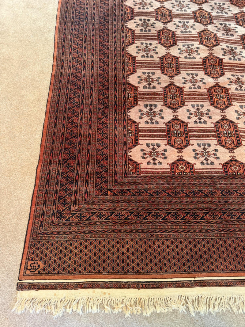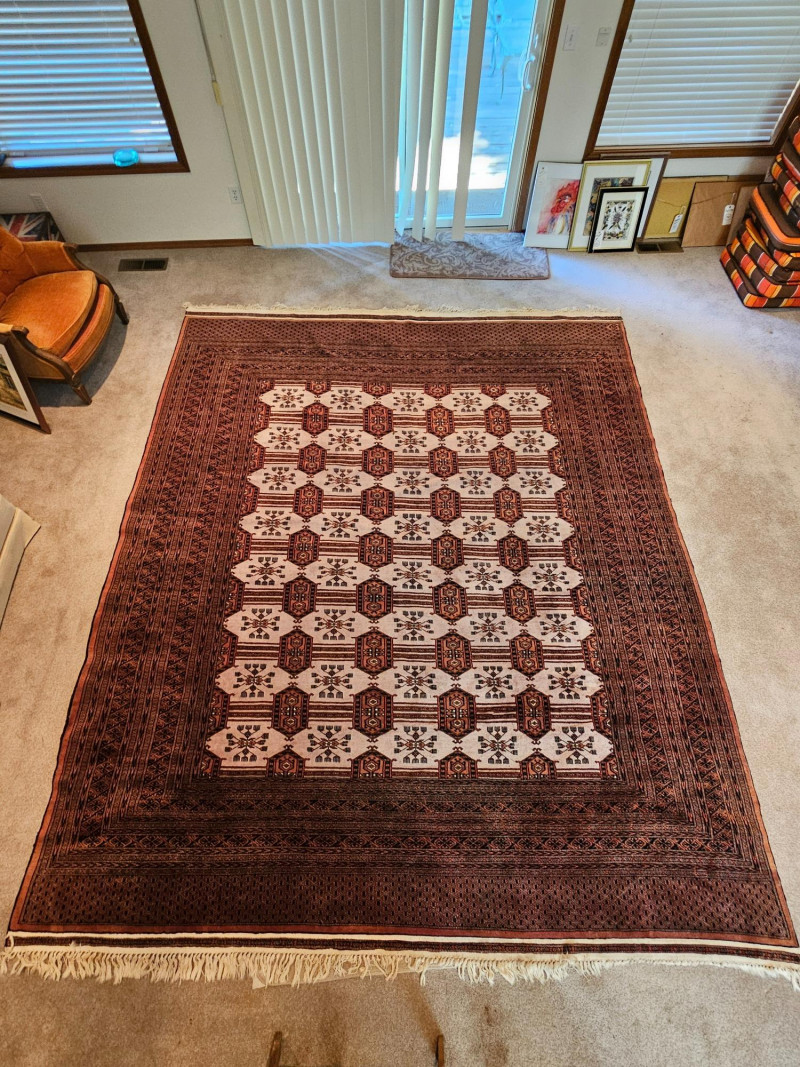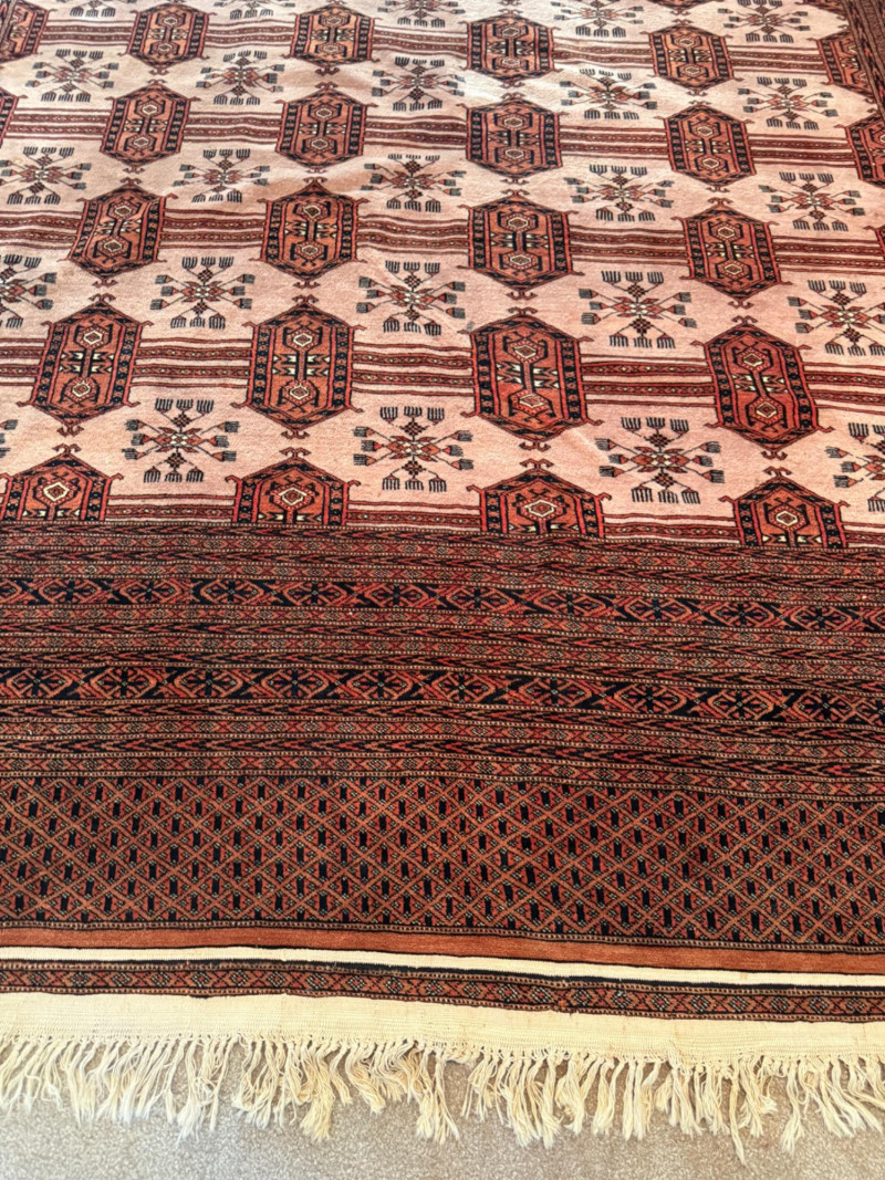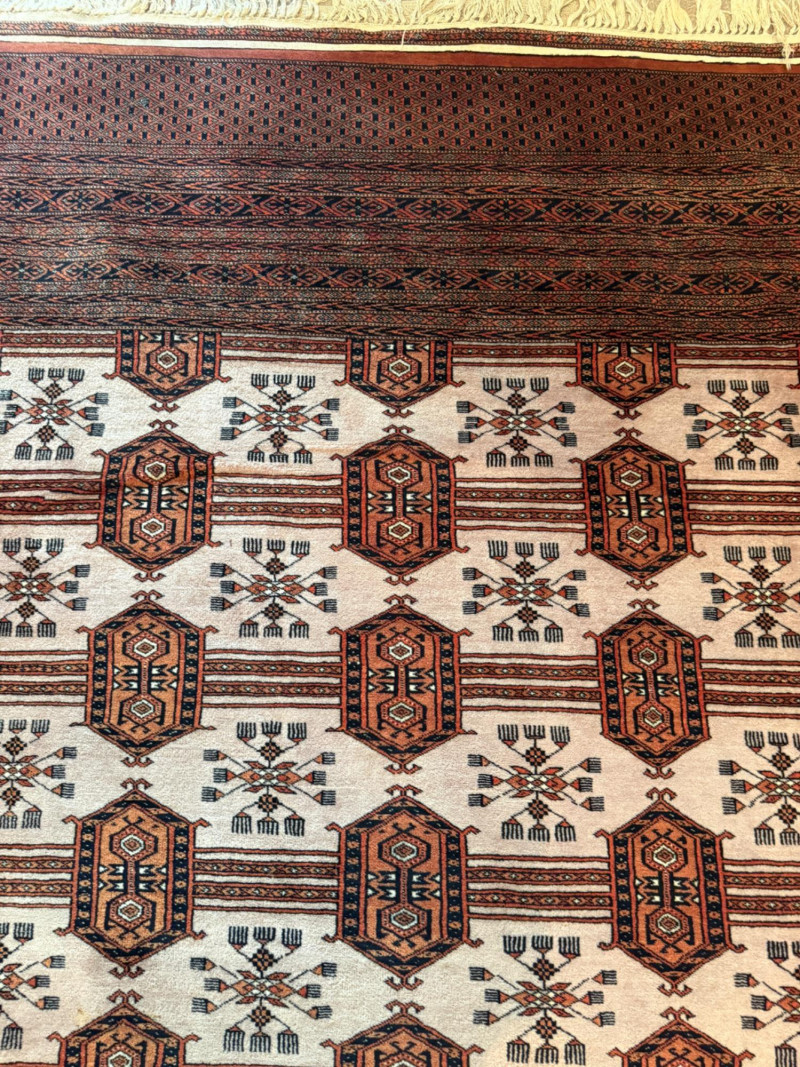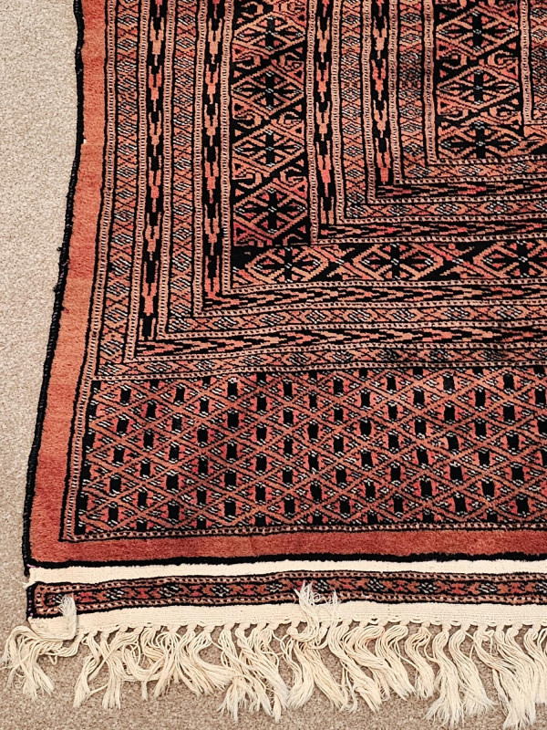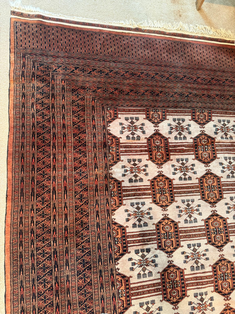 Gorgeous 1980s Pakistani Bukhara Hand-Made Rug Pakistani Bukhara carpets are a type of handmade rug known for their geometric patterns, particularly repeating octagonal designs (gules), and are typically made with a wool pile and cotton foundation. They are inspired by the rugs woven by the Tekke tribe in Turkmenistan and are often found in a rich burgundy red, blue, ivory, or green color. While historically popular, they are less common now, with many being mistaken for more valuable silk or Persian rugs Pakistani Bukhara rugs are known for their shiny appearance, often achieved through a process called mercerization of the cotton foundation Pakistani versions typically have around 200 knots per square inch Appears to be in very nice condition (see pics) This rug is currently valued at $15-$25 per sqft Reserve starting bid of $125 for this item 135" x 113" (107sqft)