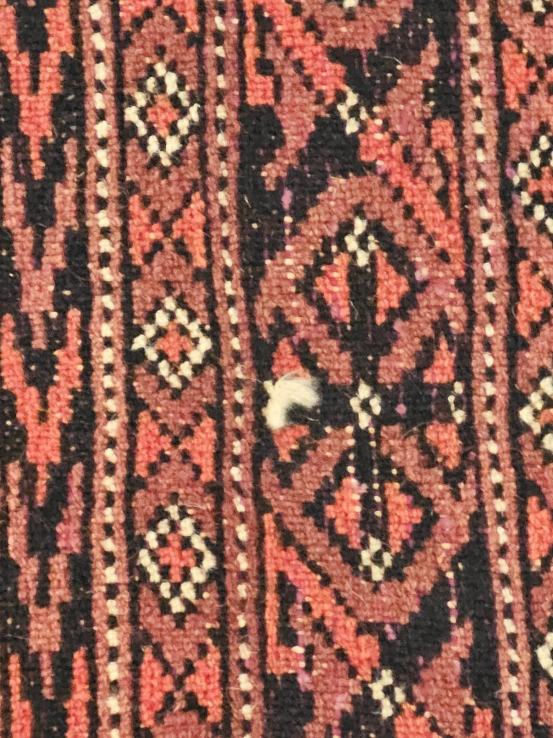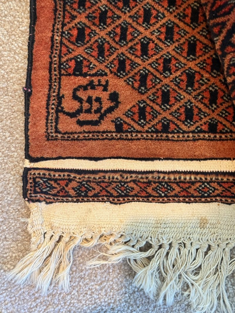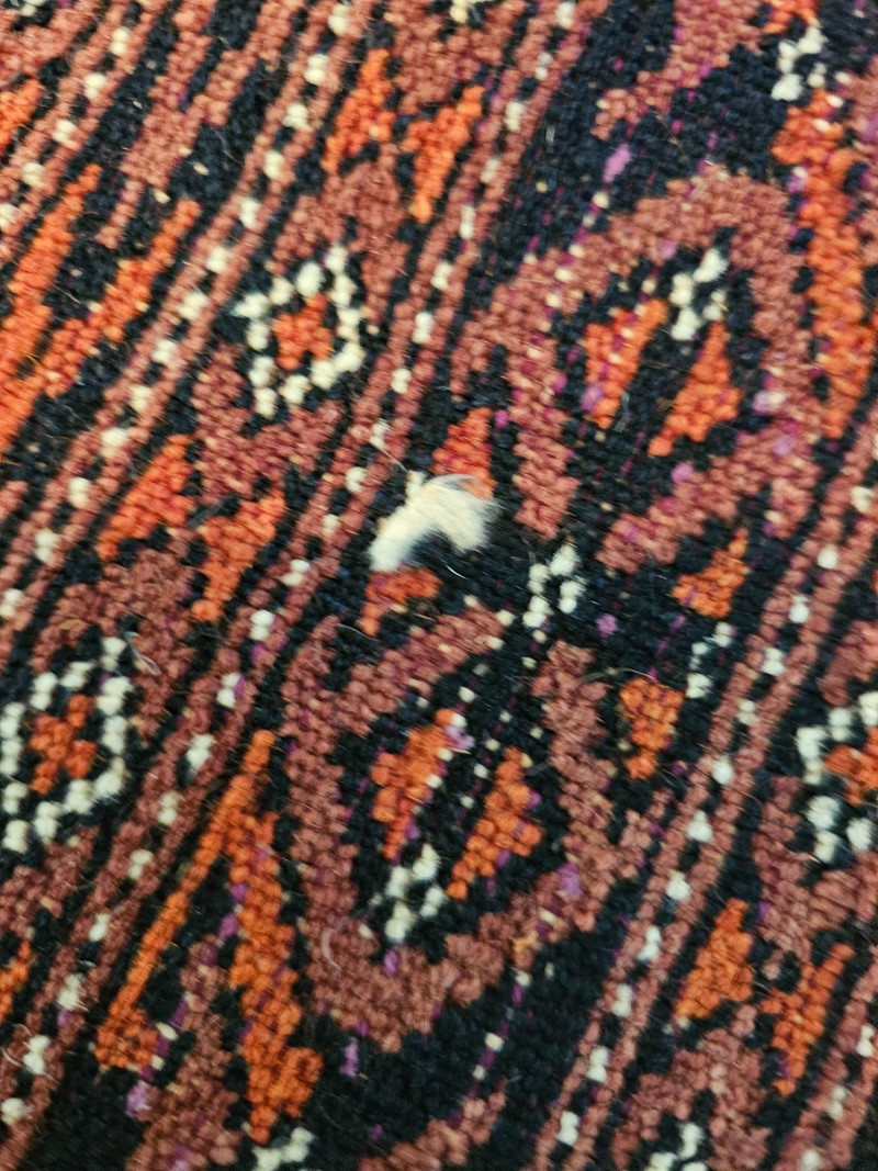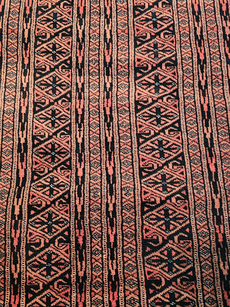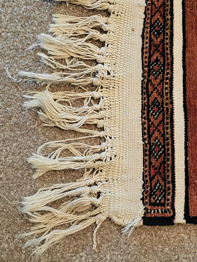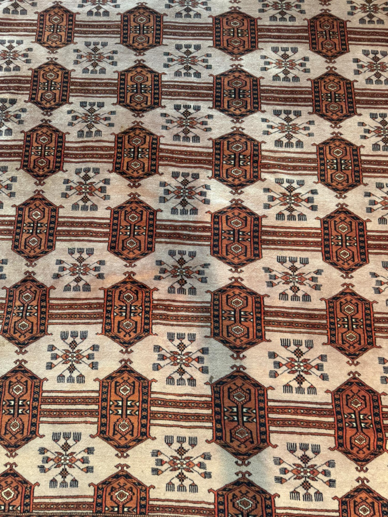 Gorgeous 1980s Pakistani Bukhara Hand-Made Rug Pakistani Bukhara carpets are a type of handmade rug known for their geometric patterns, particularly repeating octagonal designs (gules), and are typically made with a wool pile and cotton foundation. They are inspired by the rugs woven by the Tekke tribe in Turkmenistan and are often found in a rich burgundy red, blue, ivory, or green color. While historically popular, they are less common now, with many being mistaken for more valuable silk or Persian rugs Pakistani Bukhara rugs are known for their shiny appearance, often achieved through a process called mercerization of the cotton foundation Pakistani versions typically have around 200 knots per square inch Appears to be in very nice condition (see pics) This rug is currently valued at $15-$25 per sqft Reserve starting bid of $125 for this item 135" x 113" (107sqft)