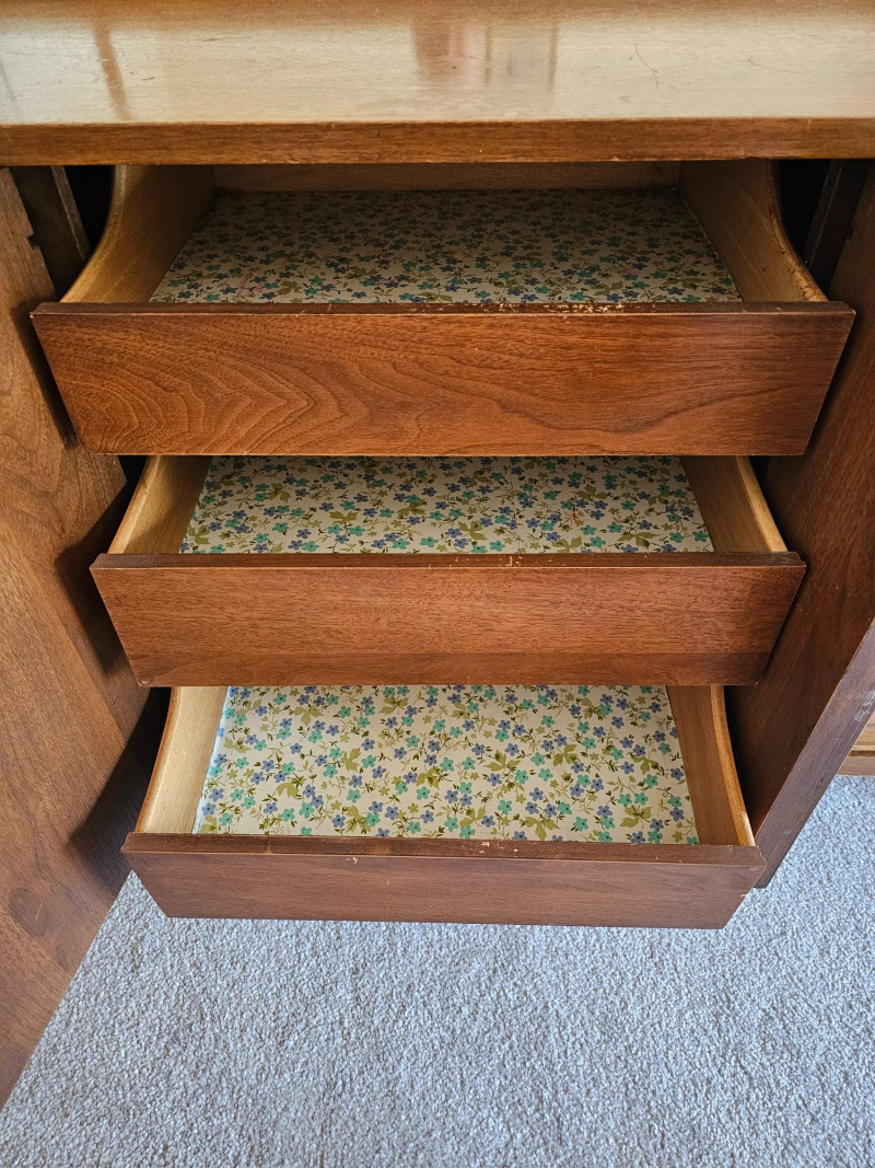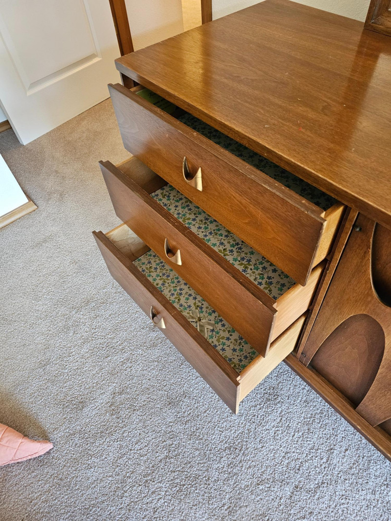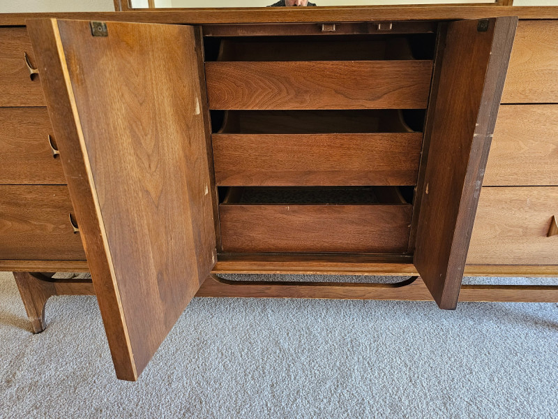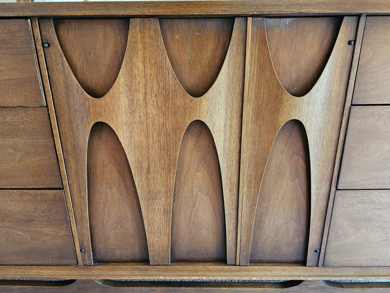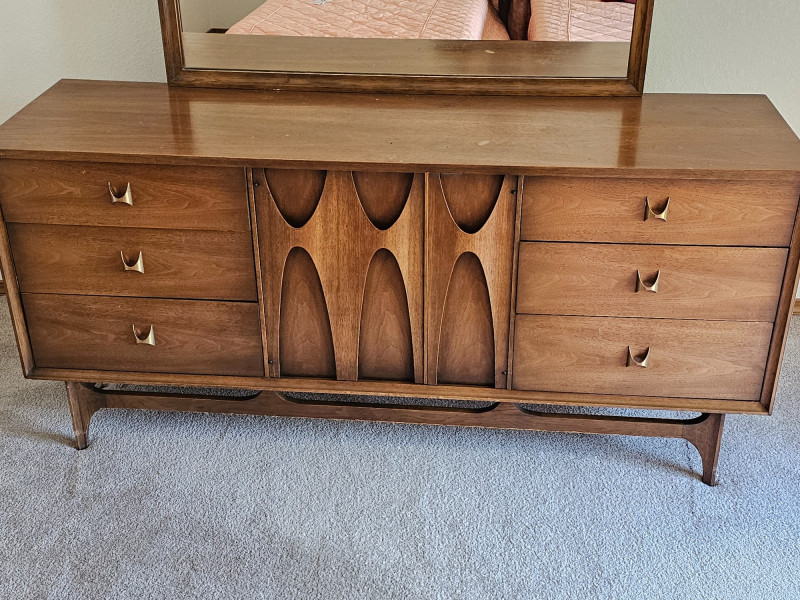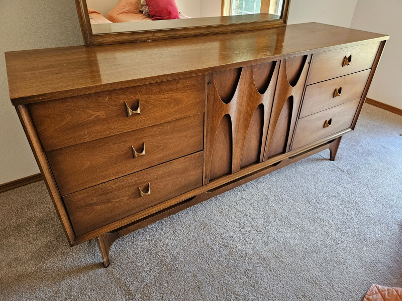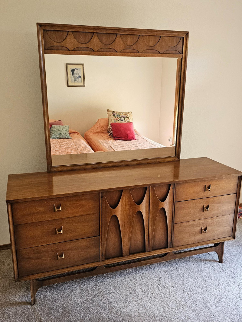 MCM Walnut Lowboy Dresser & Matching Mirror Stunning 1960s Broyhill Brasilia-style design seen in this set of MCM bedroom furniture Amazing and unique lowboy 9-drawer dresser 30"T x 66"W x 19"D Matching mirror can connect to back of lowboy (as shown in pictures) or be wall hung separately 40.25"T x 44.25"W 1.25"D In good used condition (see pics) This design is currently extremely popular among MCM furniture collectors See the matching king headboard & nightstands in Lot #1!