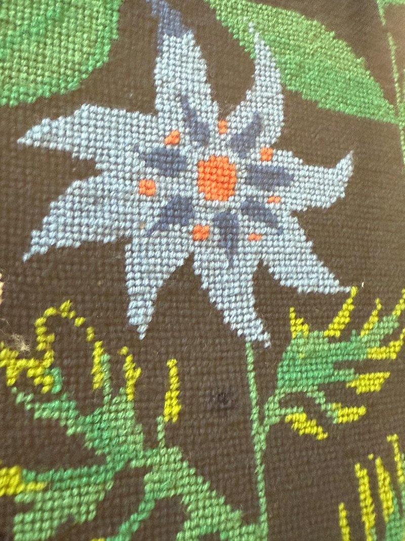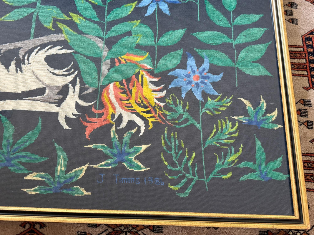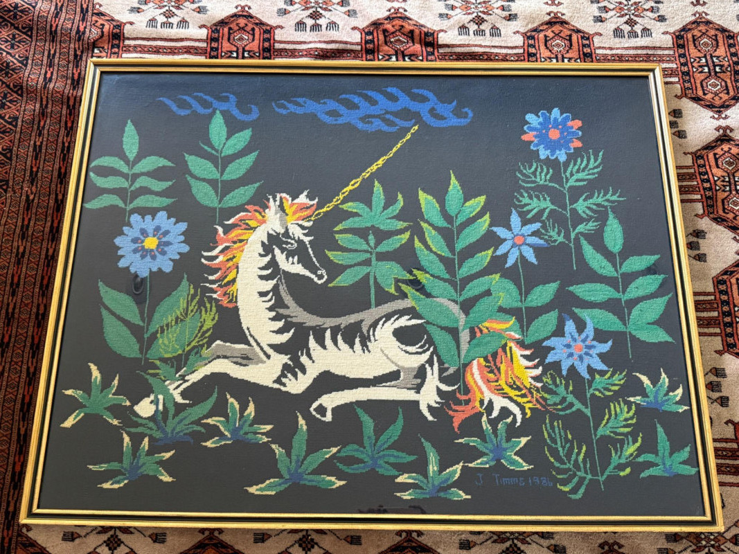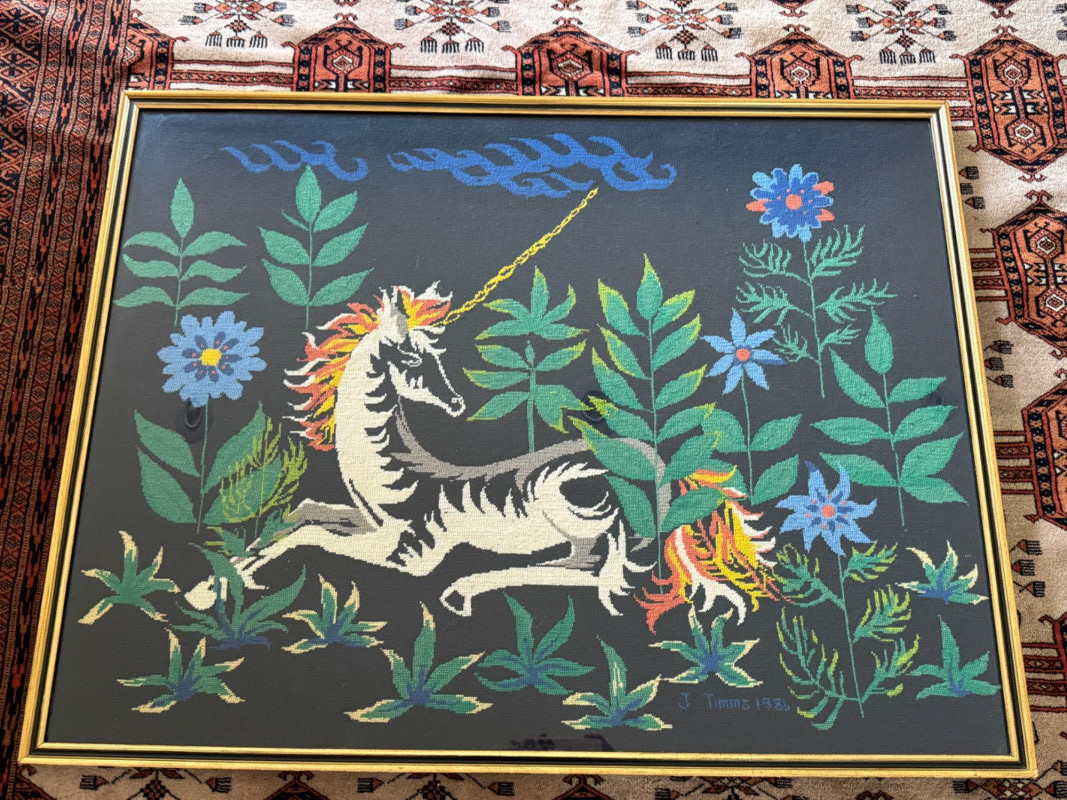 Massive Framed Handmade Unicorn Needlepoint Imagine the hours of hard work it took to hand create this impressive needlepoint! A mythical unicorn resting among plants and flowers Professionally framed under glass. Frame has a small chip. See pics. Beautiful fantasy artwork! 37.5"T x 49"W x 1"D This item has a starting reserve bid of $75