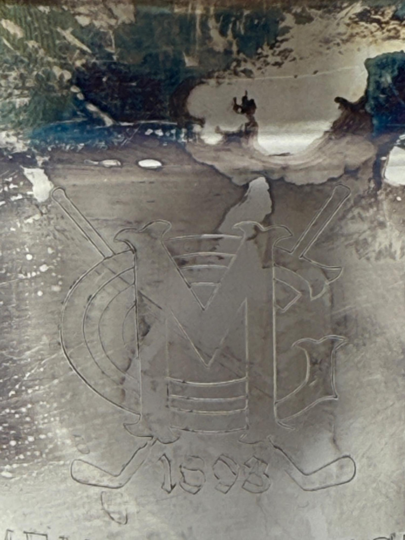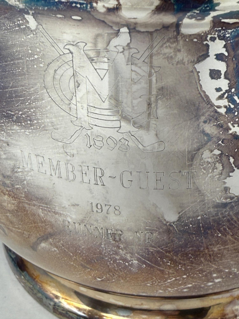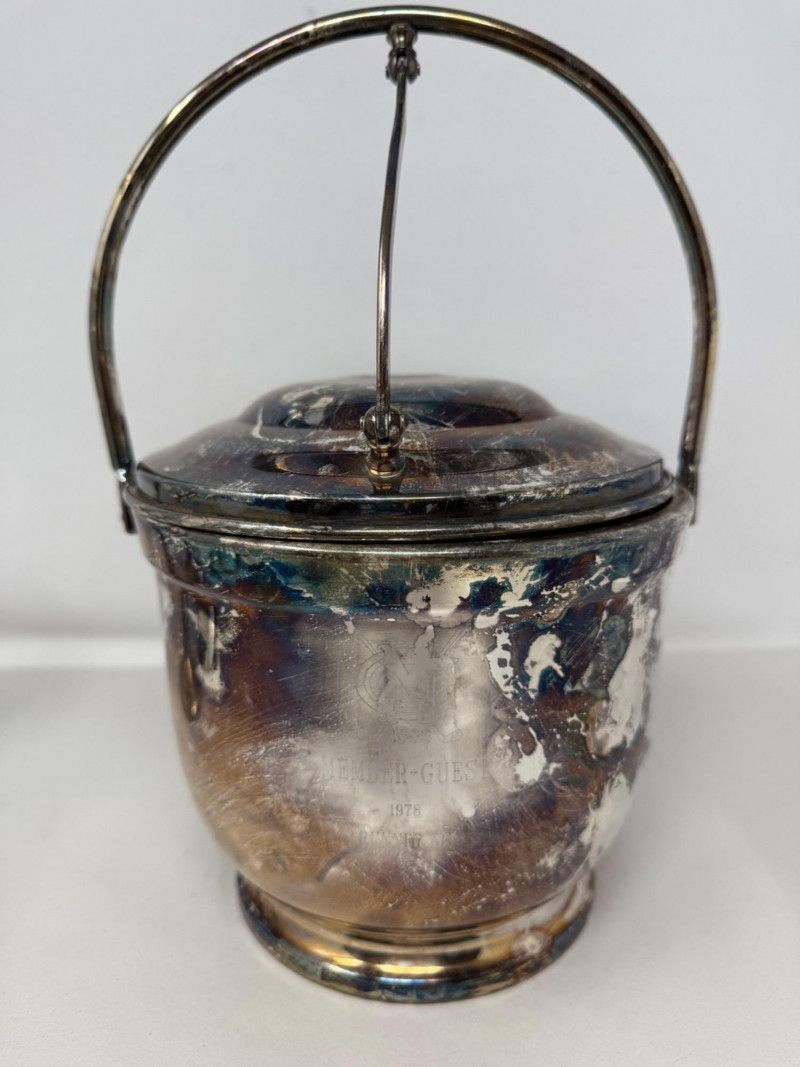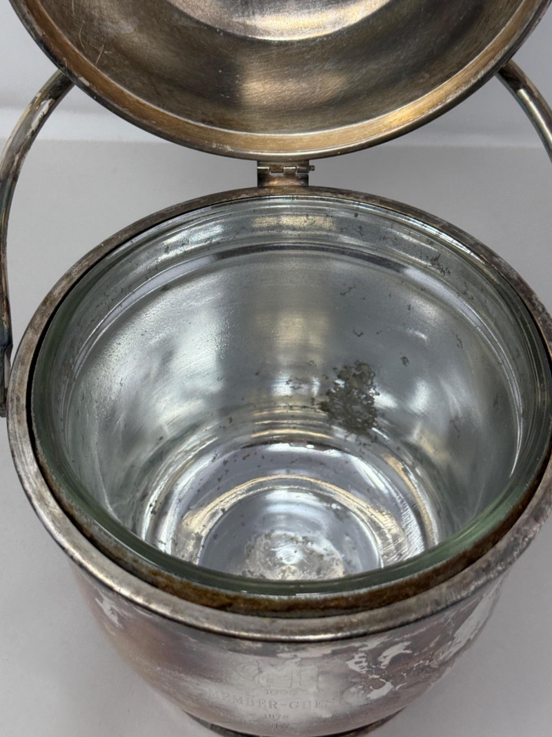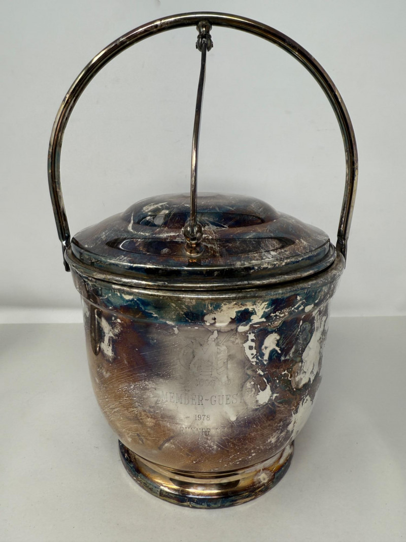 Engraved with MG 1803 Member-Guest 1978 Runner Up. When handle is moved, the lid opens for one hand ice grabbing.
