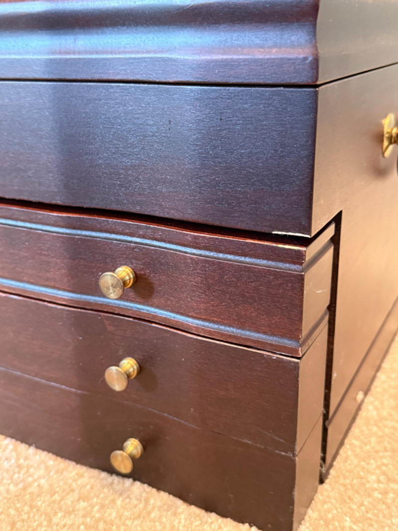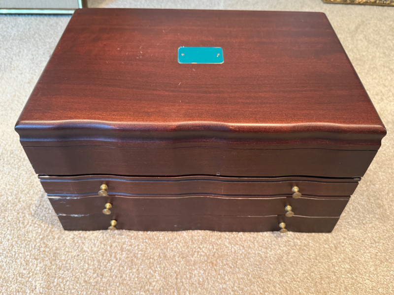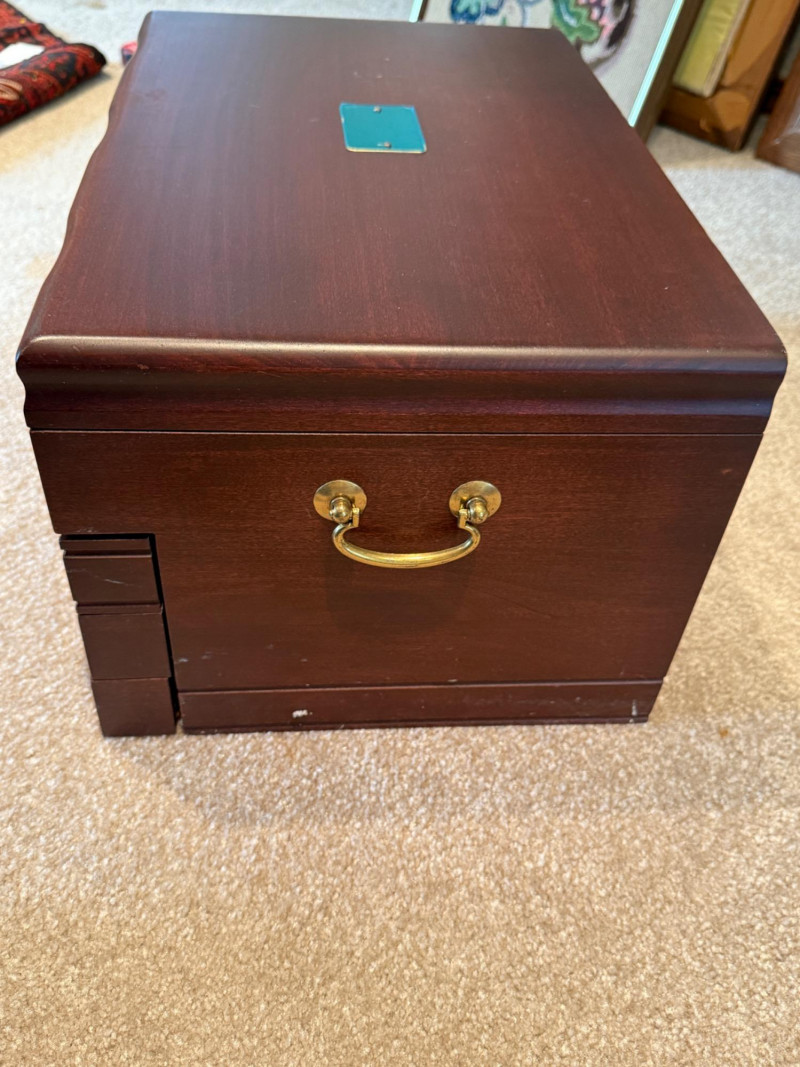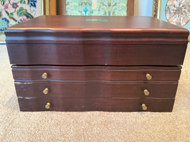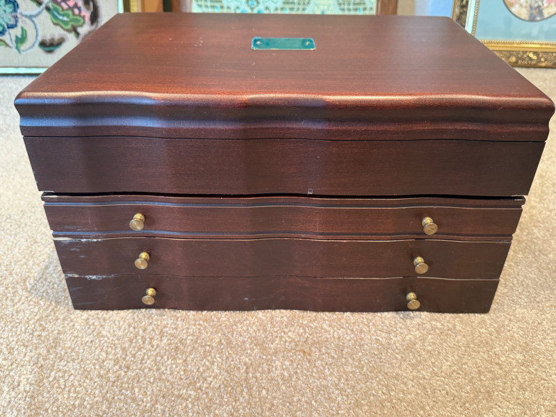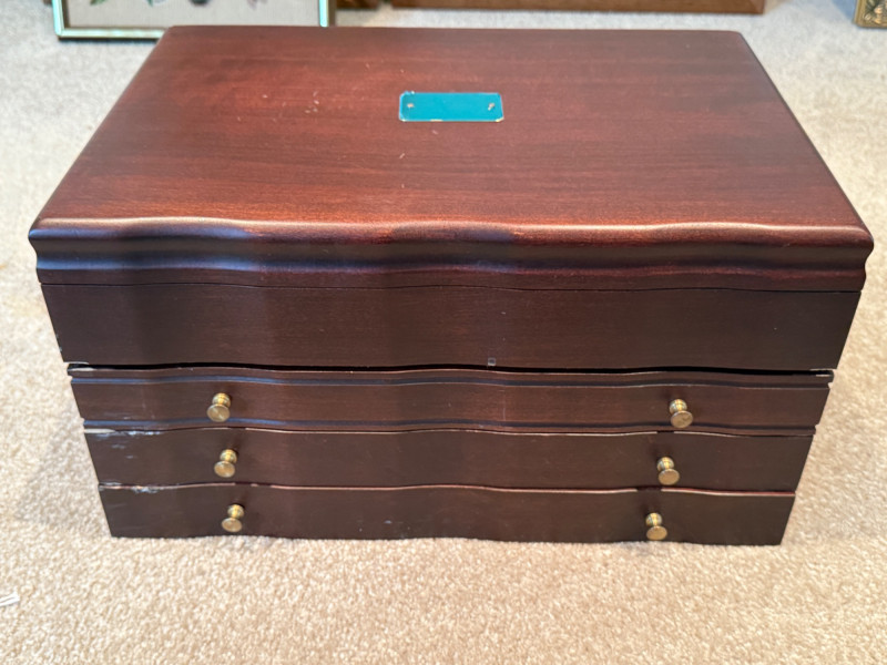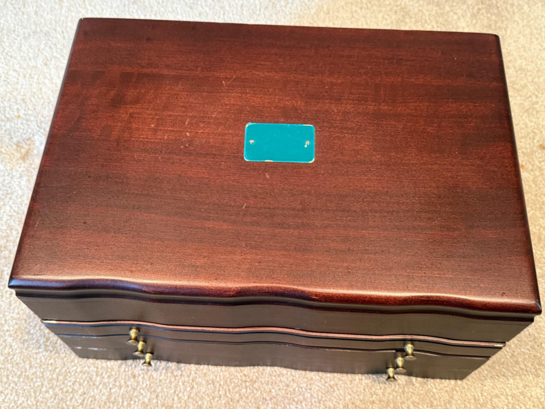 3 Drawer Velvet Lined Mahogany Jewelry Chest 17x11.5x9.5” Eureka Mfg Co.a division of Reed & Barton Silversmiths. Engravable plate on top that has protective green sticker.