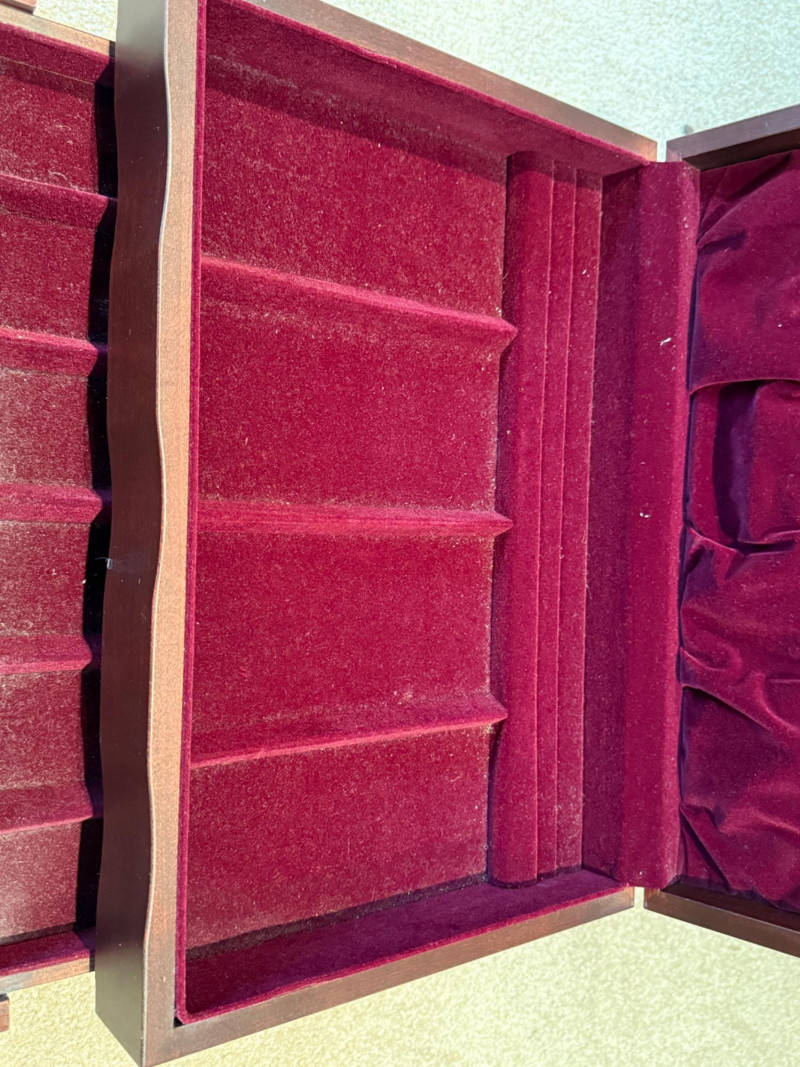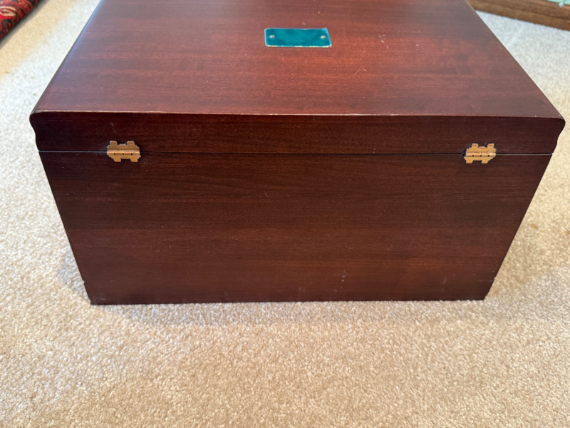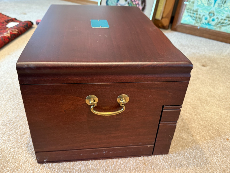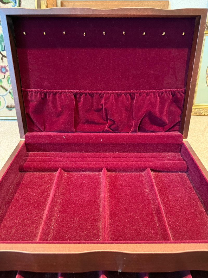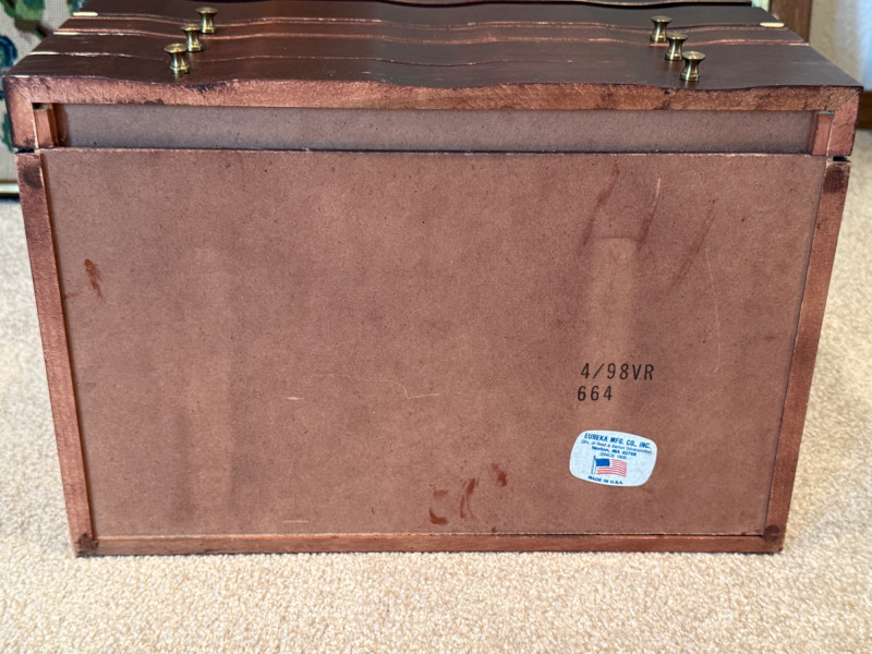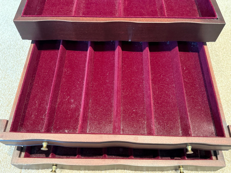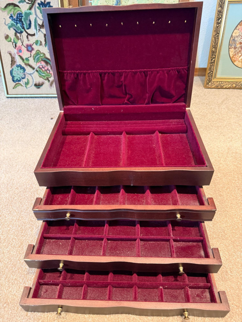 3 Drawer Velvet Lined Mahogany Jewelry Chest 17x11.5x9.5” Eureka Mfg Co.a division of Reed & Barton Silversmiths. Engravable plate on top that has protective green sticker.