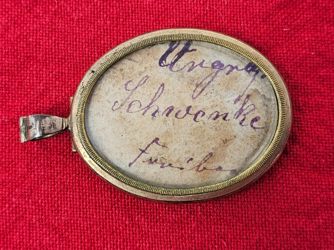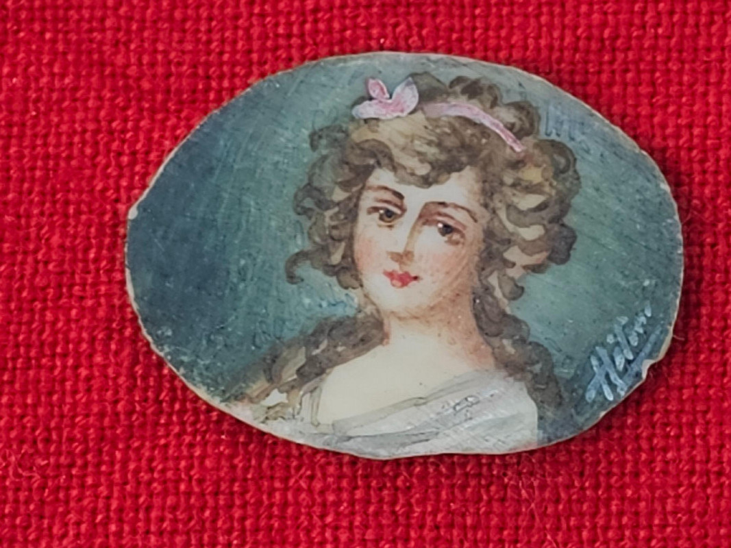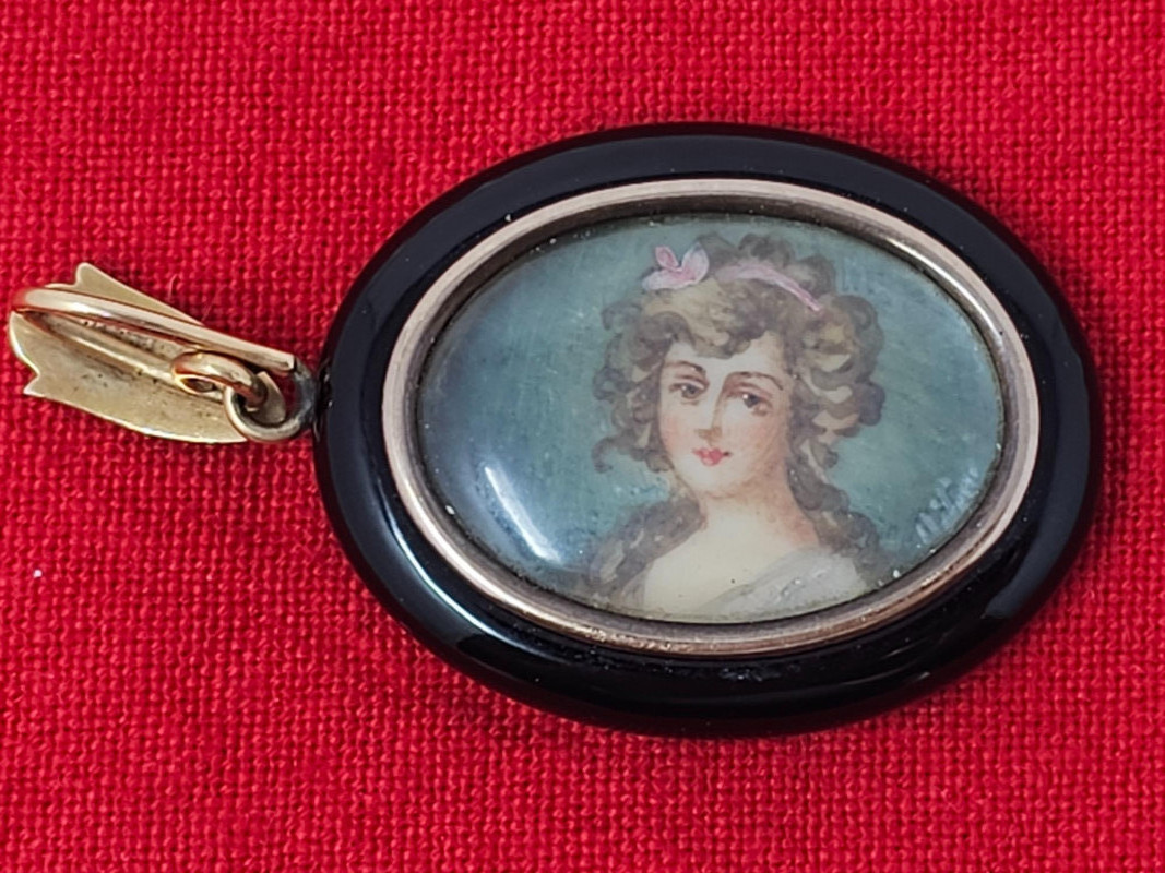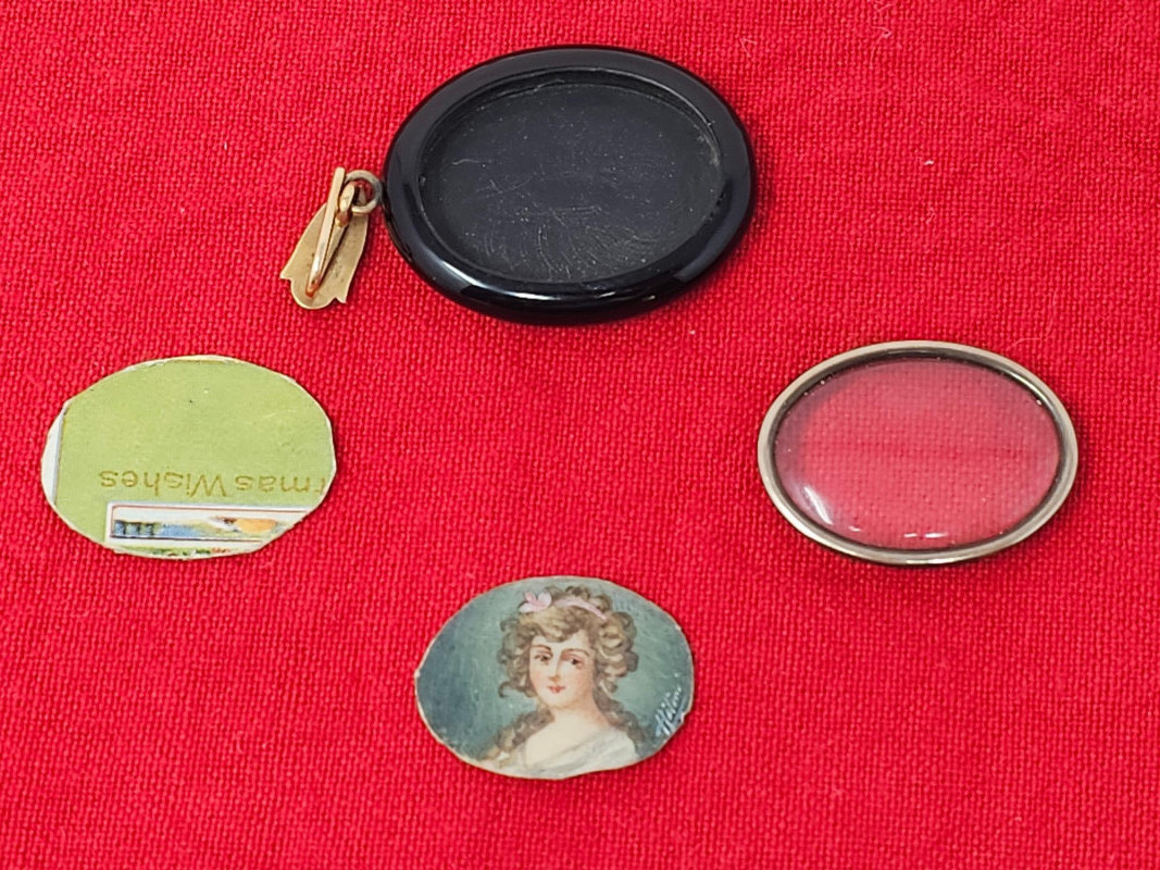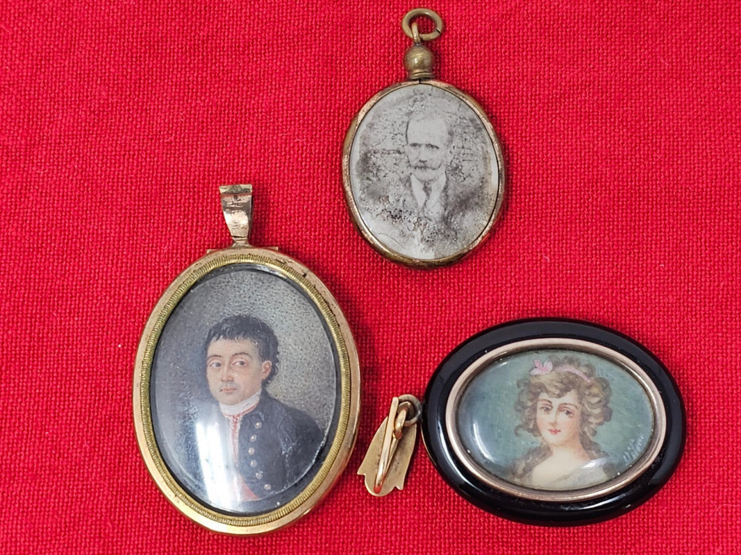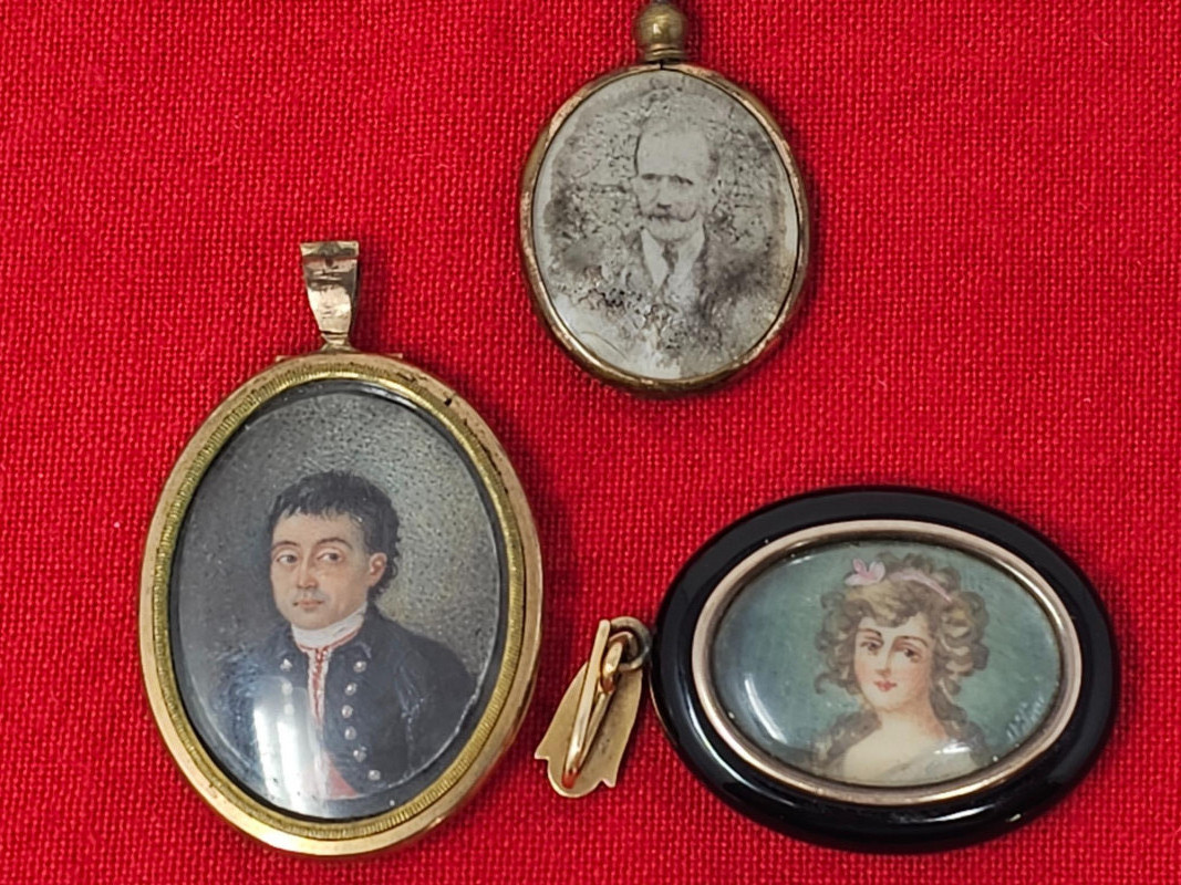 (2) Antique Portrait Pendants The larger double-sided pendant is a locket and includes the miniature painting portait of a gentleman wearing possibly a military-style uniform The reverse side appears to be a hand-written name, looks like "Ungran Schwenke Freiben". Possibly the name of the subject of the miniature portait or the artist. The smaller double-sided pendant does not open, and appears to have a gentleman with a handlebar mustache on one side and possibly his wife on the other. The photos inside appear to be quite old. The rim of the smaller pendant has the words "ROLLED GOLD" stamped. Rolled gold is a jewelry material made by bonding a thin layer of gold to a base metal, usually brass or copper. Black pendant appears to be a miniature portait of a Victorian woman. The portait is signed (possibly "Hiline" ot "Hilini"). The pendant opens to reveal the woman and a backer or filler piece from a book or magazine. Larget pendant is 2"T x 1.25"W Smaller pendant is 1.5"T x 1"W Black pendant is 2"T x 1.2"W