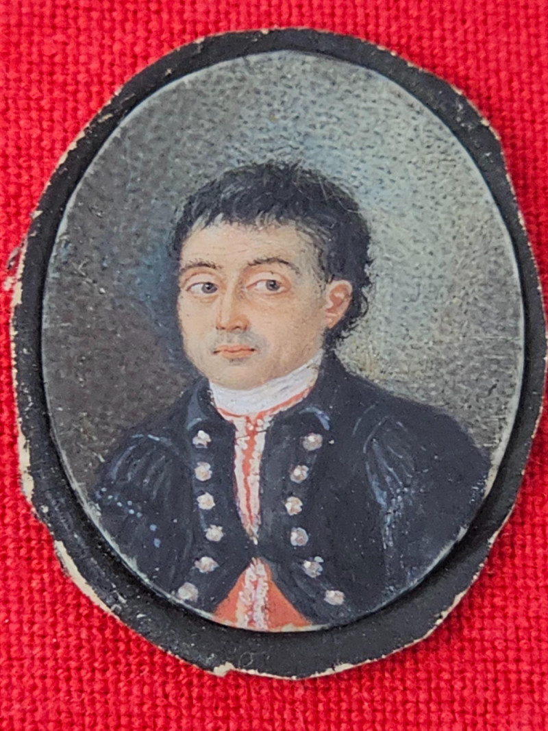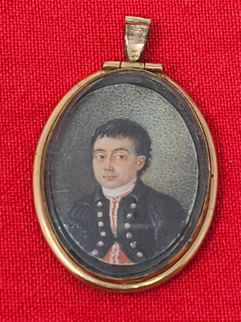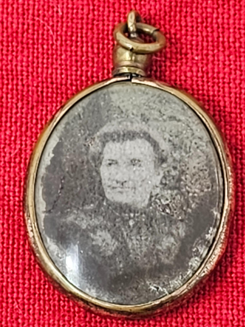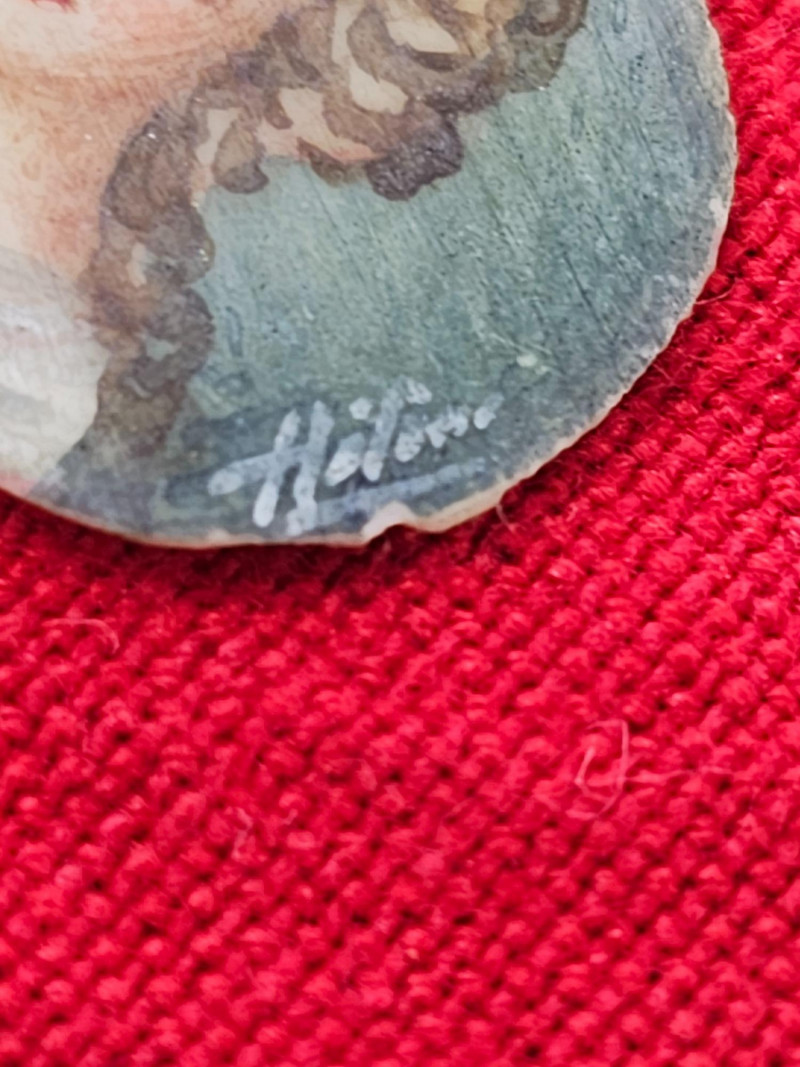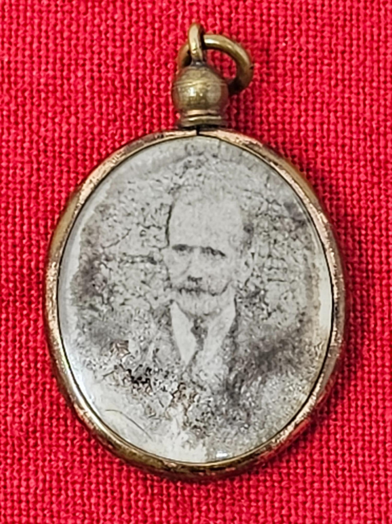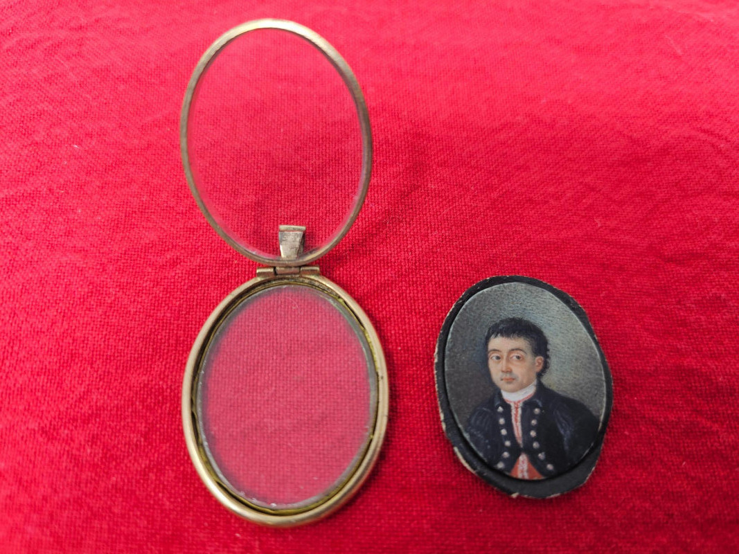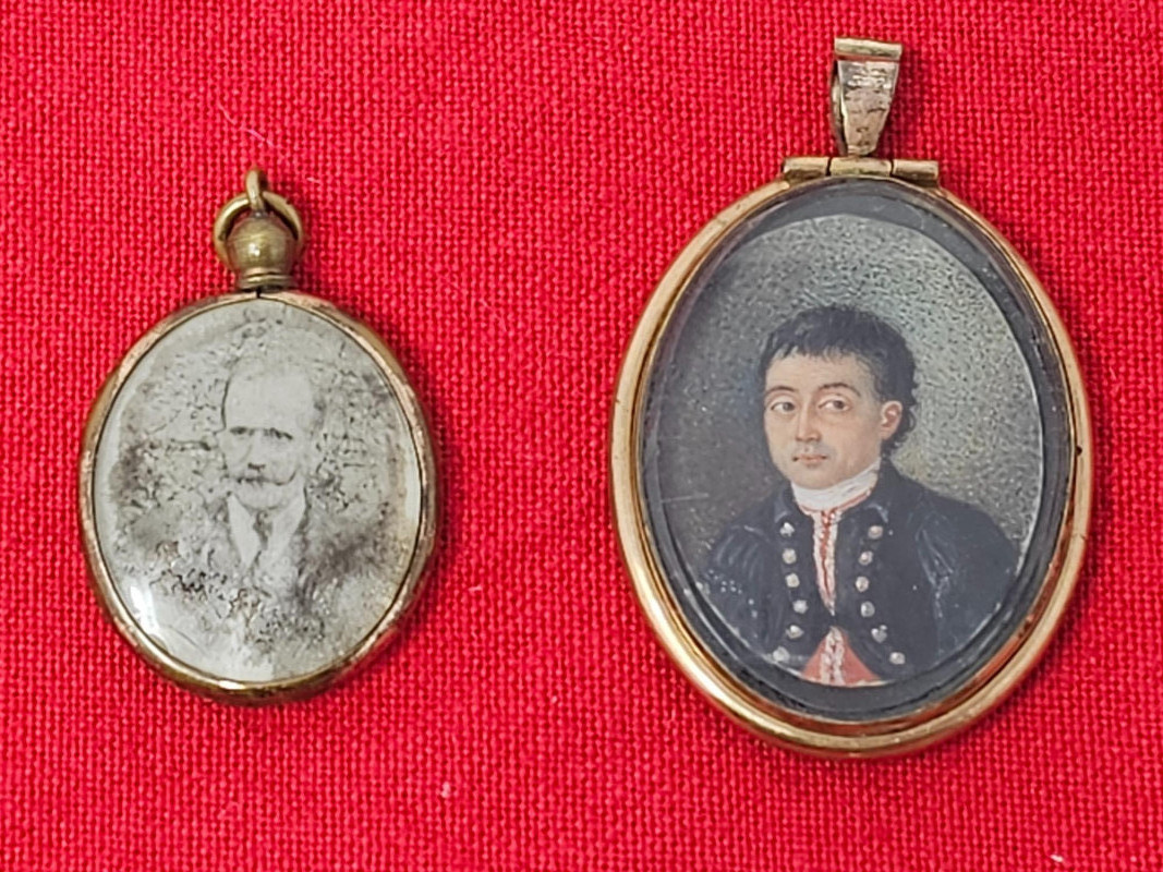 (2) Antique Portrait Pendants The larger double-sided pendant is a locket and includes the miniature painting portait of a gentleman wearing possibly a military-style uniform The reverse side appears to be a hand-written name, looks like "Ungran Schwenke Freiben". Possibly the name of the subject of the miniature portait or the artist. The smaller double-sided pendant does not open, and appears to have a gentleman with a handlebar mustache on one side and possibly his wife on the other. The photos inside appear to be quite old. The rim of the smaller pendant has the words "ROLLED GOLD" stamped. Rolled gold is a jewelry material made by bonding a thin layer of gold to a base metal, usually brass or copper. Black pendant appears to be a miniature portait of a Victorian woman. The portait is signed (possibly "Hiline" ot "Hilini"). The pendant opens to reveal the woman and a backer or filler piece from a book or magazine. Larget pendant is 2"T x 1.25"W Smaller pendant is 1.5"T x 1"W Black pendant is 2"T x 1.2"W