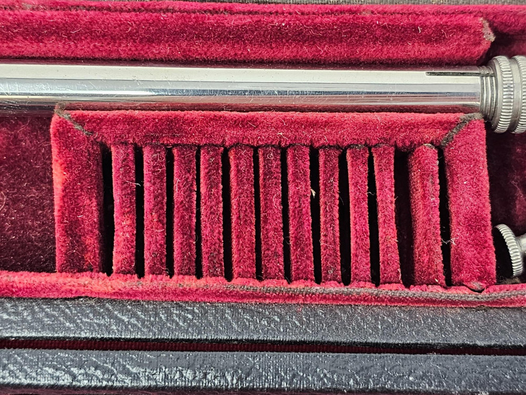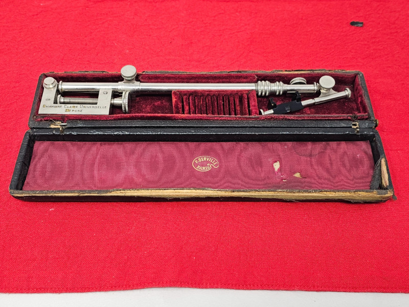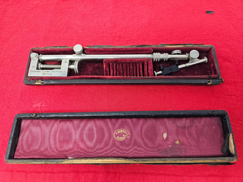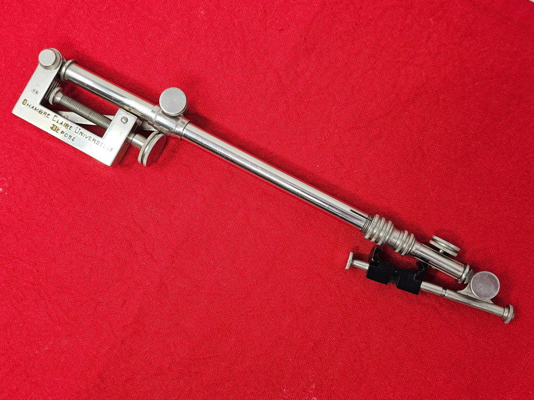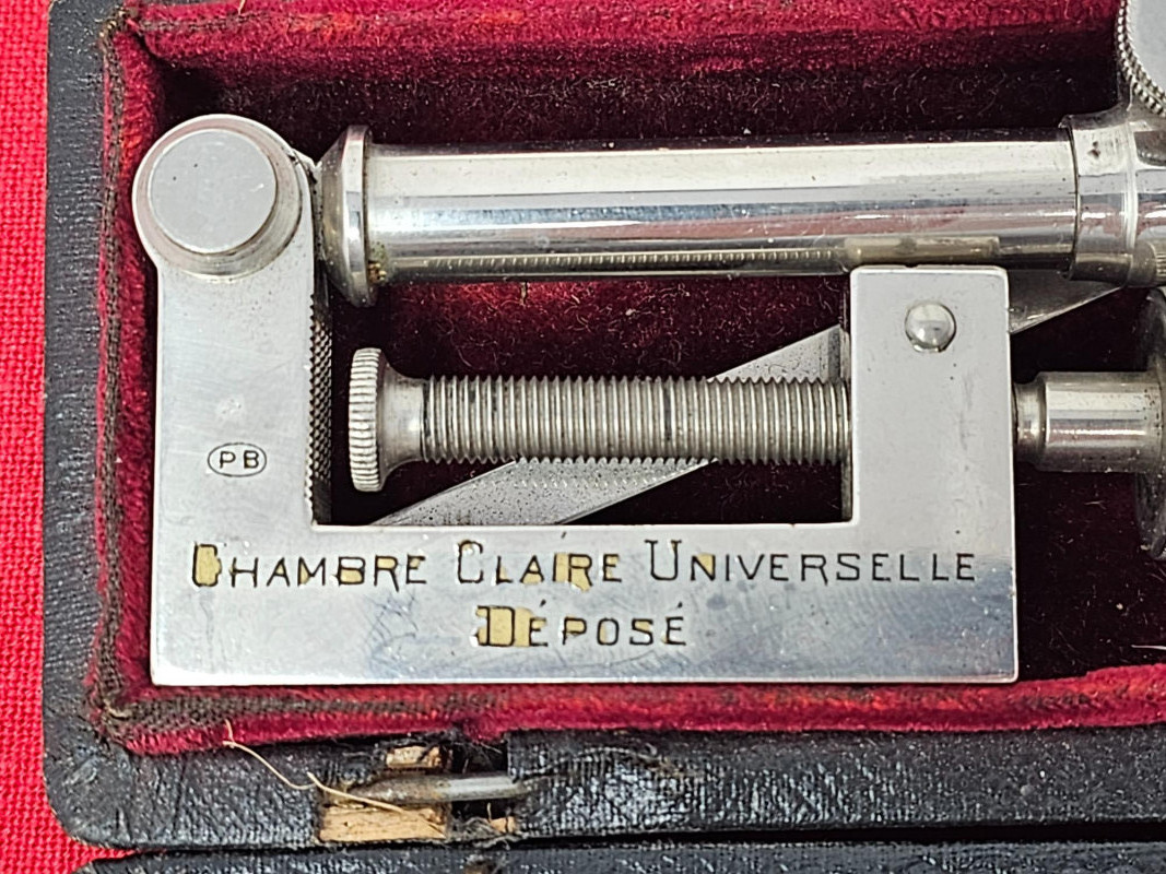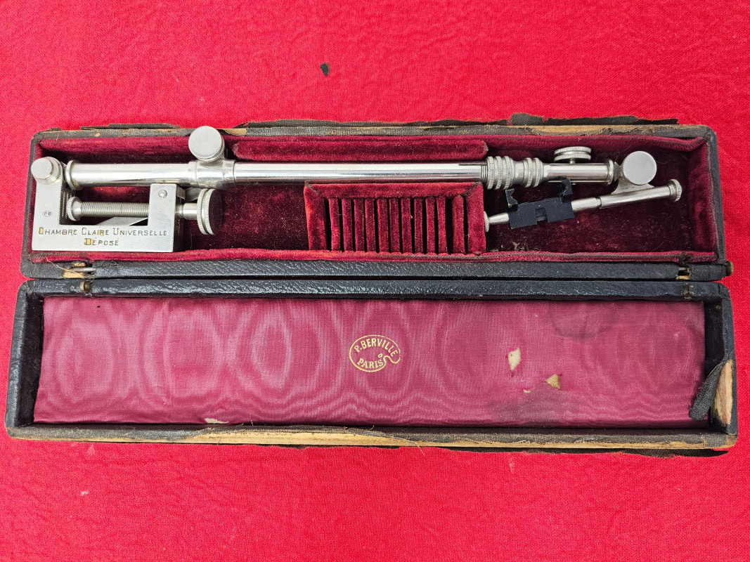 Chambre Claire Universelle Camera Lucida Chambre Claire Universelle camera lucidas were made by P. Berville in Paris A camera lucida is an optical instrument used as a drawing aid. It allows an artist or microscopist to see both the subject and the drawing surface simultaneously, making it easier to accurately trace outlines and render perspective. It works by using a prism or mirrors to superimpose an image of the subject onto the drawing surface It comes in a fitted case, likely for storage and transport The lenses are missing and the box hinges are broken. Fitted case coating is flaking badly Camera Lucinda: 10"L x 2"W Case 11"L x 2.5"W