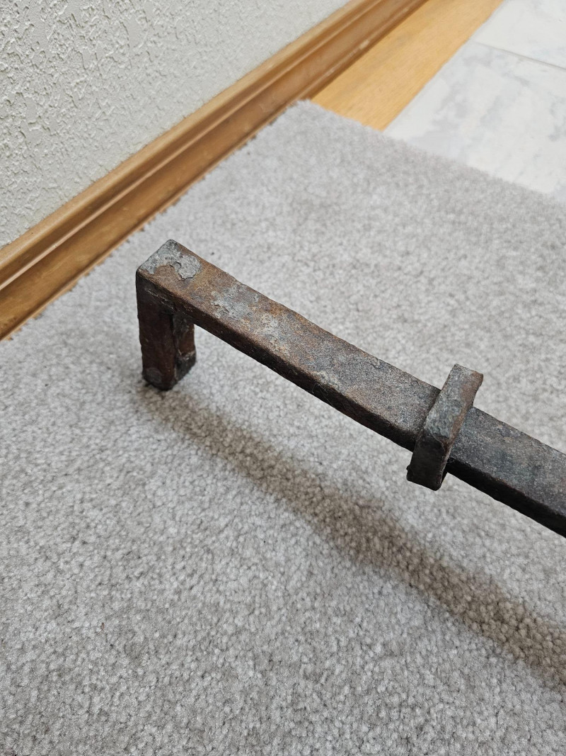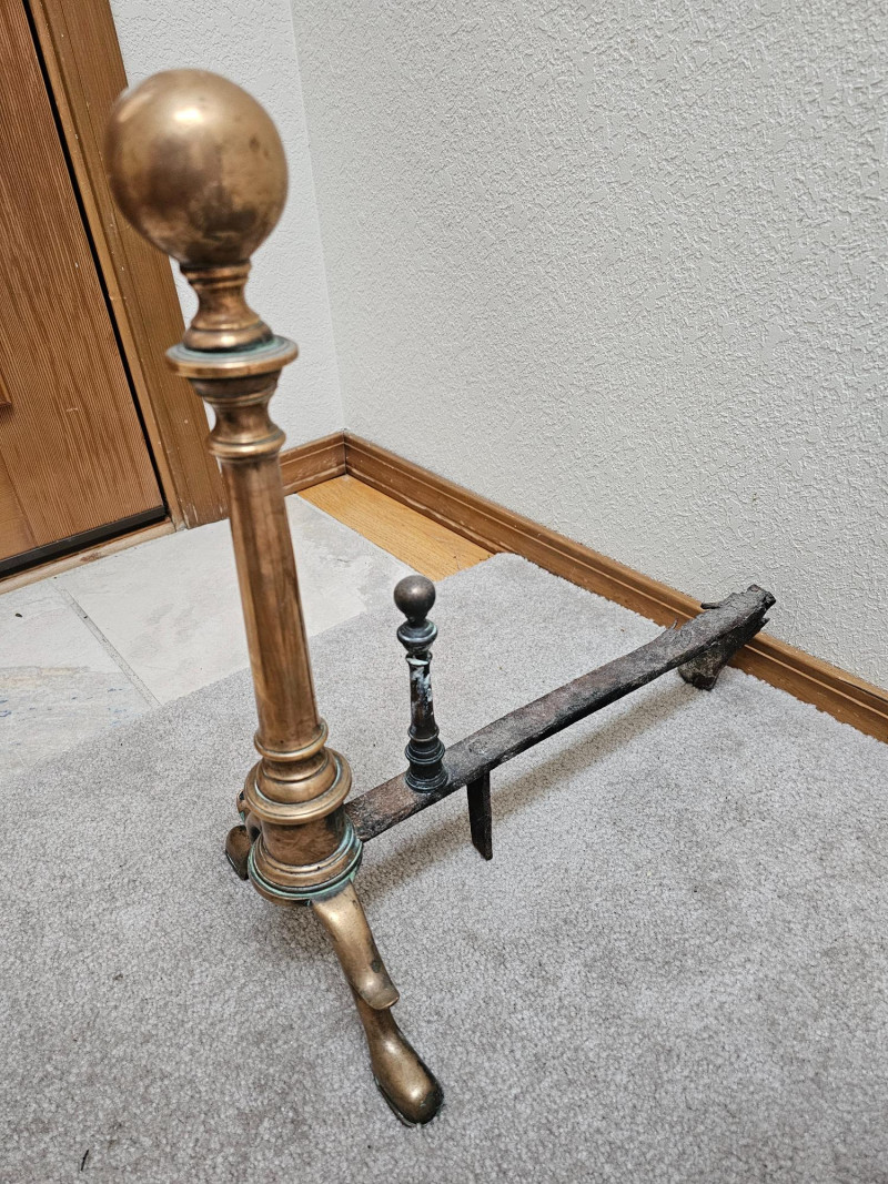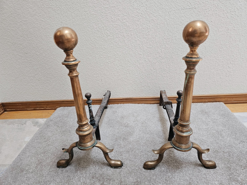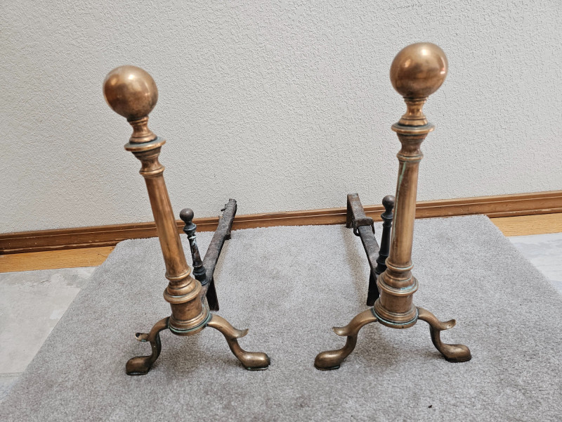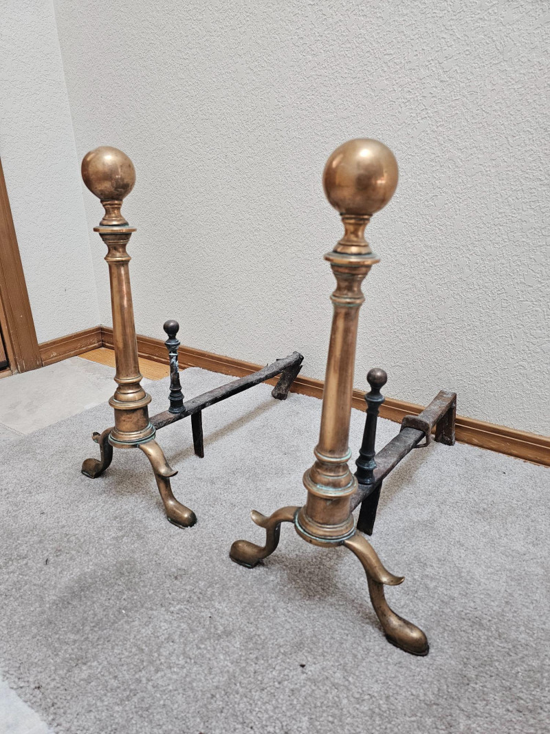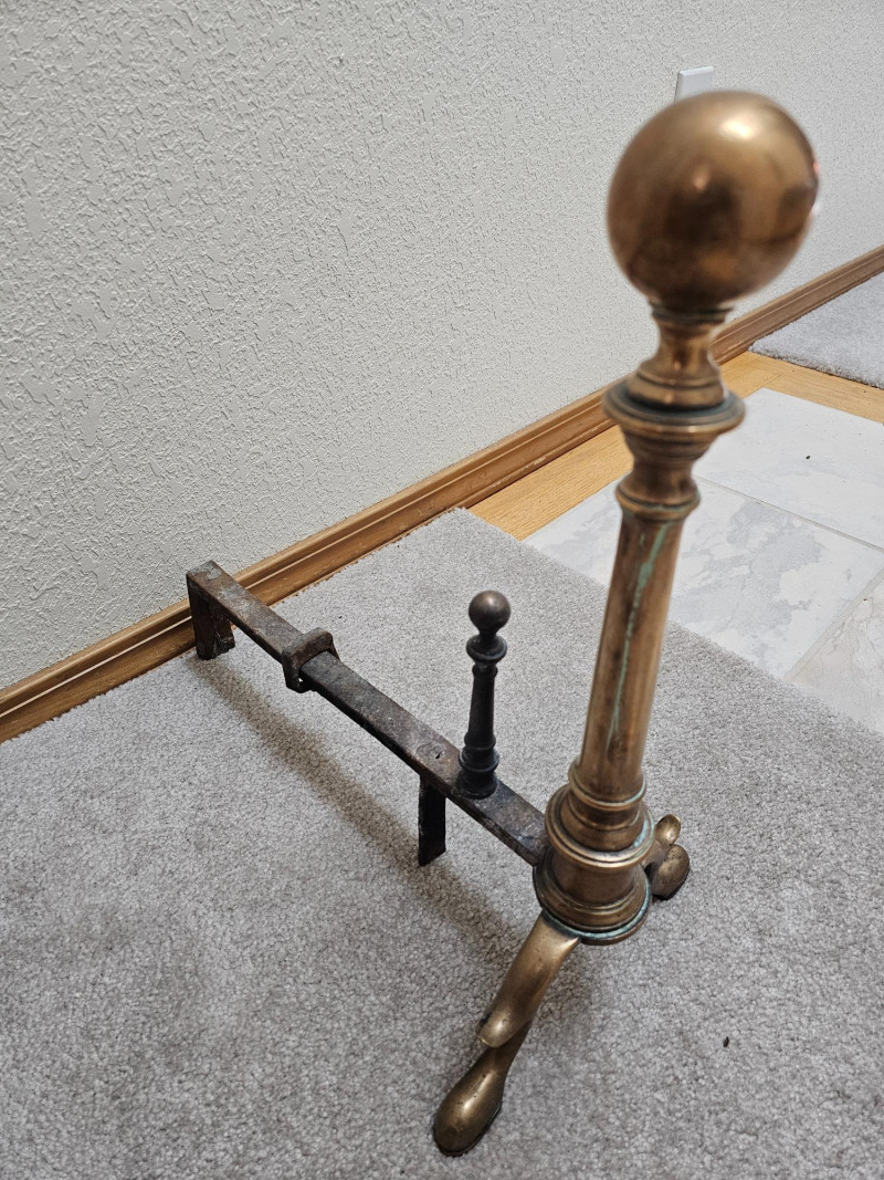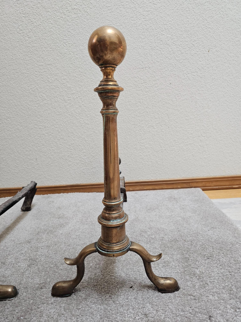 Pair Of Antique Brass & Iron Andirons Appear to be Colonial or Federal style having a candlestick design with large tapered finials, cabriole legs, and slipper feet Also known as "firedogs" The bullet or log supports are made.of Iron and show some wear. One of the andiron iron log supports shows some damage on the back foot (see pics for condition) Andirons became popular in the early to mid 1800s and used as a metal support in a fireplace to hold logs above the hearth, allowing air to circulate for better burning 18"T x 9.5"W x 16"L