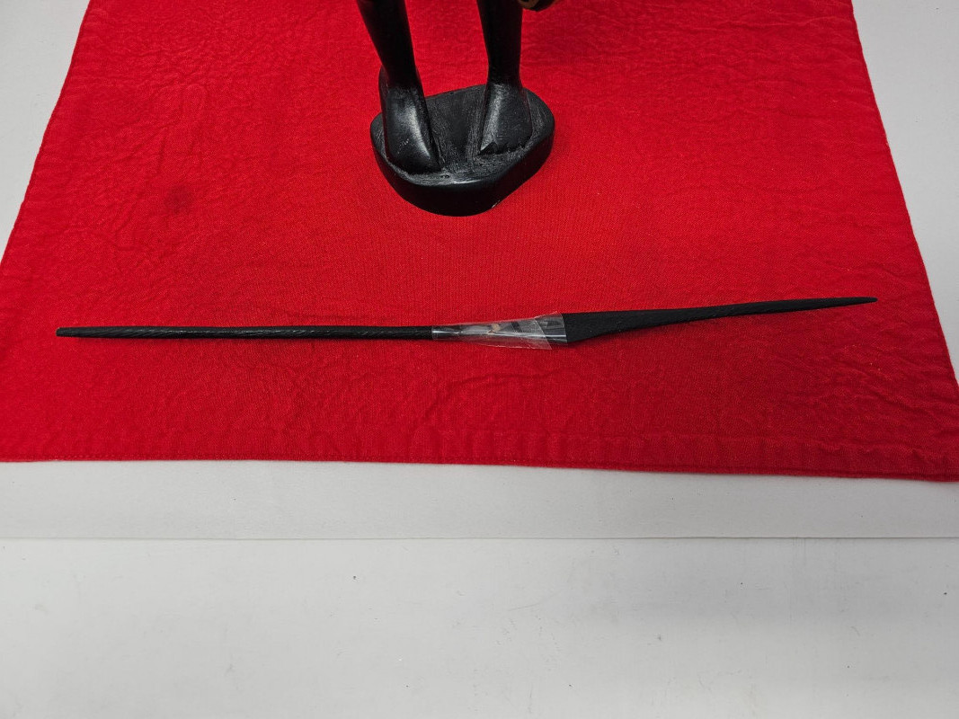 Vintage African Hand Carved Traditional Warrior Wood Sculpture The figure depicts a hand-carved wooden sculpture of an African warrior holding a shield and spear The figure is masculine, with detailed carving of the face and body. The shield is painted with what appears to be a leopard-like print and black stripes These types of sculptures are often associated with the native tribes in Kenya, known for their elaborate wood carvings, particularly from ebony wood Warrior sculpture is in very nice condition. The warrior's spear has been broken and repaired with tape (see pics for condition) 14.5"T x 5.5"W x 7"D