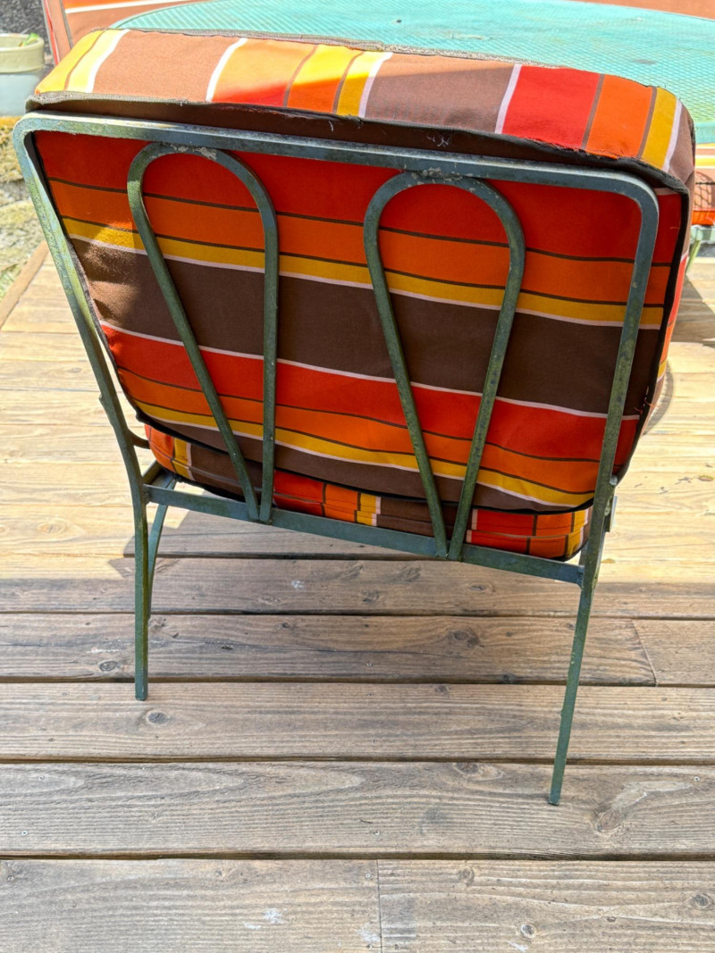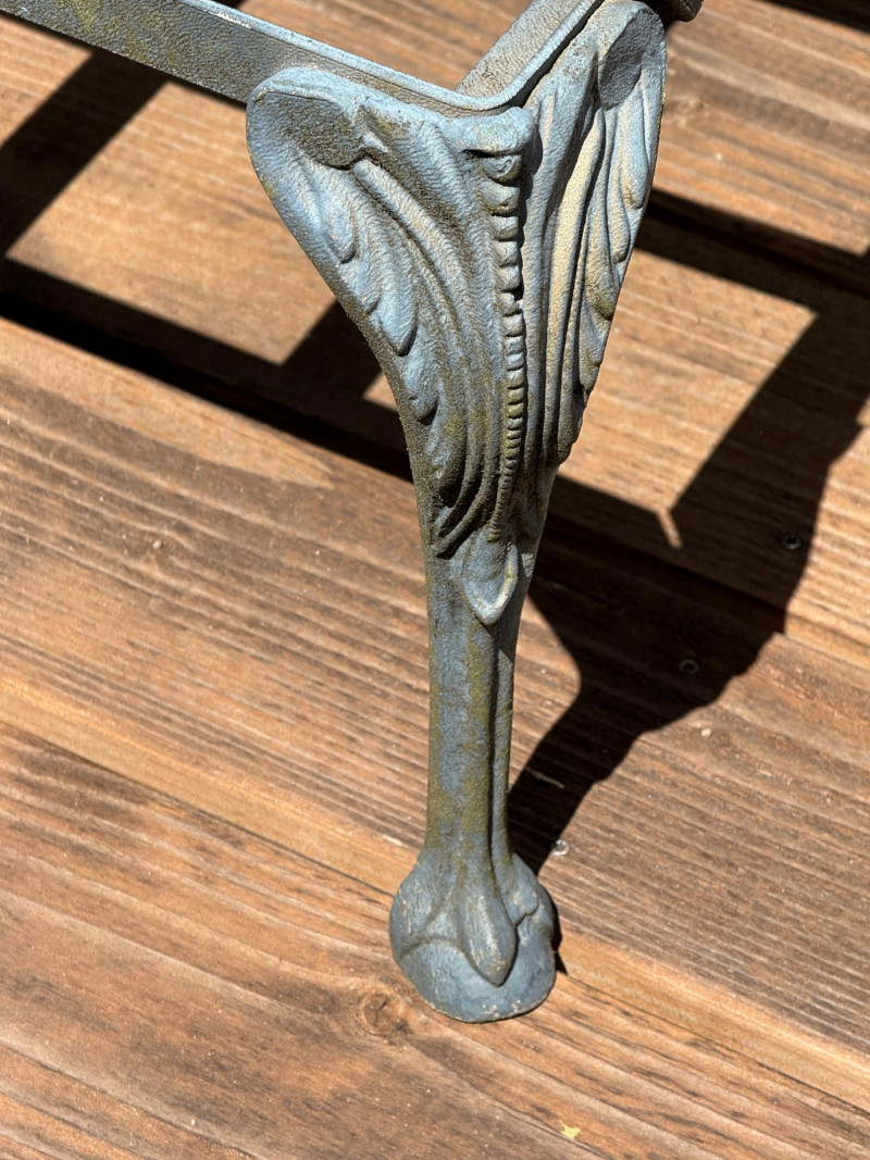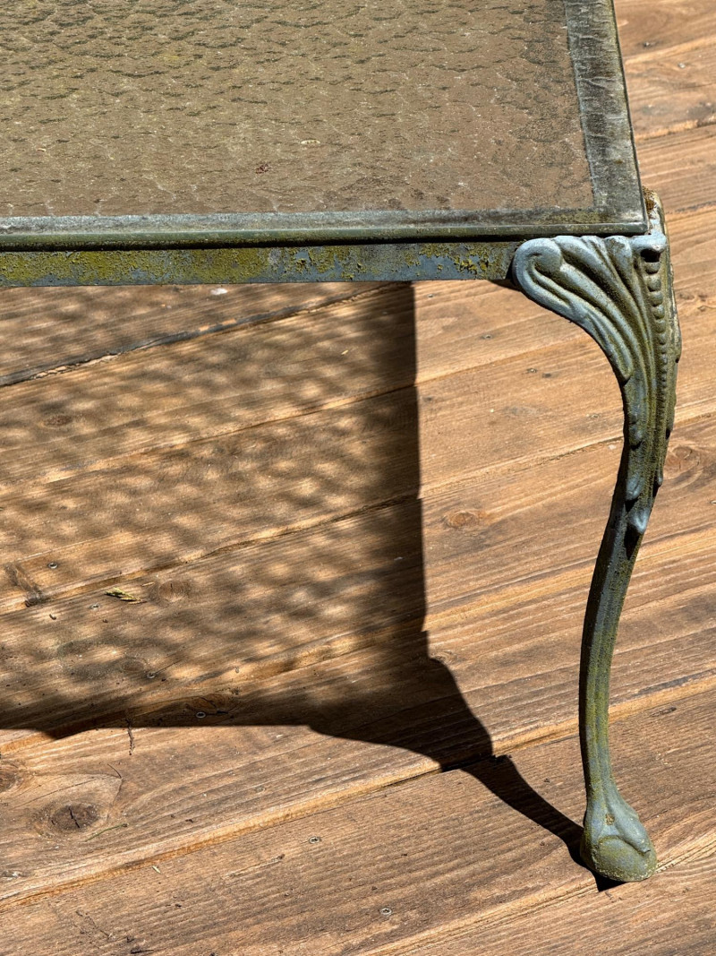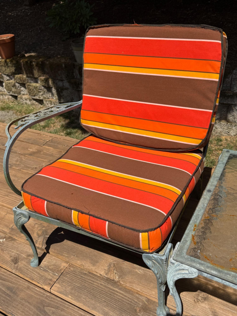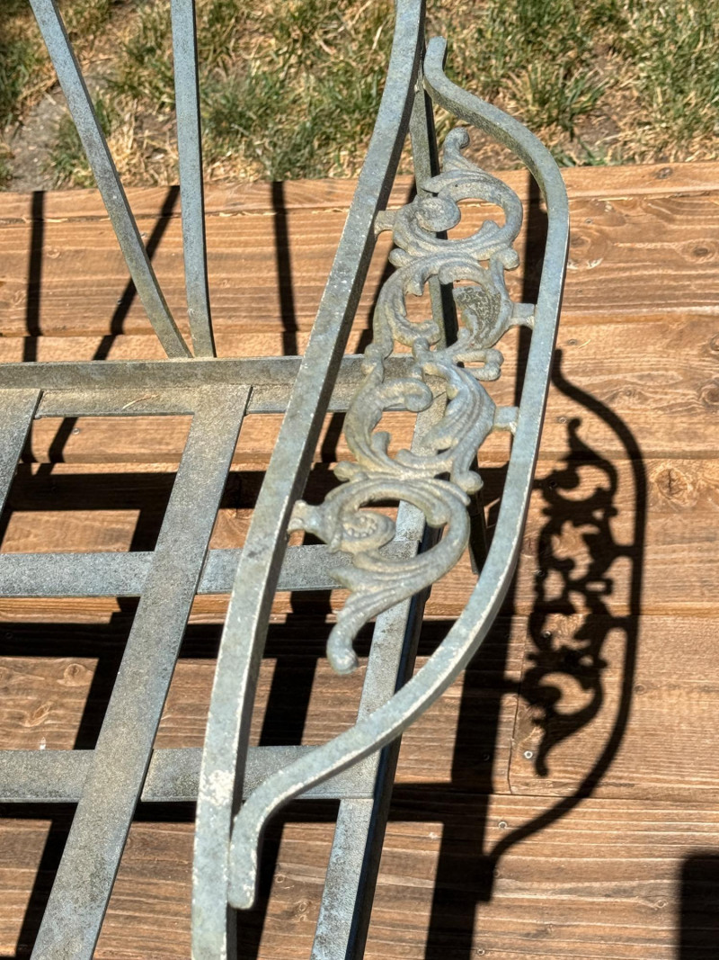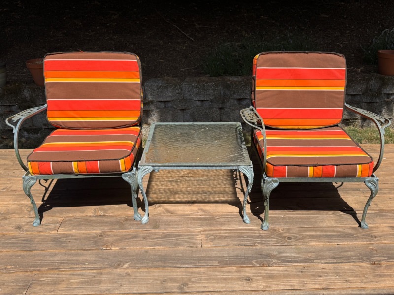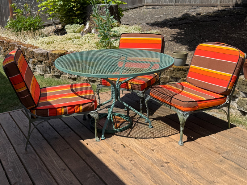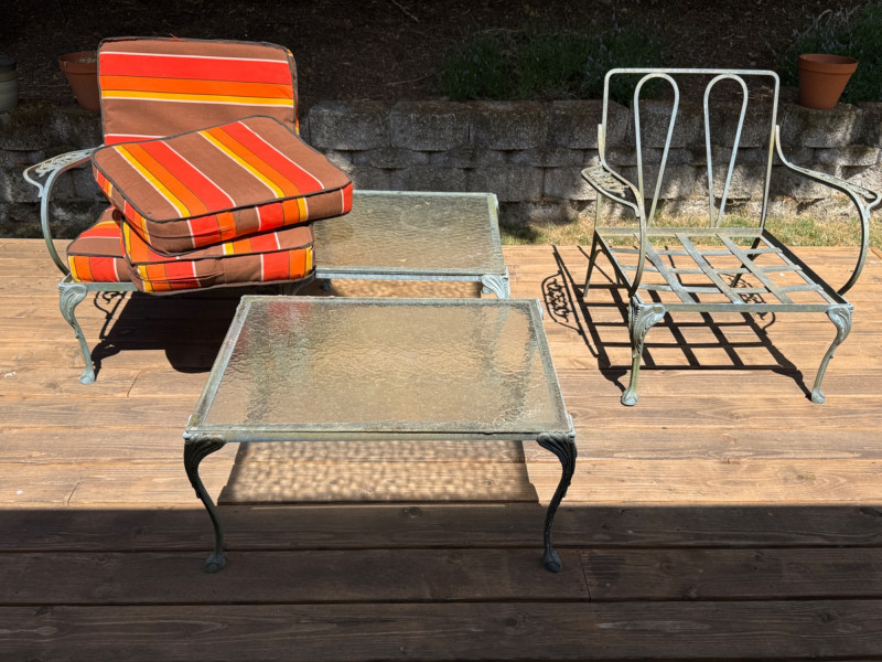 Lightweight but sturdy! Cast Aluminum Patio Set with Dining Table, umbrella and stand. 3 armless chairs need cleaning but will be worth it. 1 arm chair 32x30x31” 1- One arm chair Square table with glass top 24x24” Rectangle table with glass top 30x22 Mesh top dining table with umbrella and stand. 47” Handmade cushions with canvas fabric, no stains, spots or smells. Cushions kept indoors.