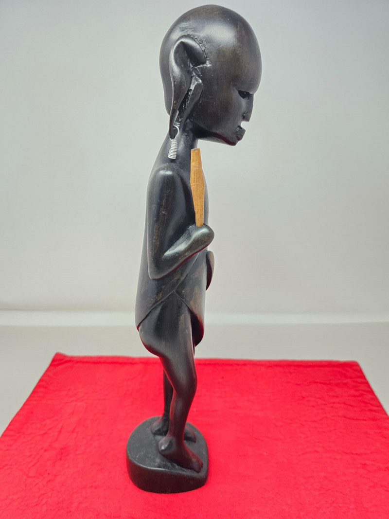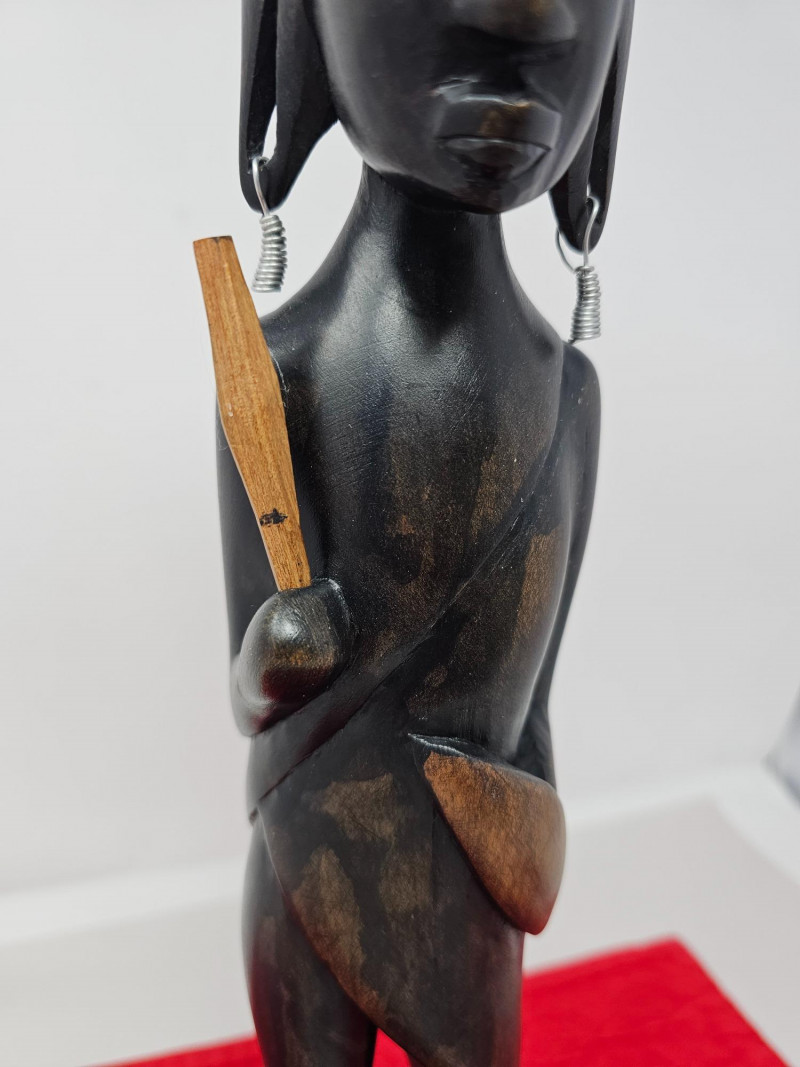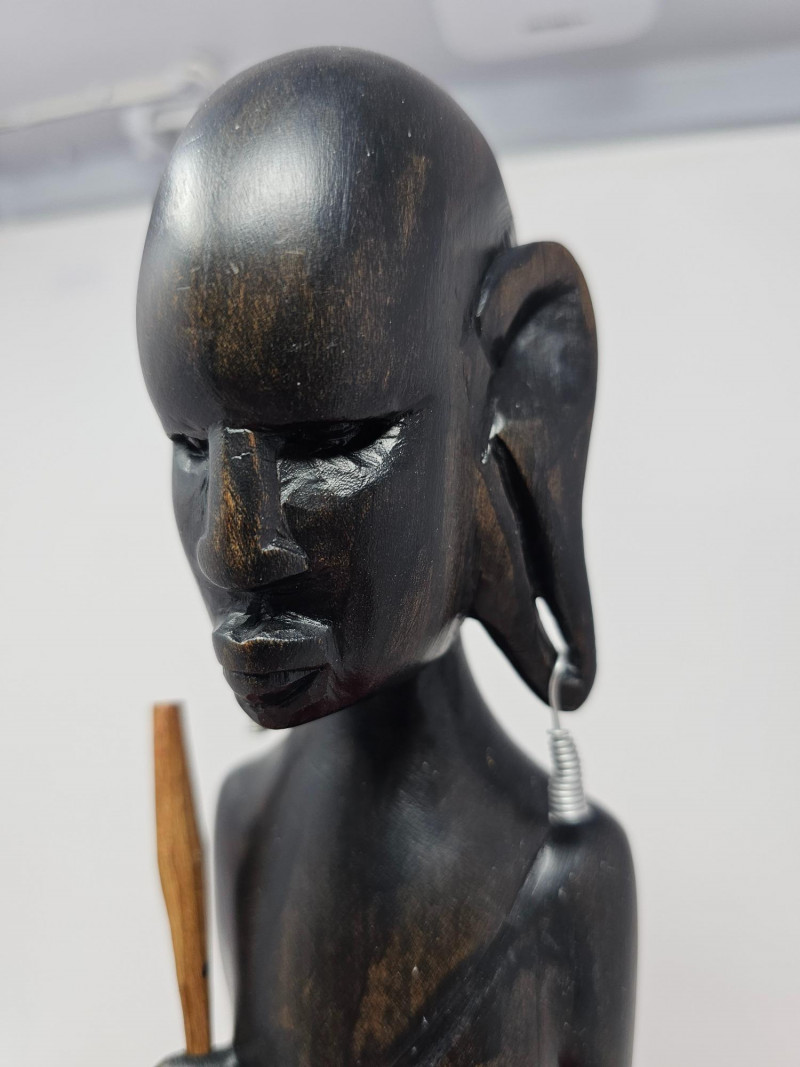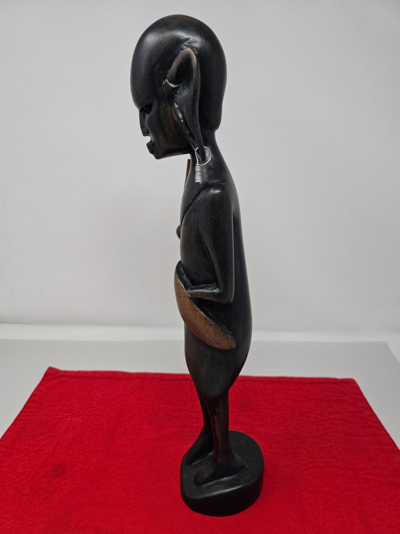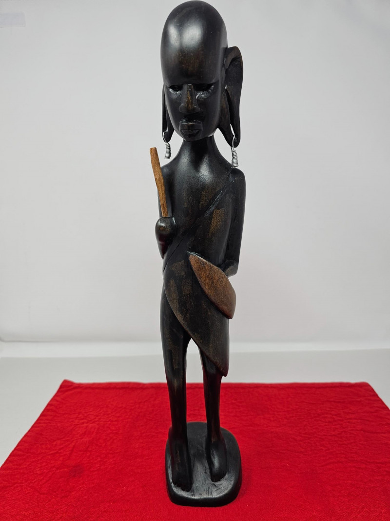 Vintage African Hand Carved Traditional Woman Wood Sculpture The figure depicts a hand-carved wooden sculpture of an African woman holding a staff or club and has metal earrings. The figure is has detailed carving of the face and body. These types of sculptures are often associated with the native tribes in Kenya, known for their elaborate wood carvings, particularly from ebony wood. Woman sculpture is in very nice condition.(see pics for condition) 16"T x 3"W x 3.5"D