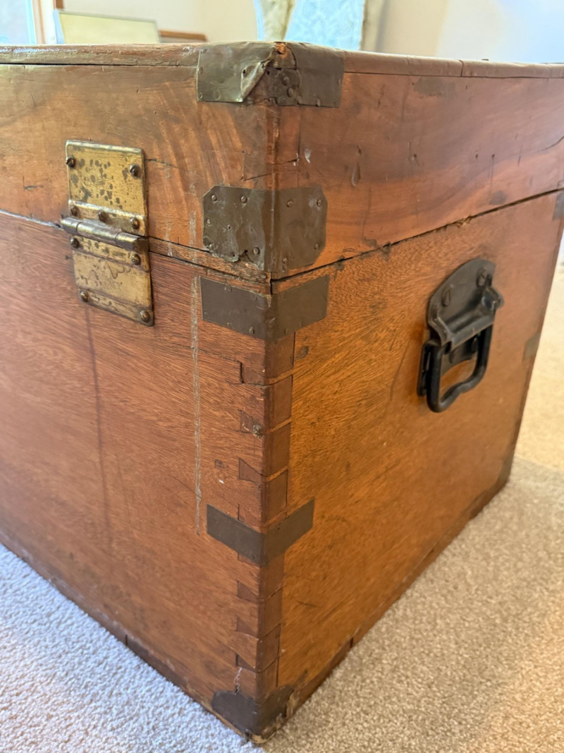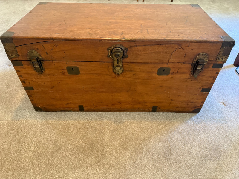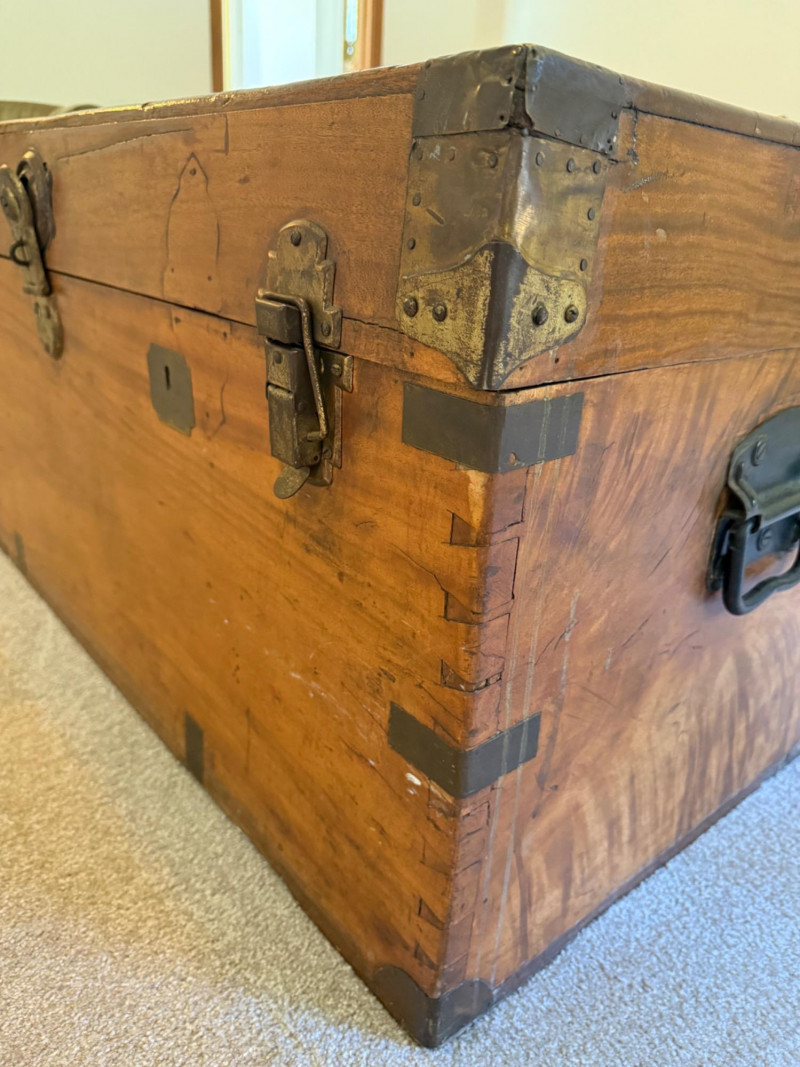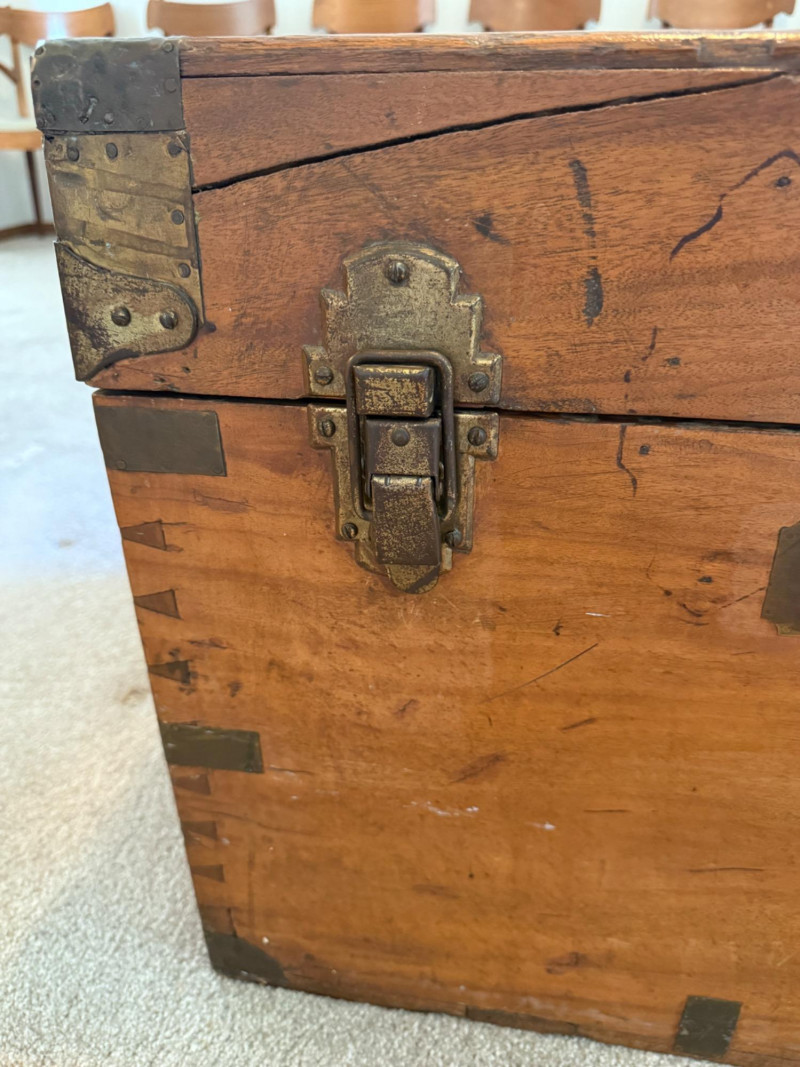 Antique Camphor Wood Chest Brass on corners and edges. Two latches with hasp and side handles. It has been around the world! A cool patina that only time can bring.