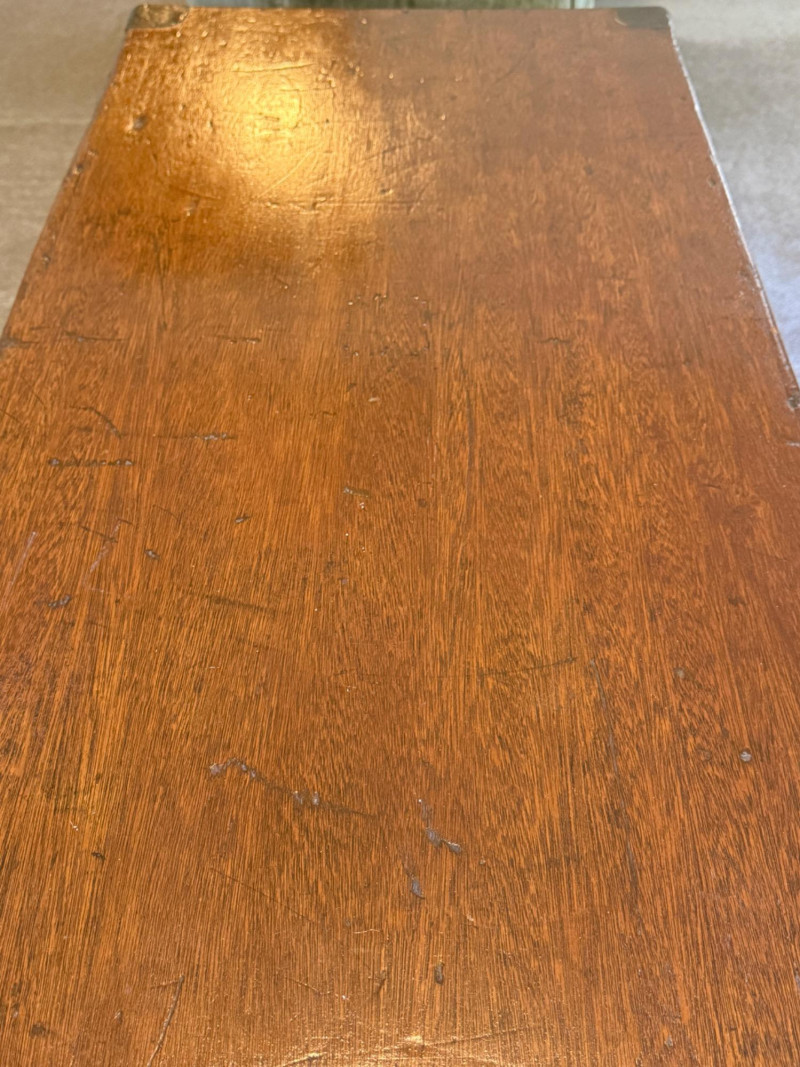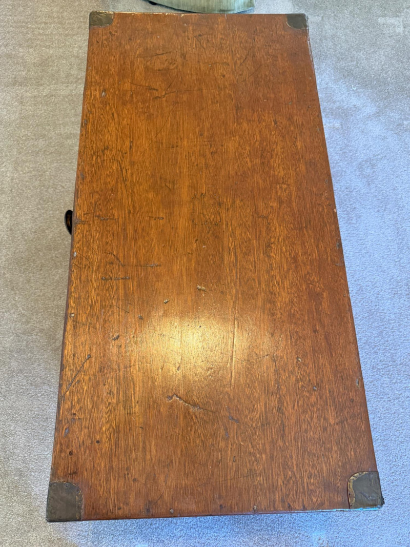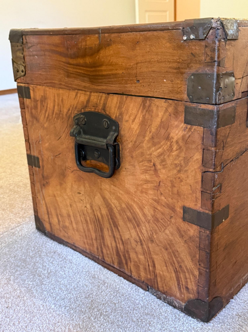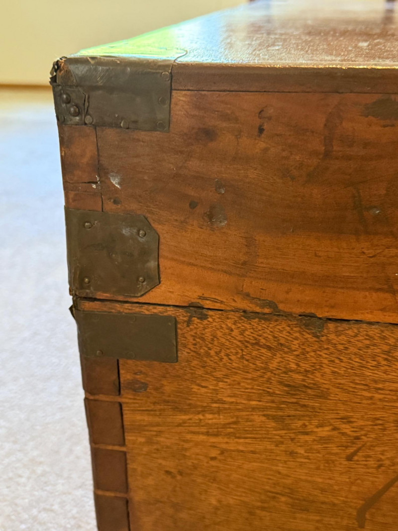 Highly desirable for storing garments and blankets because the natural oils in camphorwood act as a known insect repellent, particularly effective against moths. Antique camphor wood chest, also known as a camphor wood trunk or campaign chest. Originally used for storage and then used for shipping goods from China.