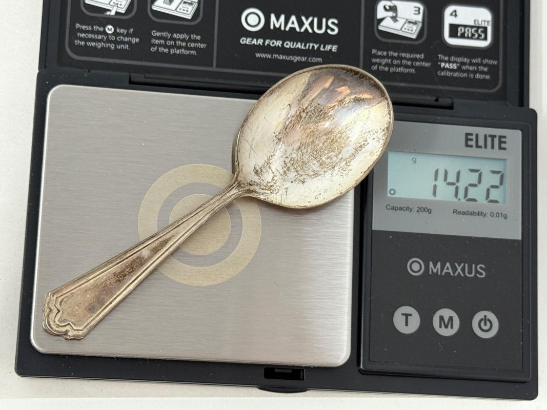 Small sterling silver spoon weighs 14.2g and stamped sterling on back.