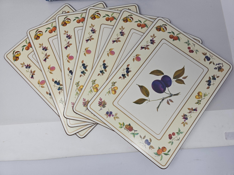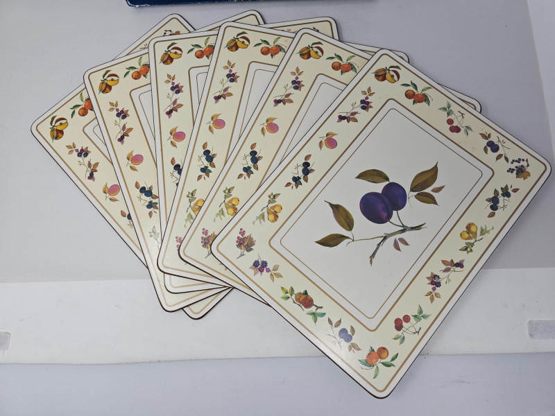 Royal Worcester Plum Trivets Boxed Set Of 6 Set of 6 Royal Worcester Plum Trivets in original box Trivets (or placemats) are 9" x 12" Box shows a lot of wear & tear, trivets appear to be in good condition (see pics)
