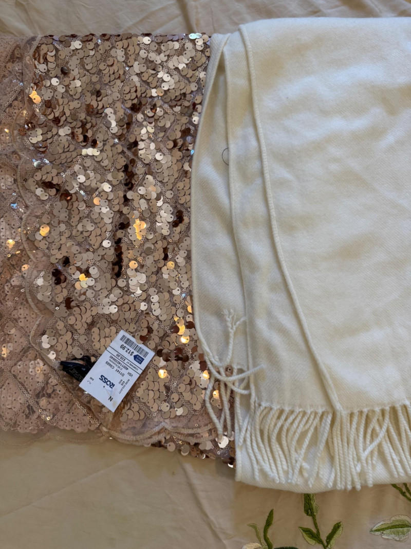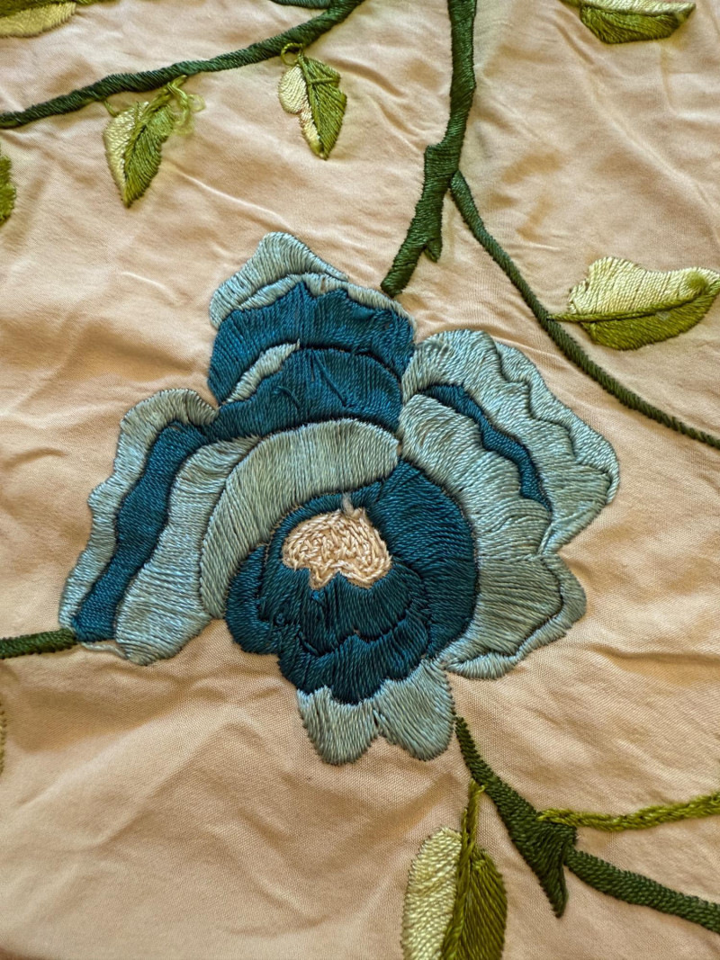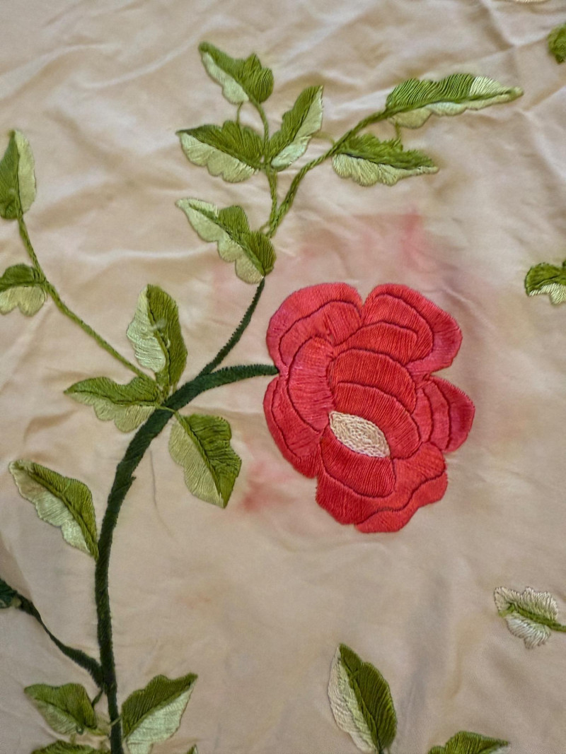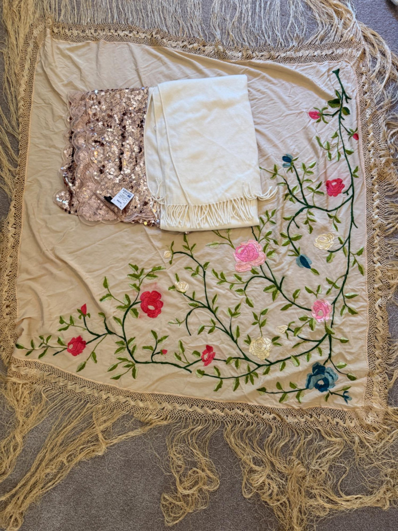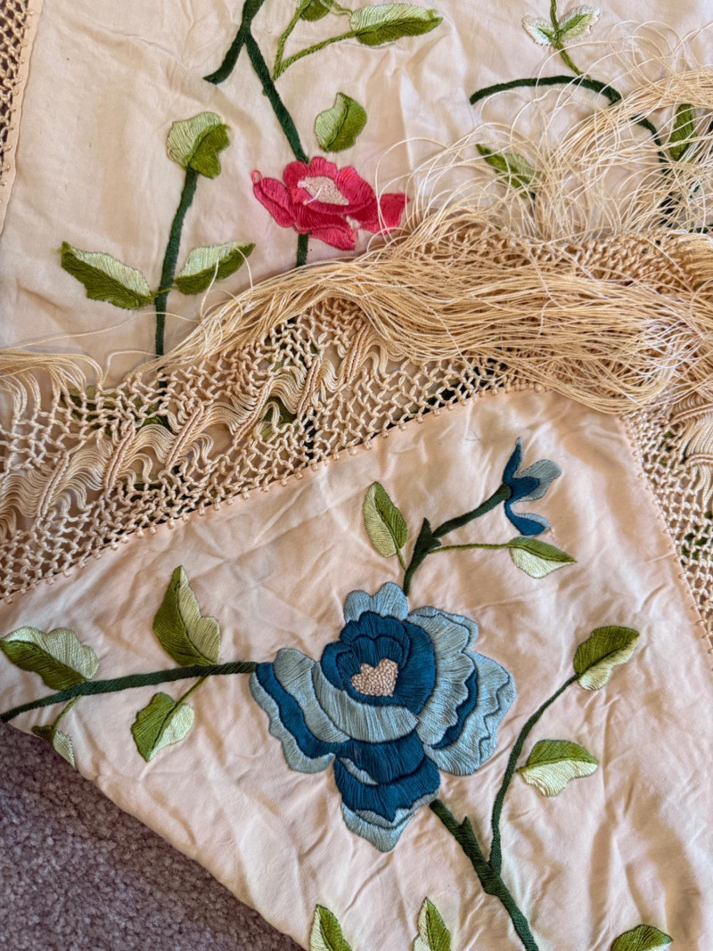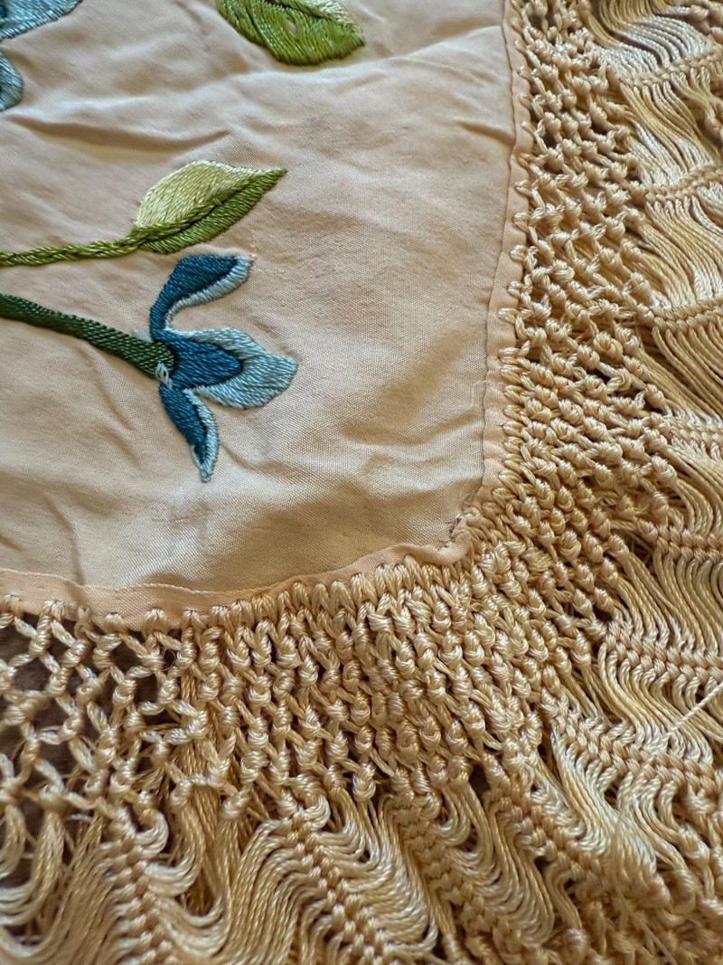 Hand crafted square table cloth with long fringe and embroidered fowers Sequin and ivory cotton runners.