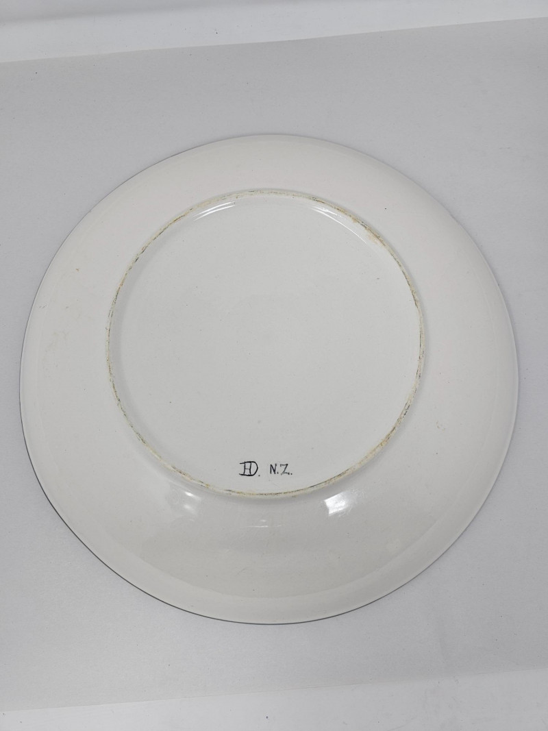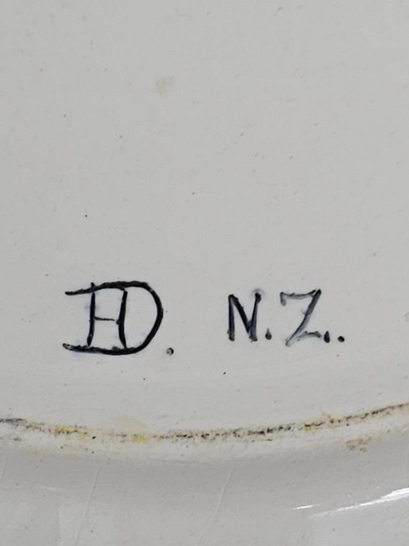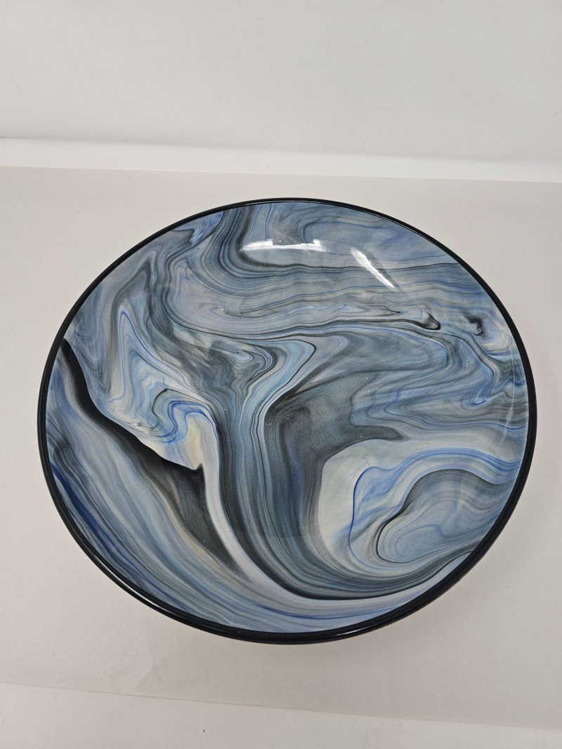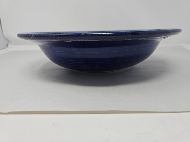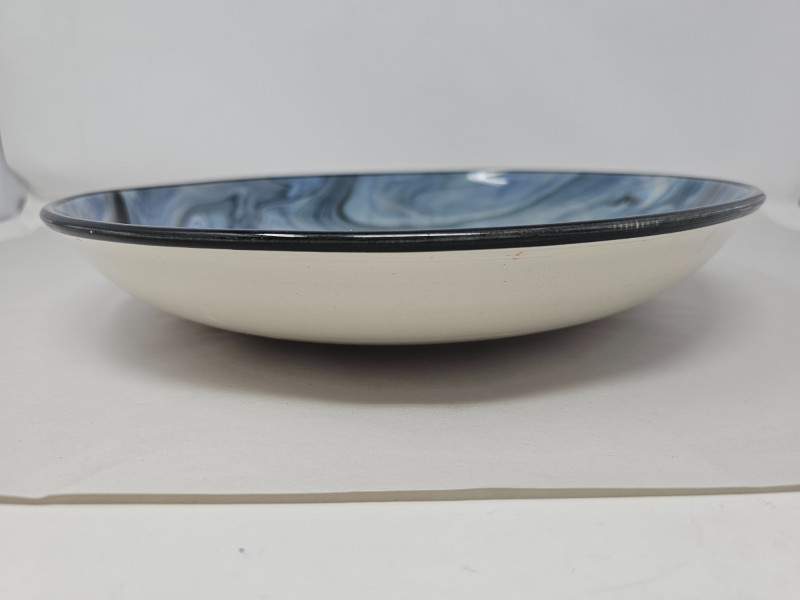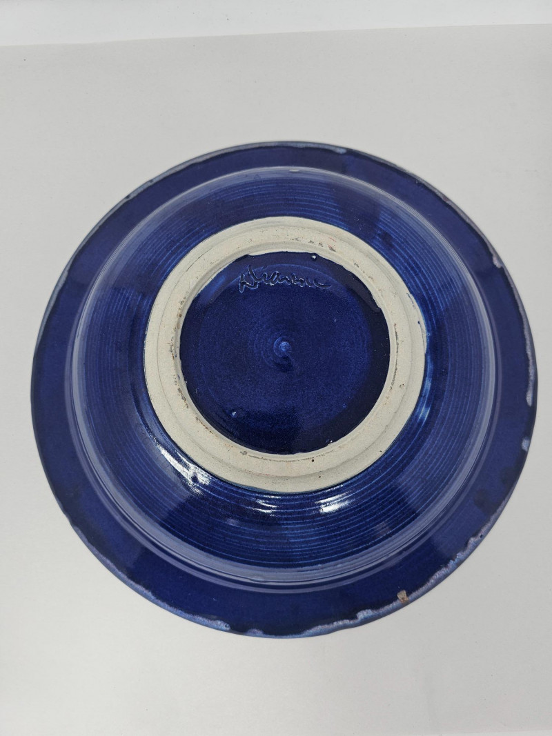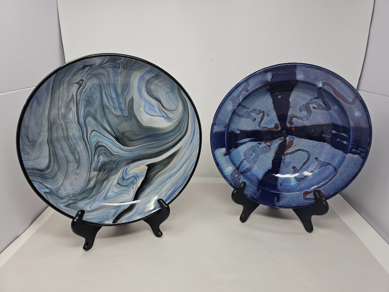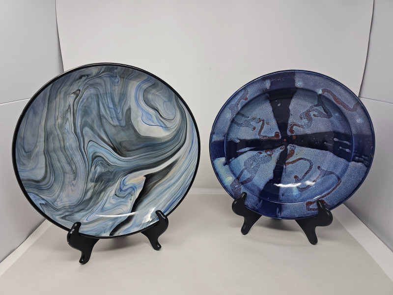 Studio Pottery & Ceramic In Shades Of Blue Beautiful and functional, these serving-sized bowls will impress at your next dinner party! Swirl Ceramic Bowl is signed on bottom "HD. N.Z." 2"T x 12.75"W Blue Pottery Bowl is signed on bottom "Dianne" 3"T x 12"W Wood stands included Both appear to be in good condition (see pics)