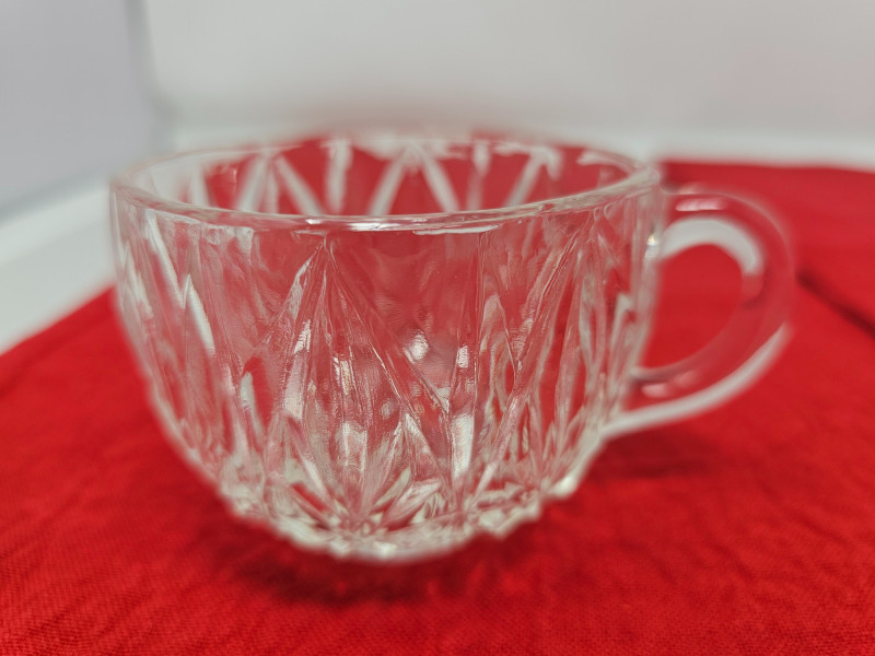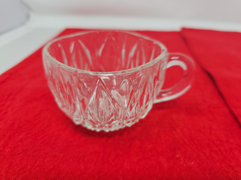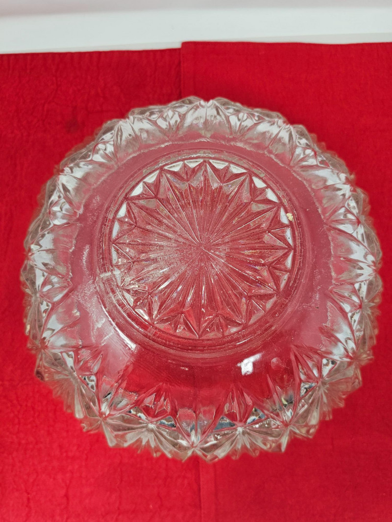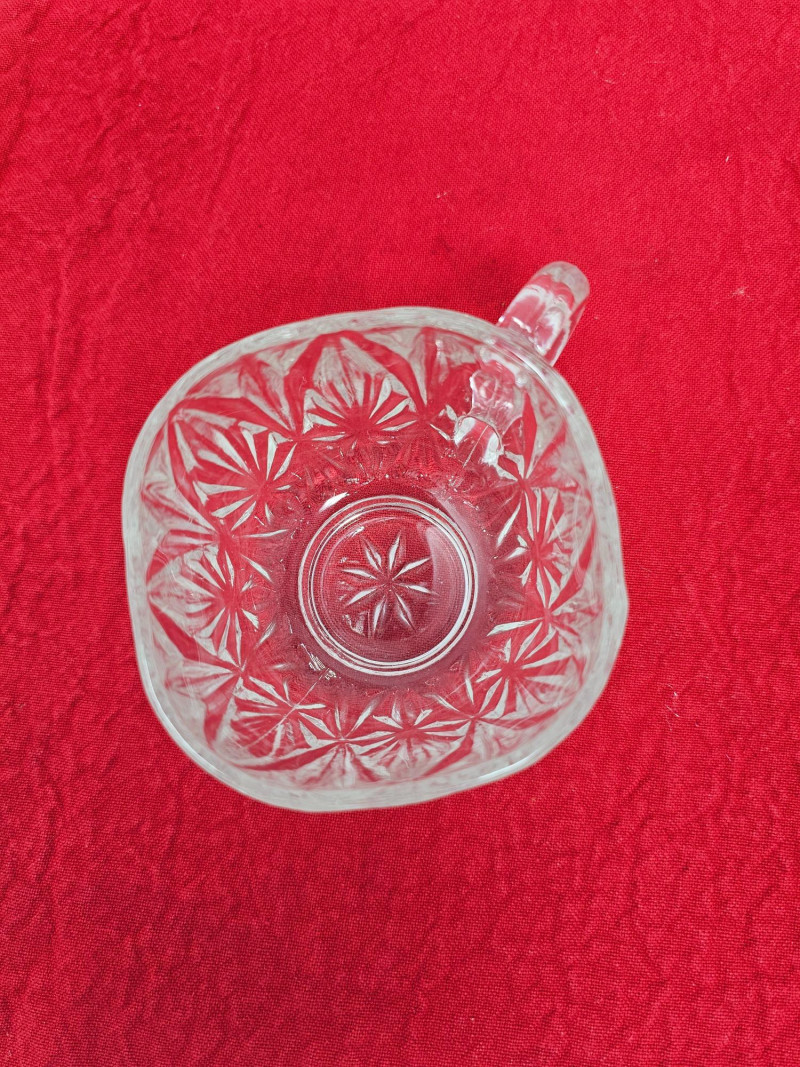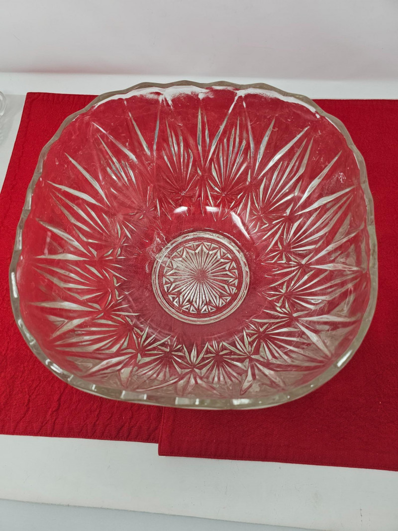 Vintage Hazel Atlas Williamsport Clear Pressed Glass Punch Bowl Set The pattern is called Williamsport, and it features a square prism design with a starburst fan motif 1 clear pressed glass punch bowl 10 clear pressed glass punch cups Made by the Hazel Atlas Glass Company in the 1950s - 1960s Bowl 6.5"T x 11"W Cups 2.5"T x 3"W Set appears to be in good used condition (see pics). The ladle is missing