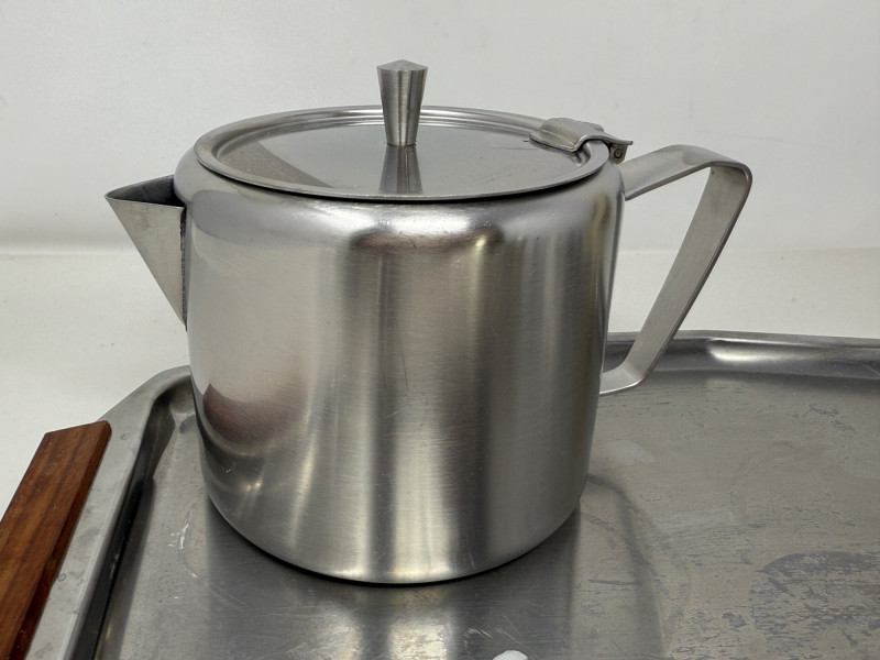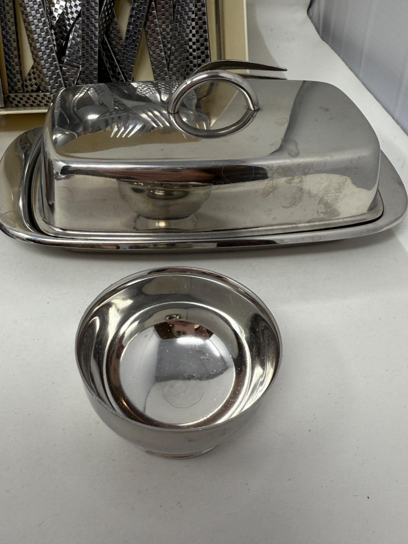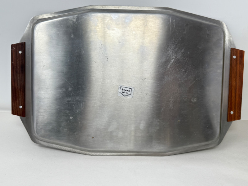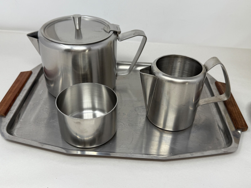 Stainless Collection - MCM Tray & Service - Flatware + Tray is 13.75x9” Stainless Steel with Wood Handles Coffee Cream and Sugar west is Tudor Knight Made in England. Butter dish and small bowl.