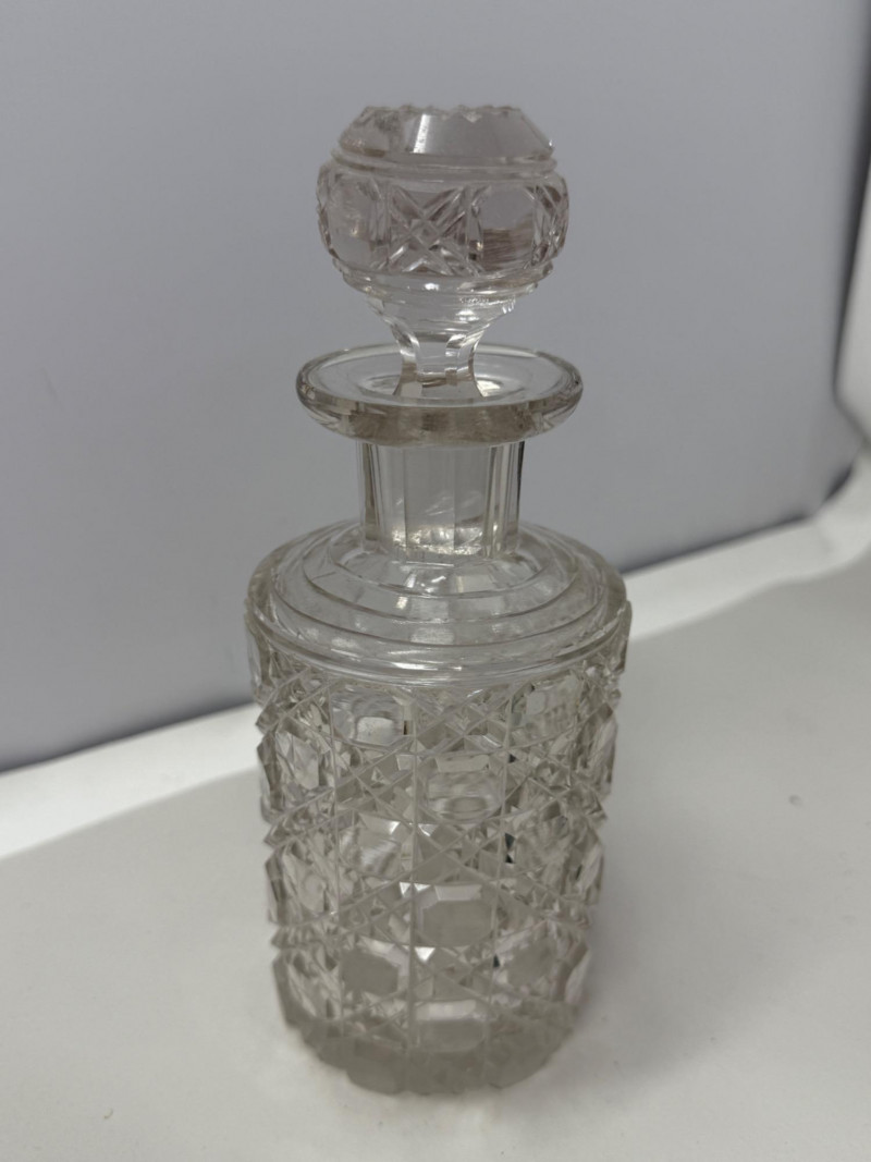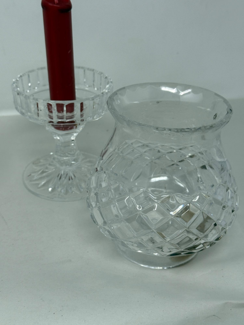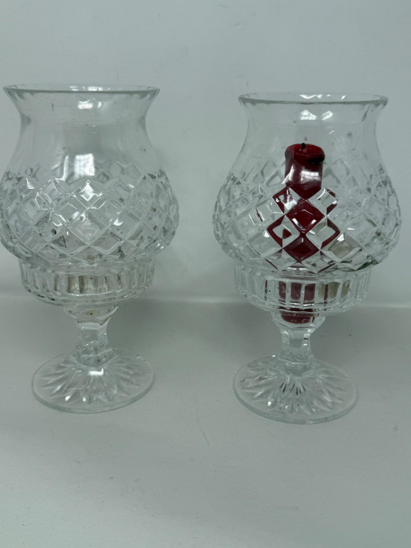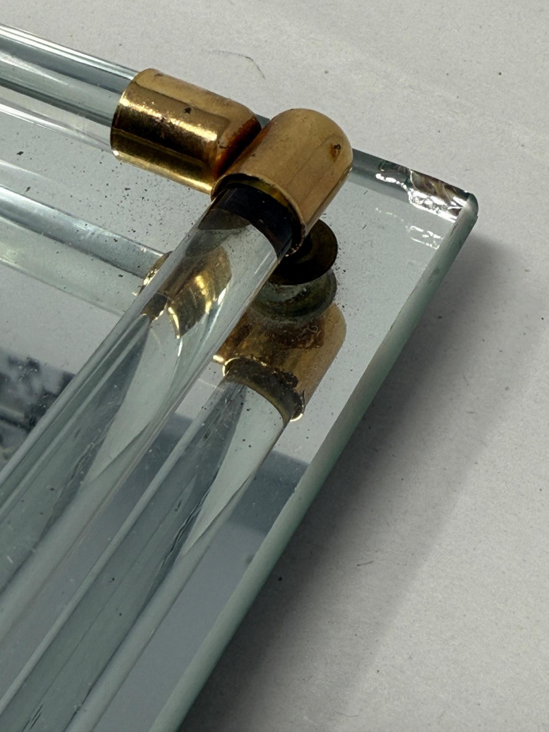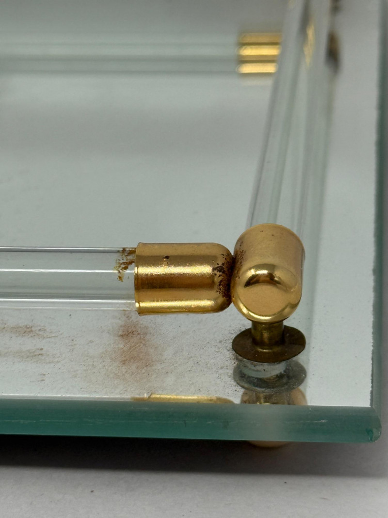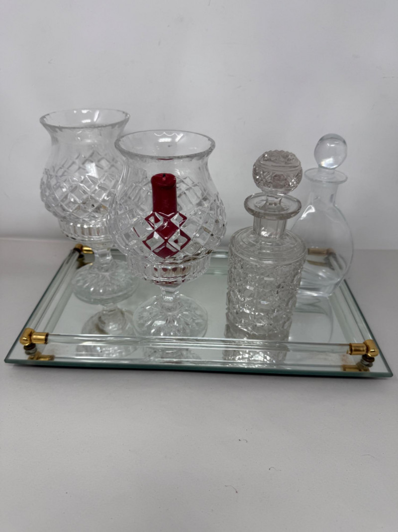Mirror & Glass Vanity Tray - Decanters - Candle Lanterns Decanters are 7.25” & 7” Tray is 14x8” with 2 chips on mirror edge. See pics