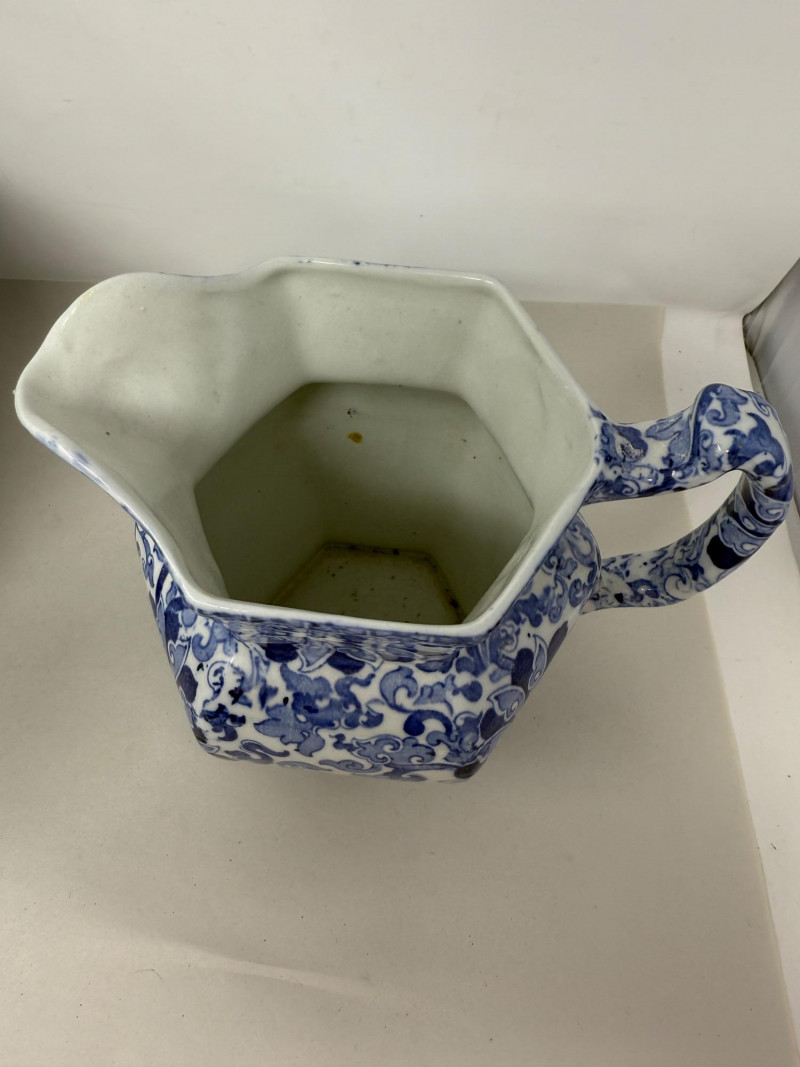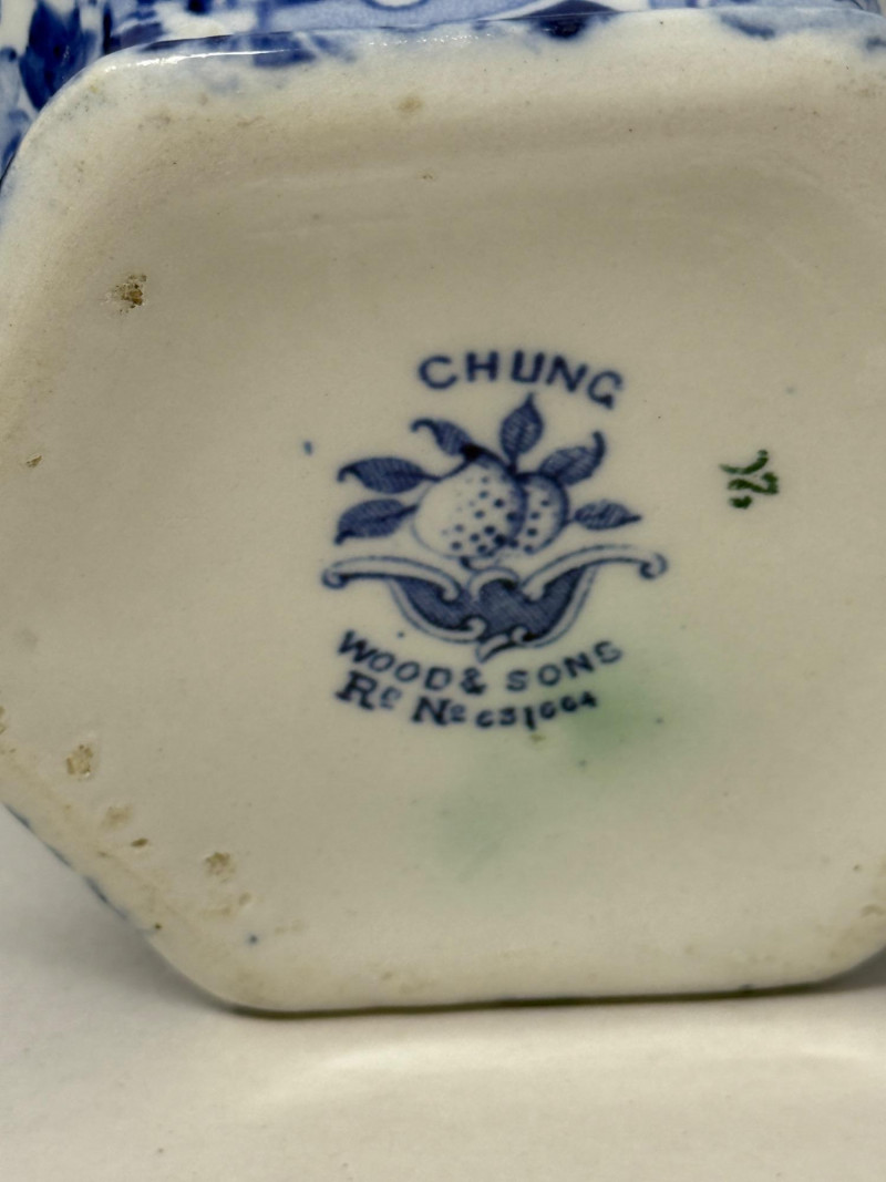 The "Chung" pattern is one of Frederick Rhead's successful blue and white designs, dating back to 1914, indicated by the registration number 631664 This piece was produced by Wood & Sons, specifically under their Bursley Ware line, and features the distinctive "Chung” Julia Crystal Bowl - Chinese Bowl & Pitcher Chinese Bowl 12x6” Not for food use Chung Wood & Sons Pitcher 7x6.5”