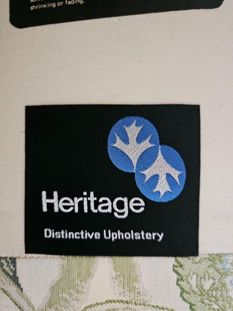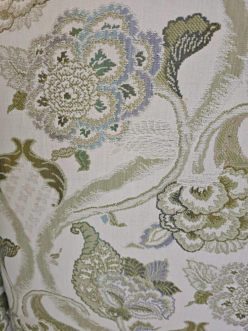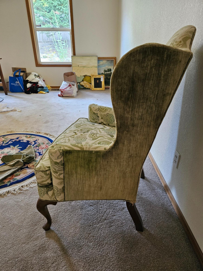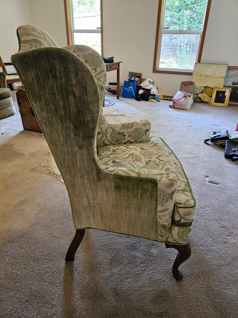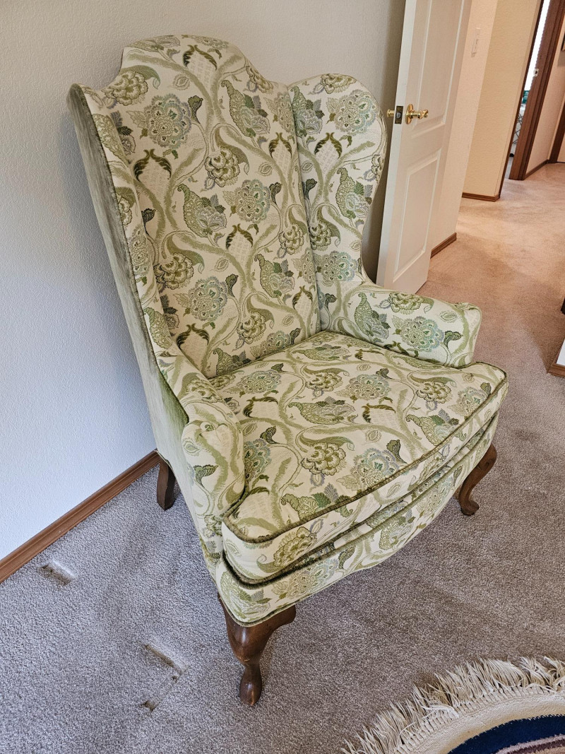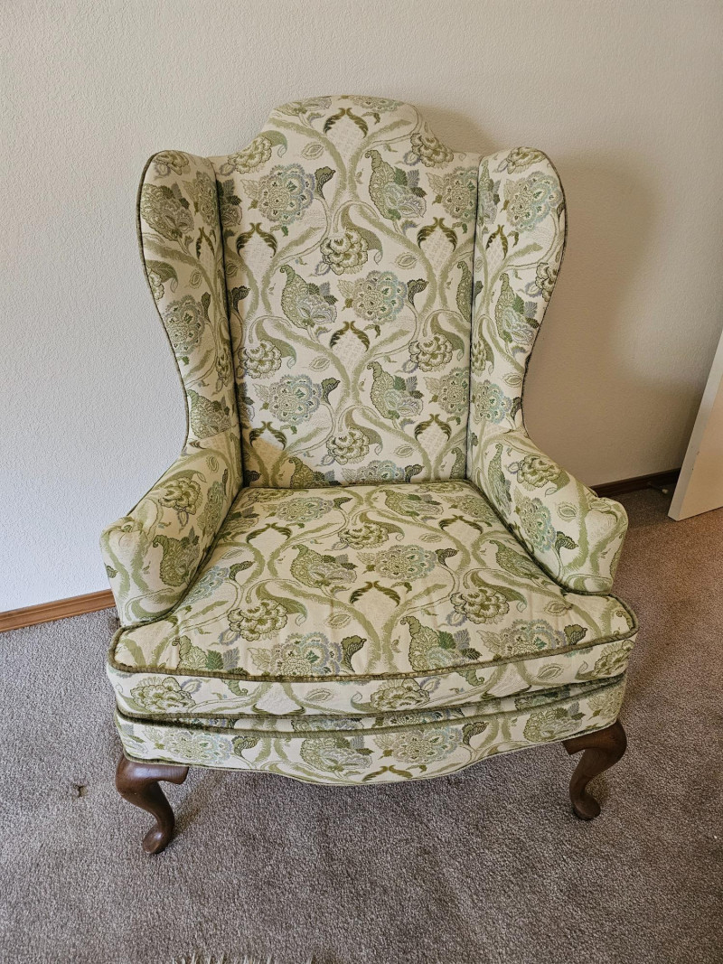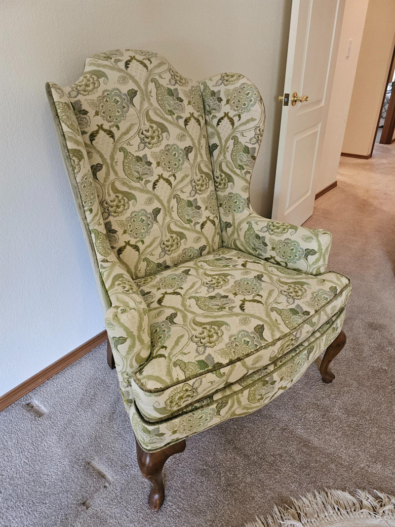 1977 Drexel Heritage Queen Anne-Style Wingback Chair Features a distinct wingback design, cabriole legs, and upholstery with a floral pattern in green and white Solid wood frame Chair is in good used condition (see pics) Includes set of armrest covers 44.5"T x 31"W x 30"D