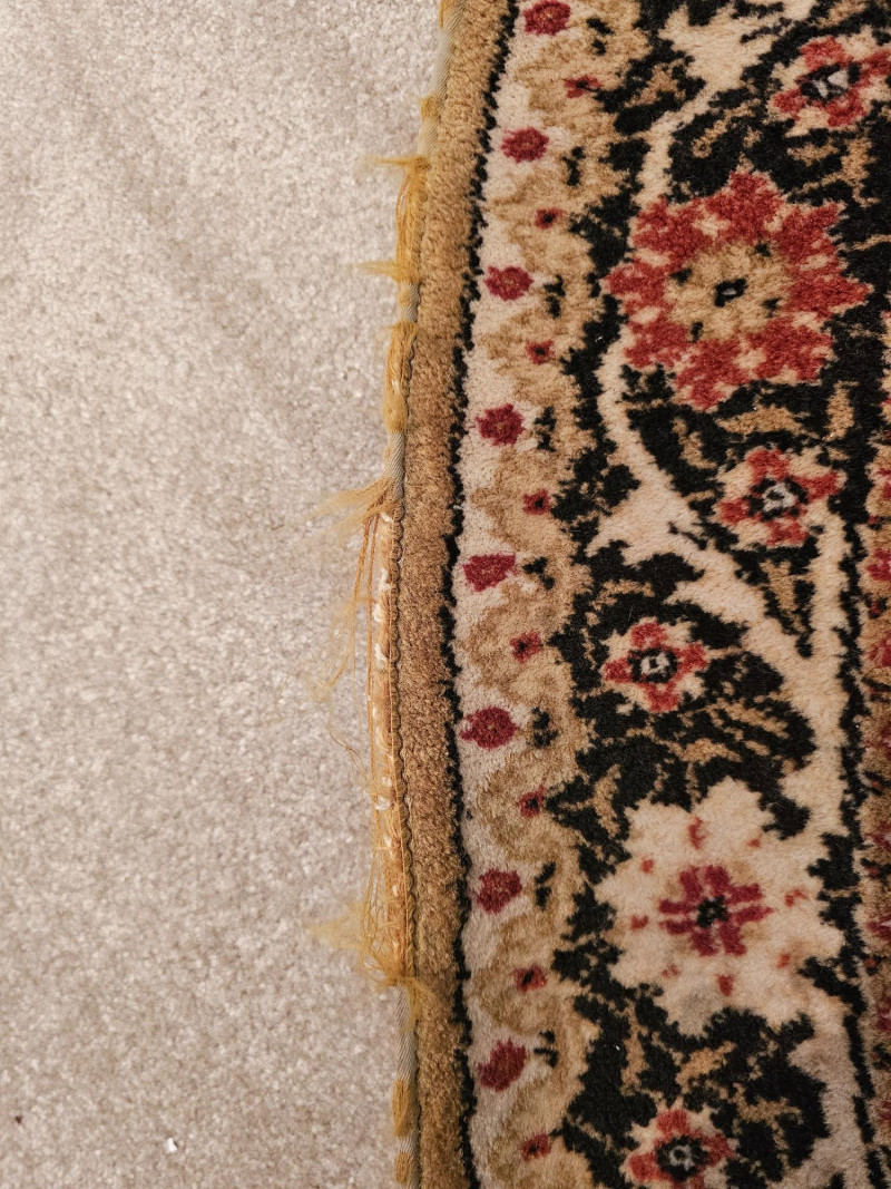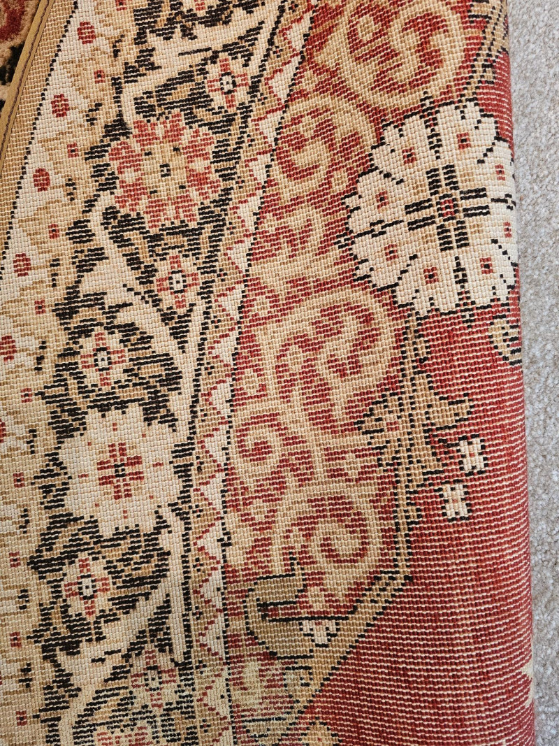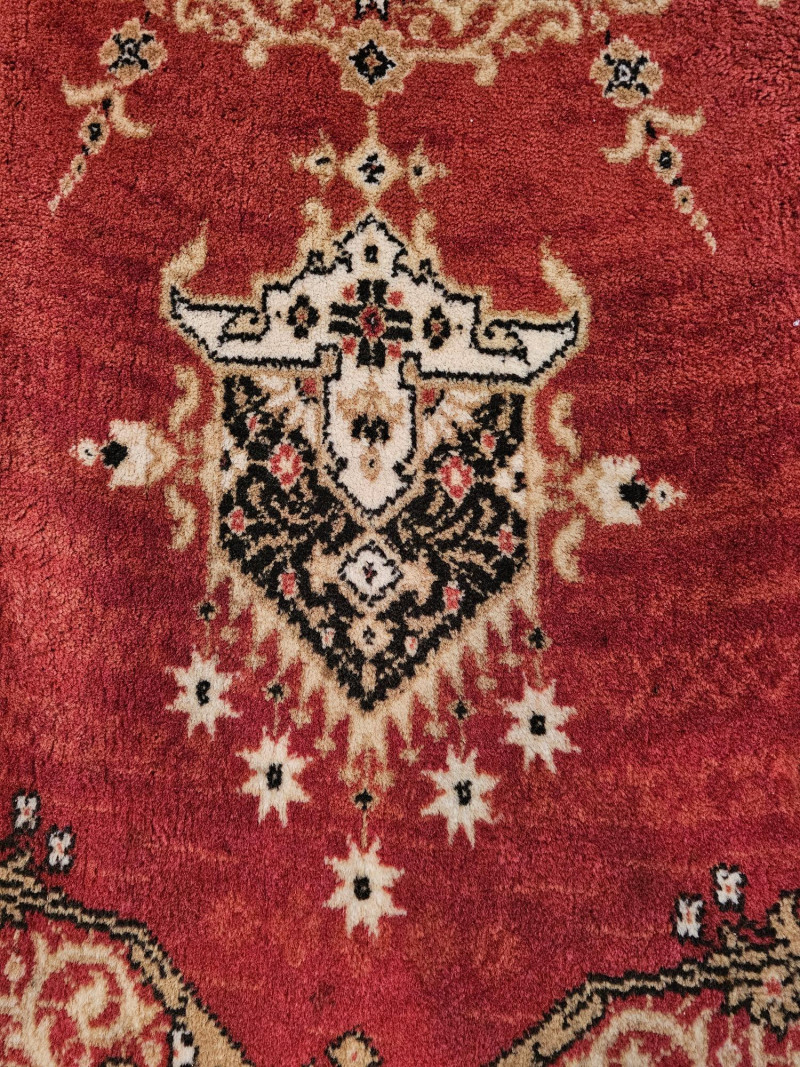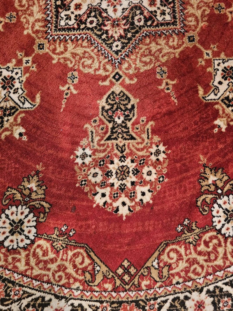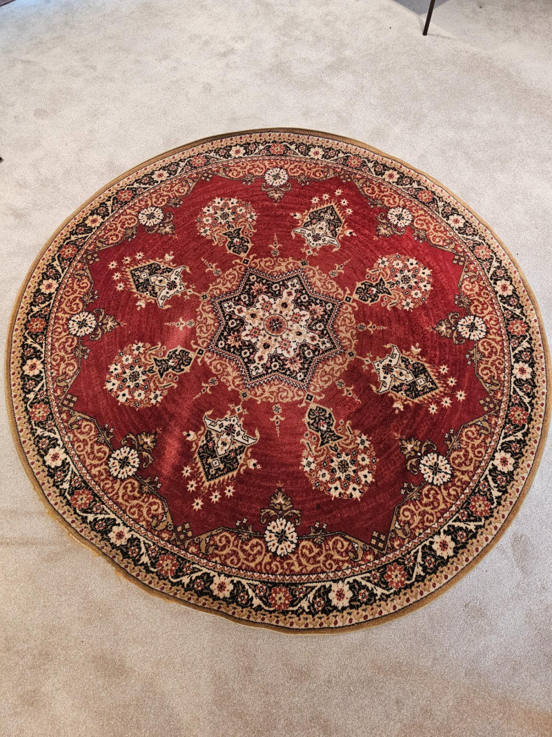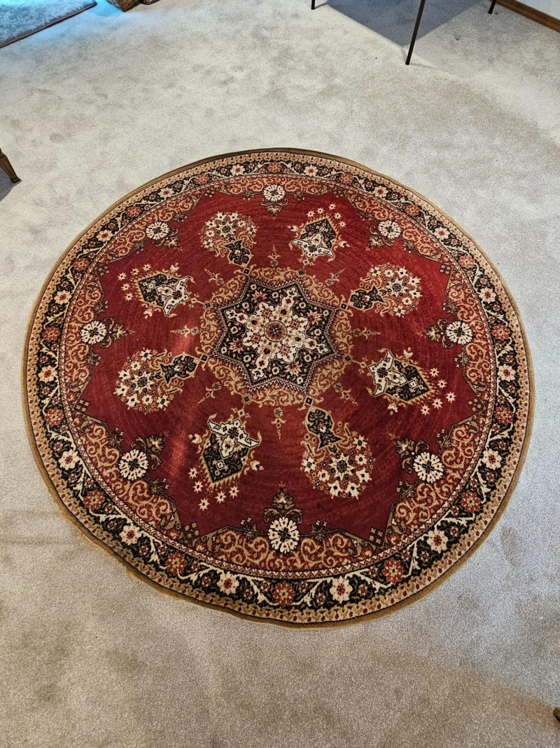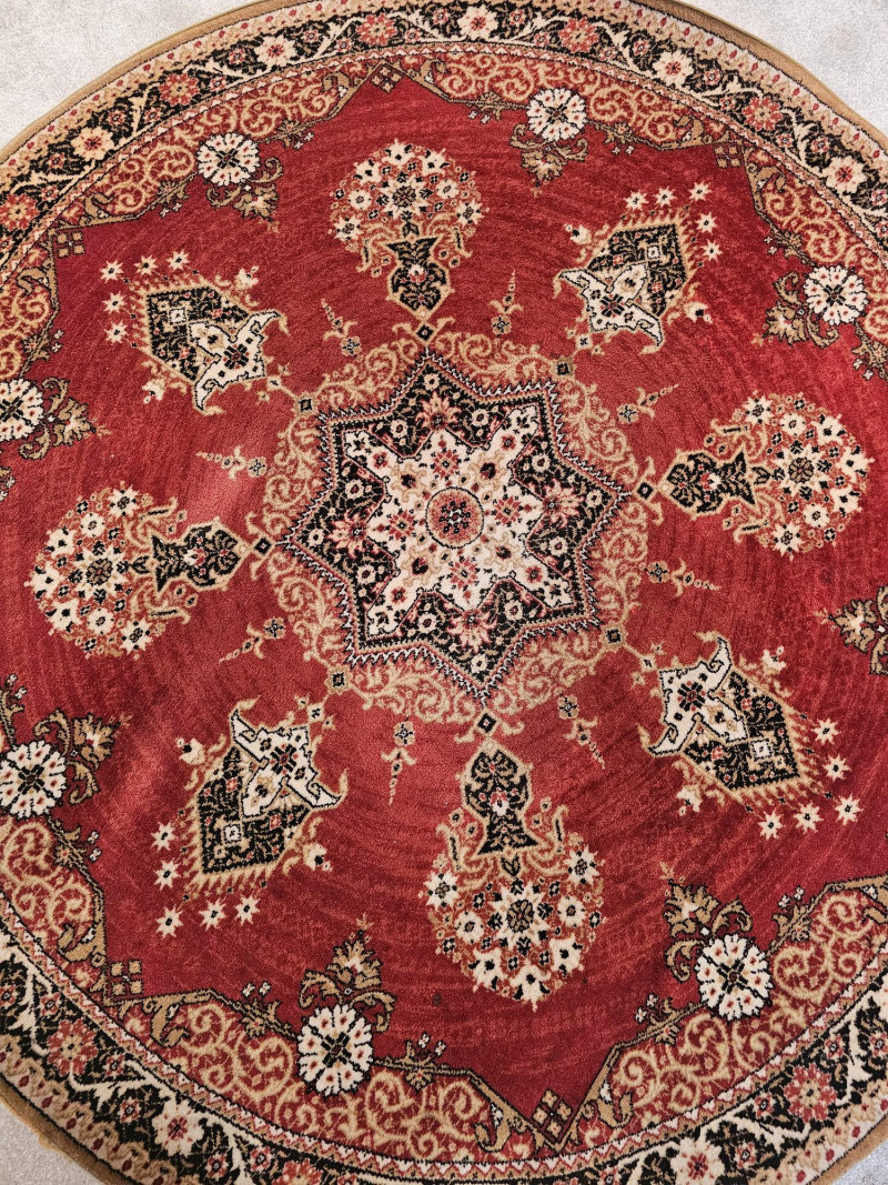 Heriz-Style Red Geometric Design Round Rug Large center medallion framed with intricate designs and floral patterns to edge Rug appears to be in good used condition with typical wear & tear (see pics). Some fraying on about 18" of edge banding 78.5" Round