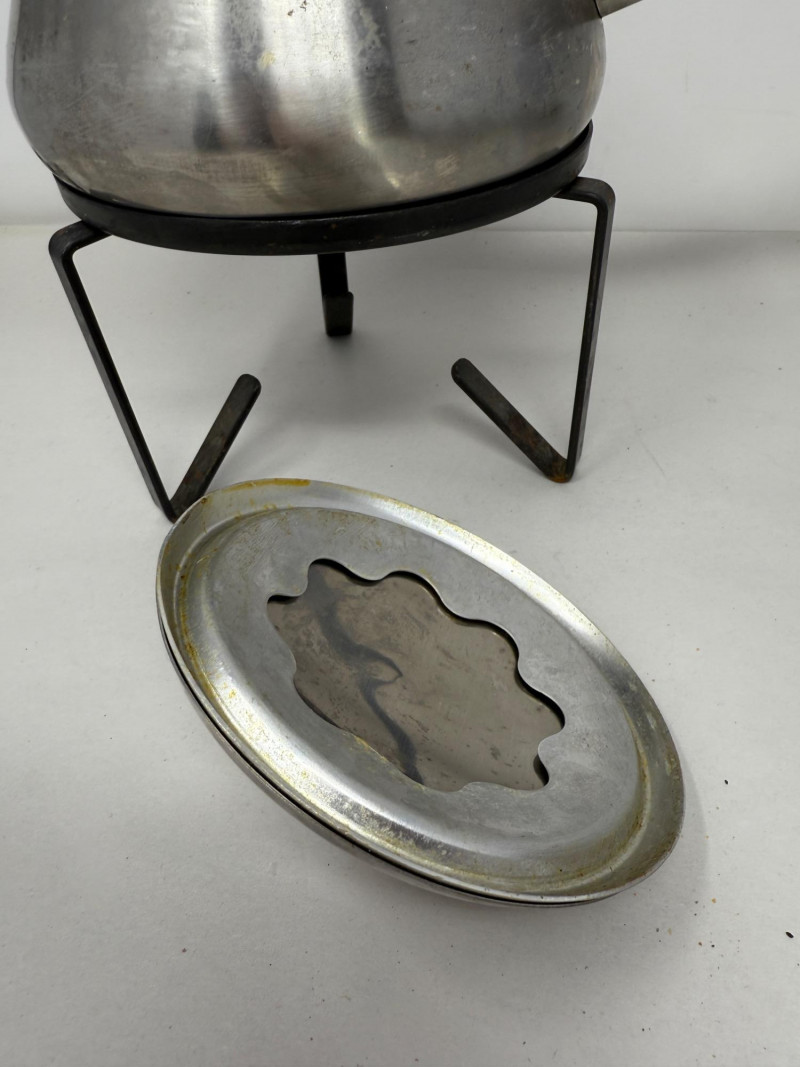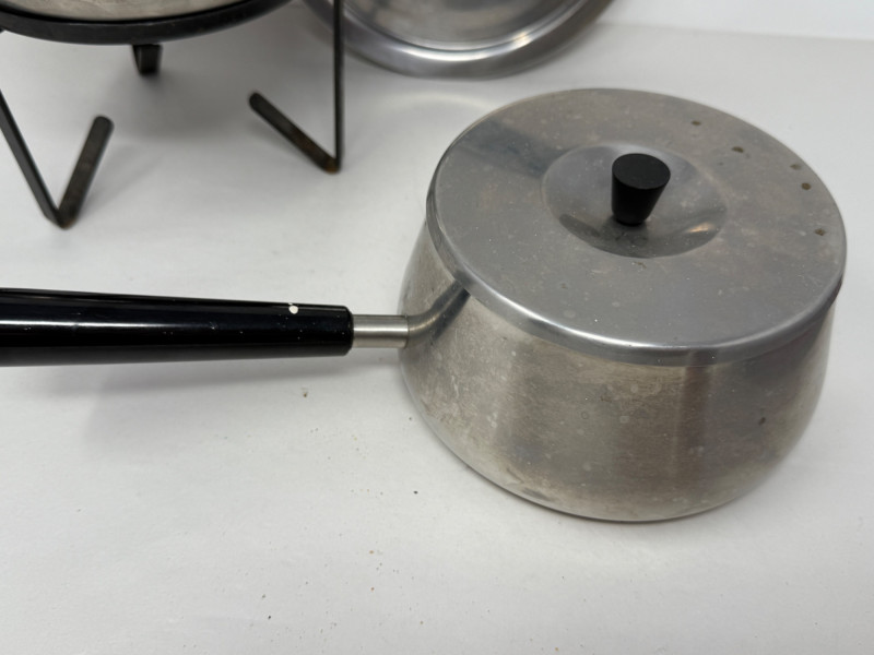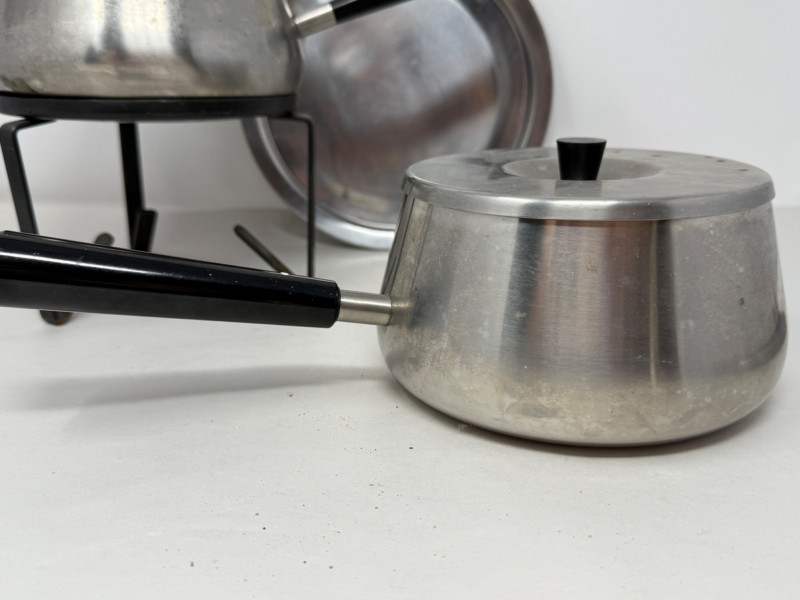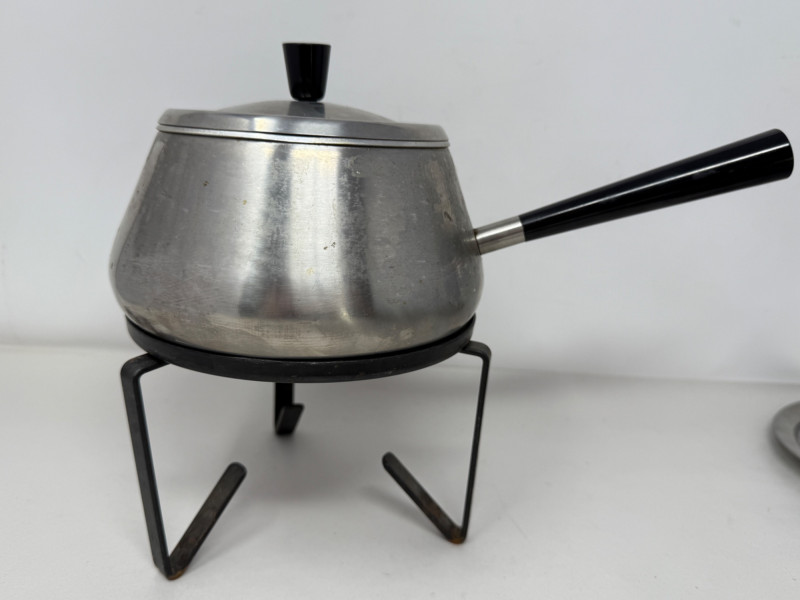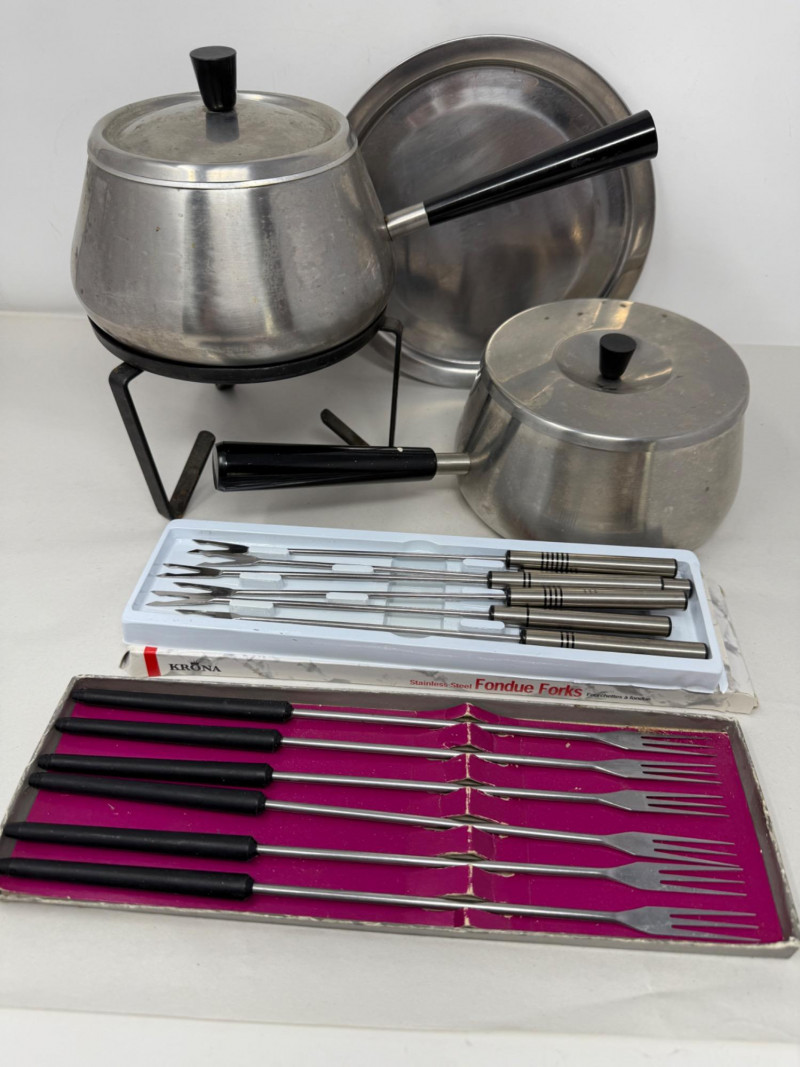 (2) Vintage Stainless Fondue Pots & Forks Each pot is approximately 6x4” 8” flat stainless steel plate