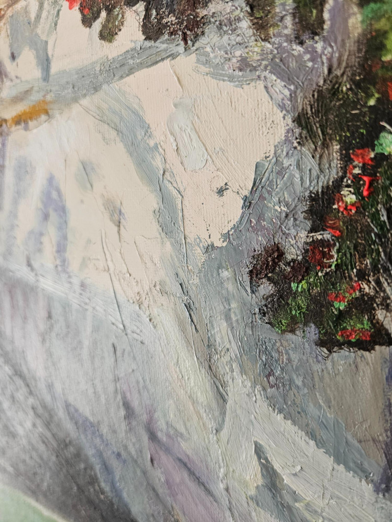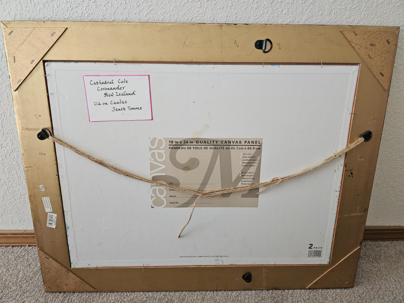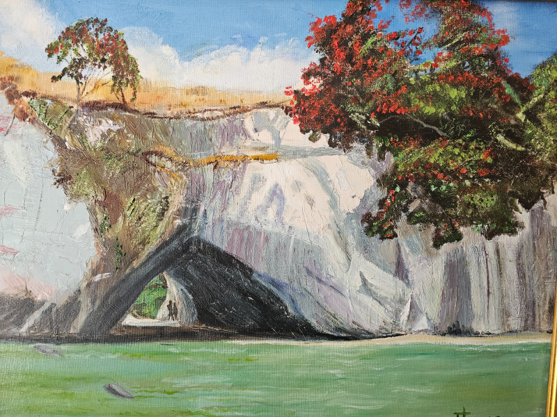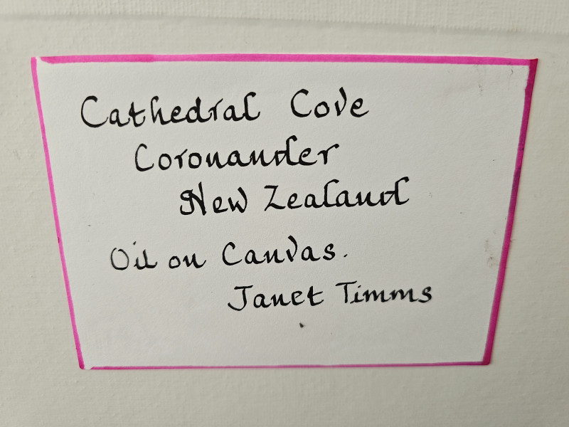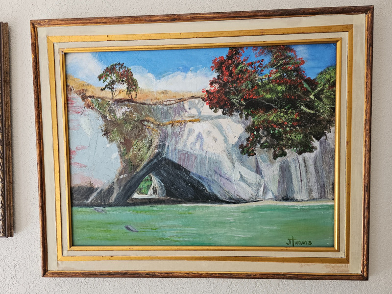 Original Oil Painting "Cathedral Cove" in Coronander, New Zealand By Local Olympia Artist Janet Timms Oil on canvas Framed 24"T x 29.5"W