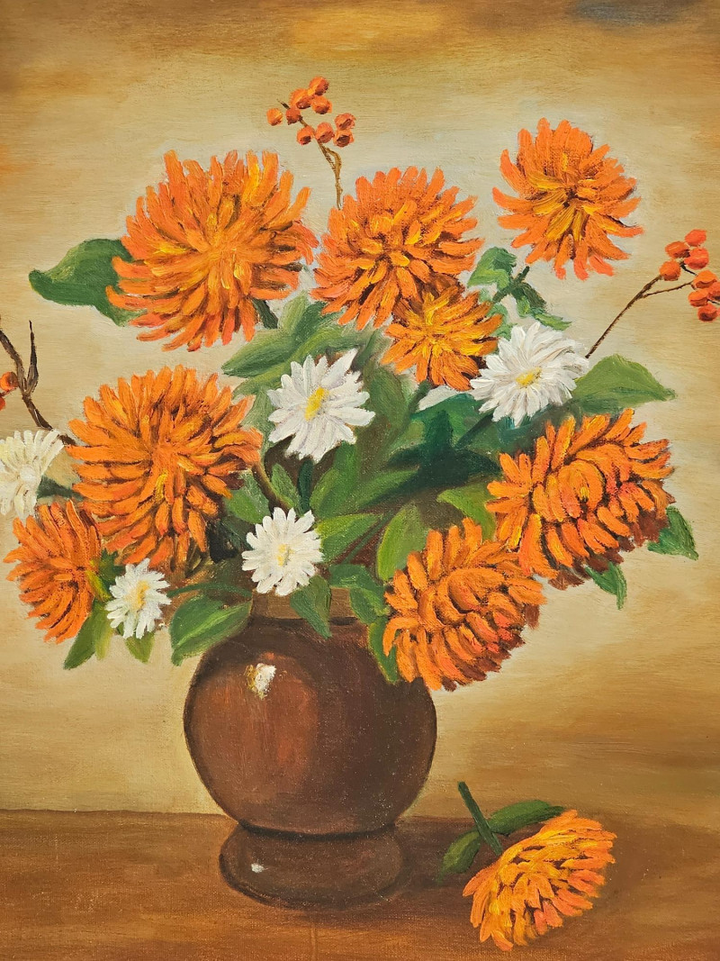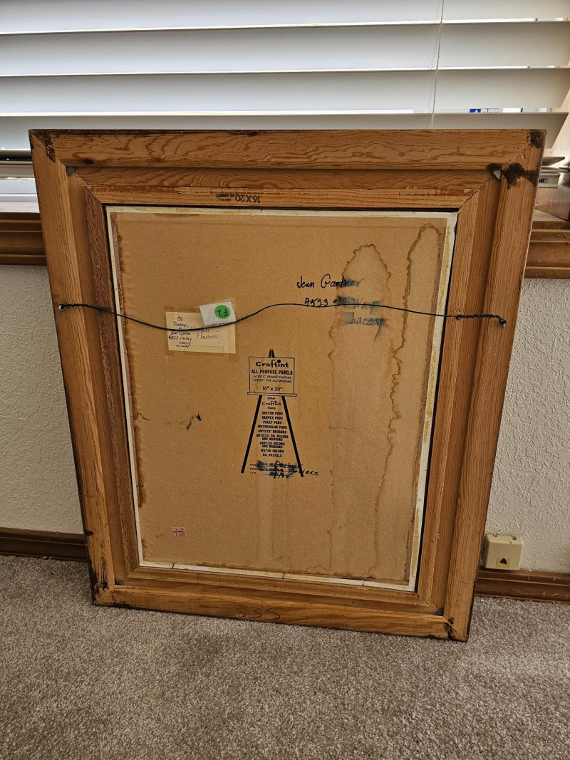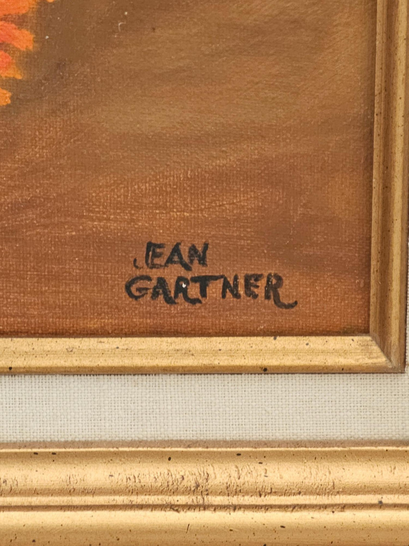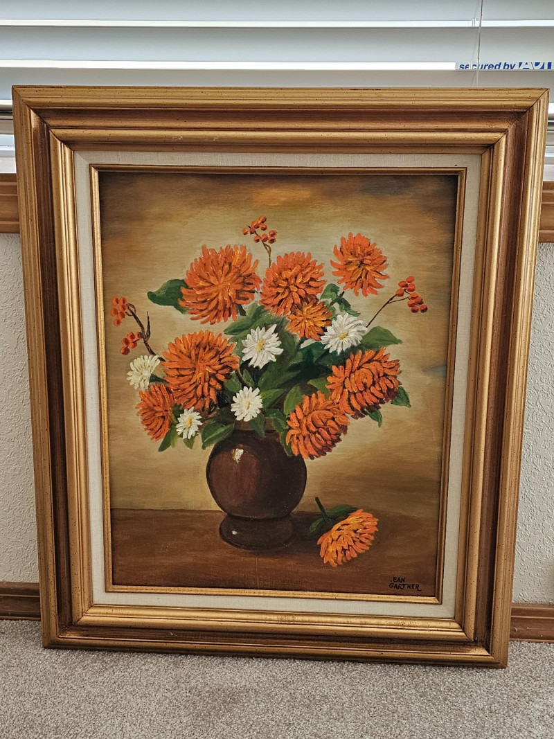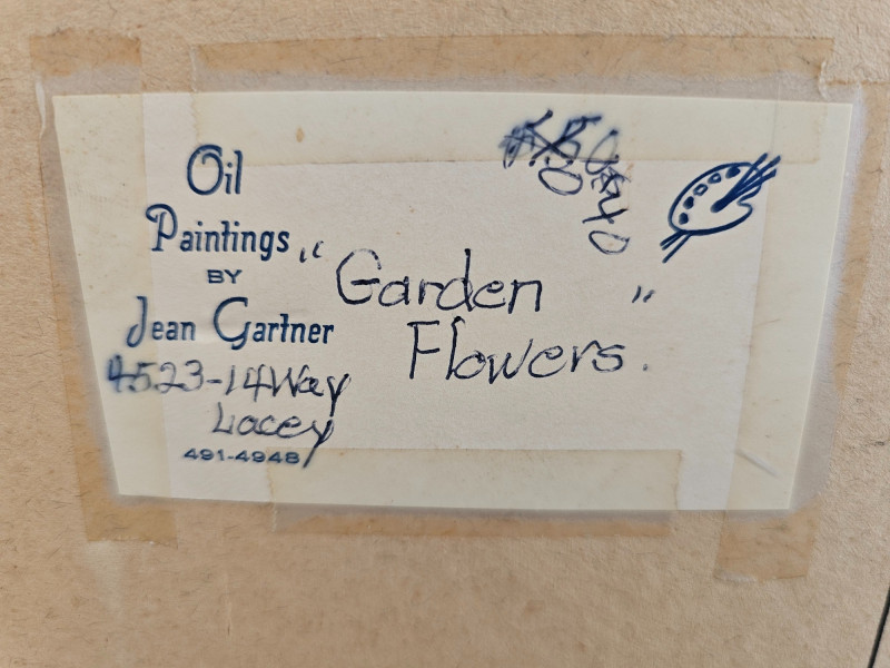 Original Oil Painting "Garden Flowers" By Local Lacey Artist Jean Gartner in 1988 Oil on board Board is loose in wood frame (needs attached) 26.5"T x 22.5"W