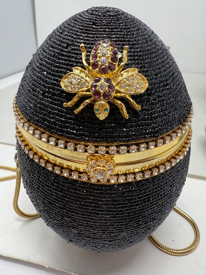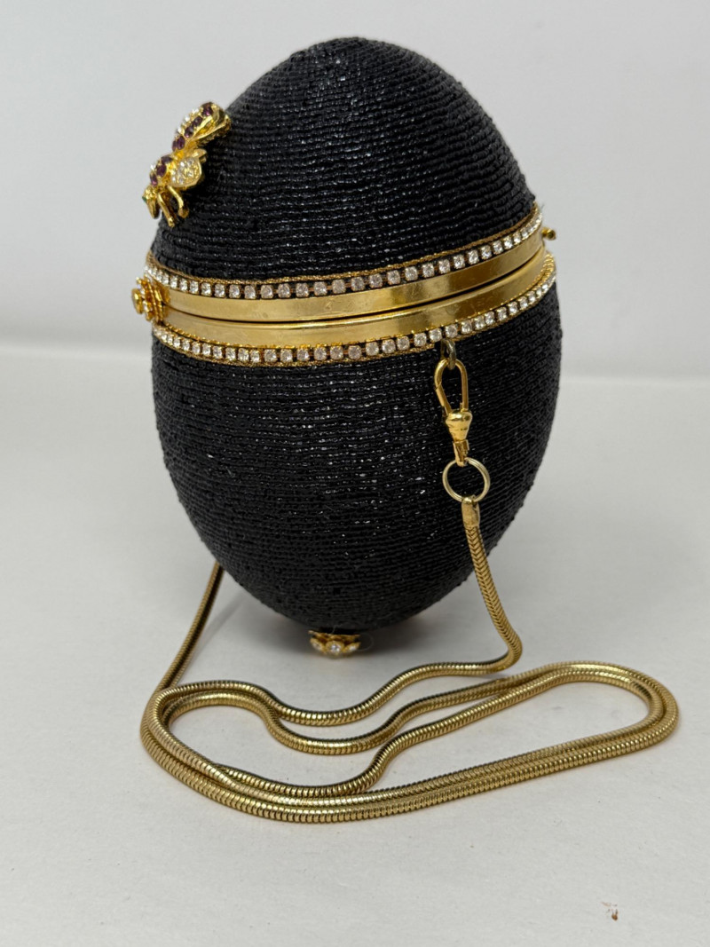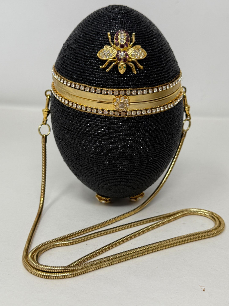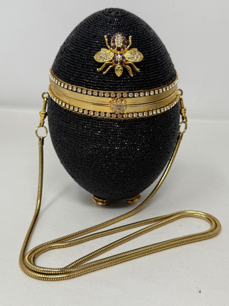 Black Minaudiéres A black, egg-shaped purse or clutch adorned with intricate black beading, a jeweled bee embellishment, and a golden chain strap. It also features a decorative golden band around its circumference, embellished with small crystals or gemstones. Based on its design, it's likely a high-fashion or luxury item. This type of "minaudière" (small decorative handbag) is reminiscent of the style popularized by designer Judith Leiber. Leiber's creations often feature elaborate beadwork, crystals, and novelty shapes,