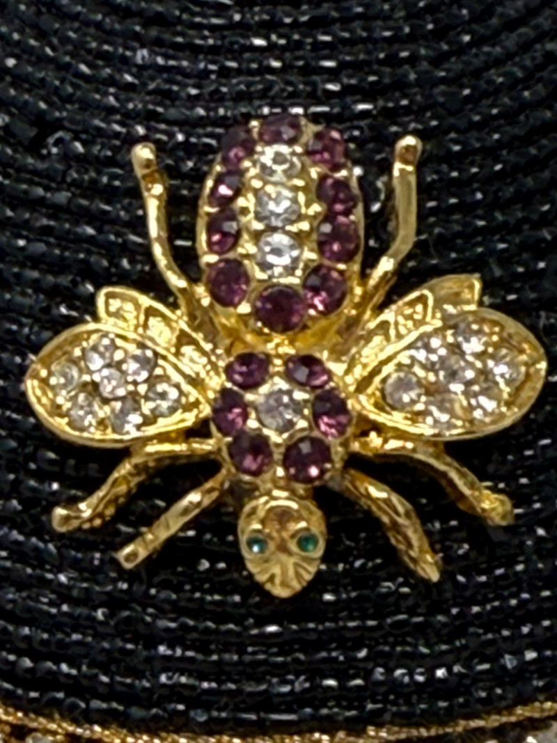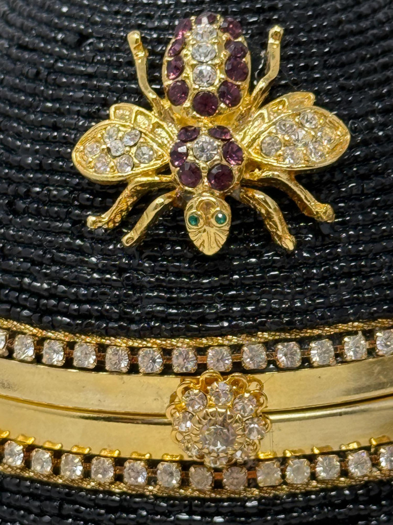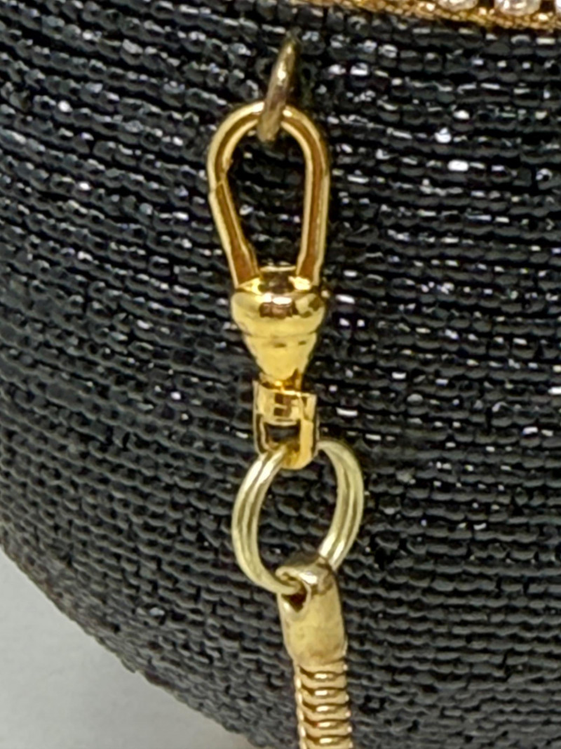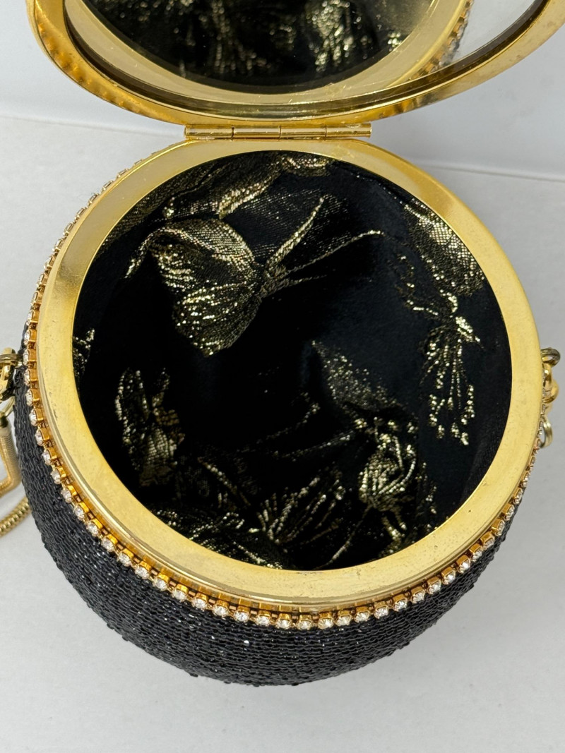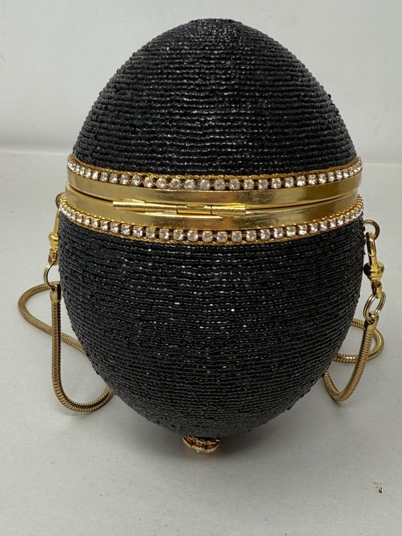 Black Minaudiéres A black, egg-shaped purse or clutch adorned with intricate black beading, a jeweled bee embellishment, and a golden chain strap. It also features a decorative golden band around its circumference, embellished with small crystals or gemstones. Based on its design, it's likely a high-fashion or luxury item. This type of "minaudière" (small decorative handbag) is reminiscent of the style popularized by designer Judith Leiber. Leiber's creations often feature elaborate beadwork, crystals, and novelty shapes,