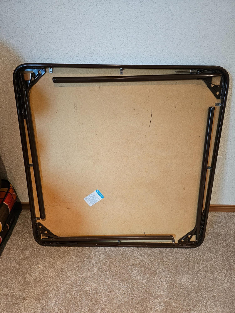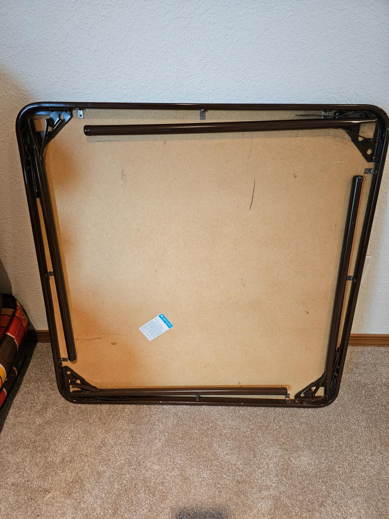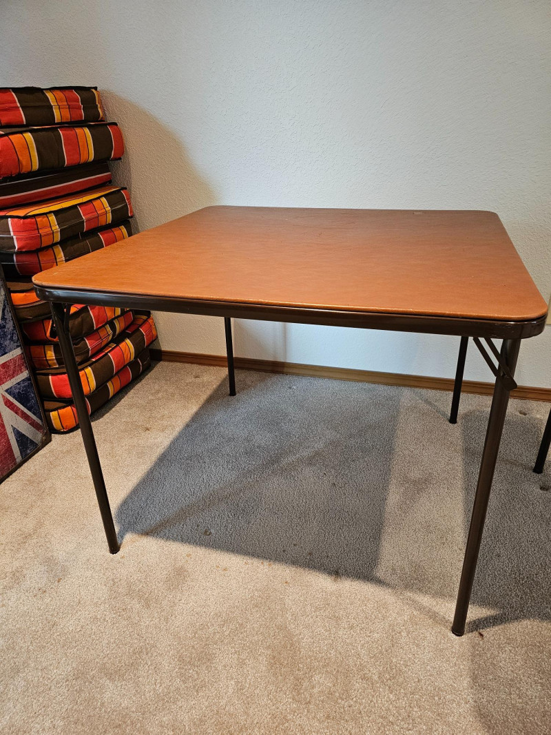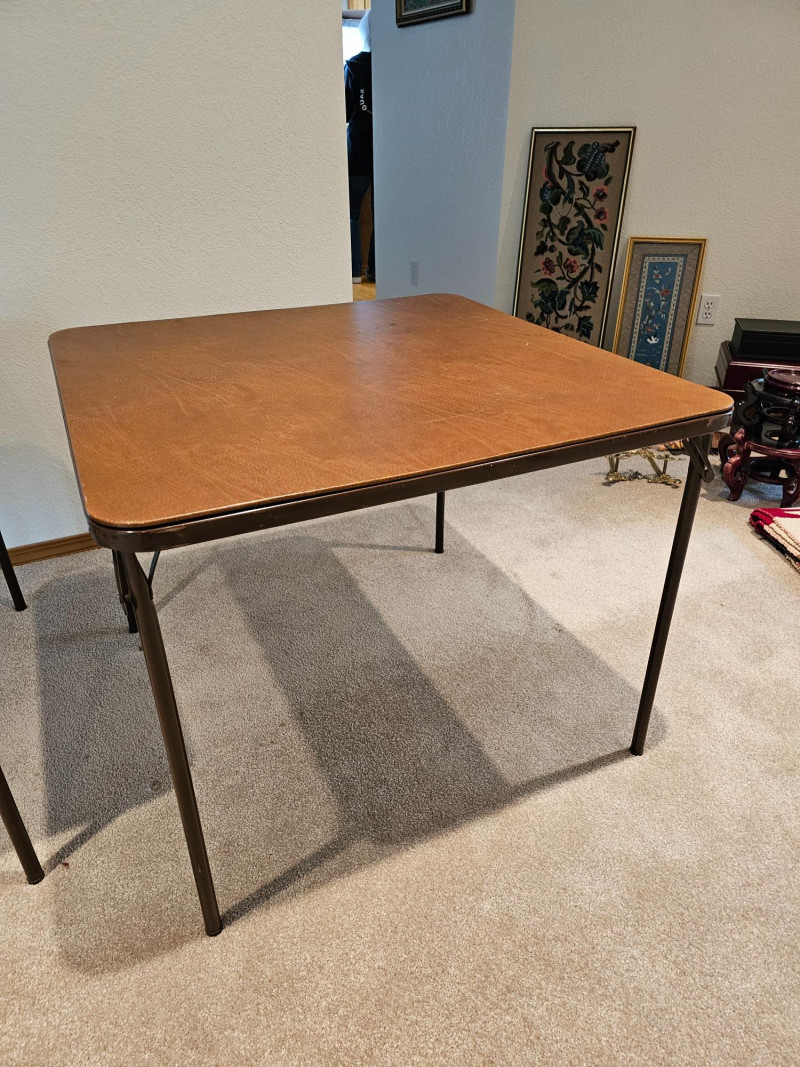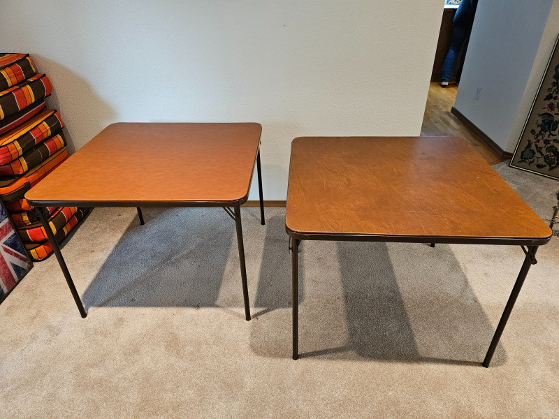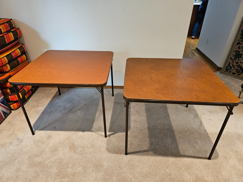 (2) Folding Card Tables Brown vinyl topped square card tables with black metal legs Fold up for easy storage Tables are in good condition with normal wear & tear (see pics) 26.5"T x 33.5"W x 33.5"D