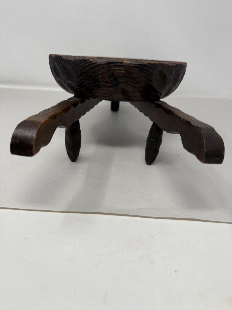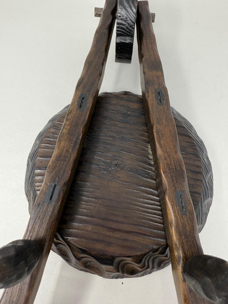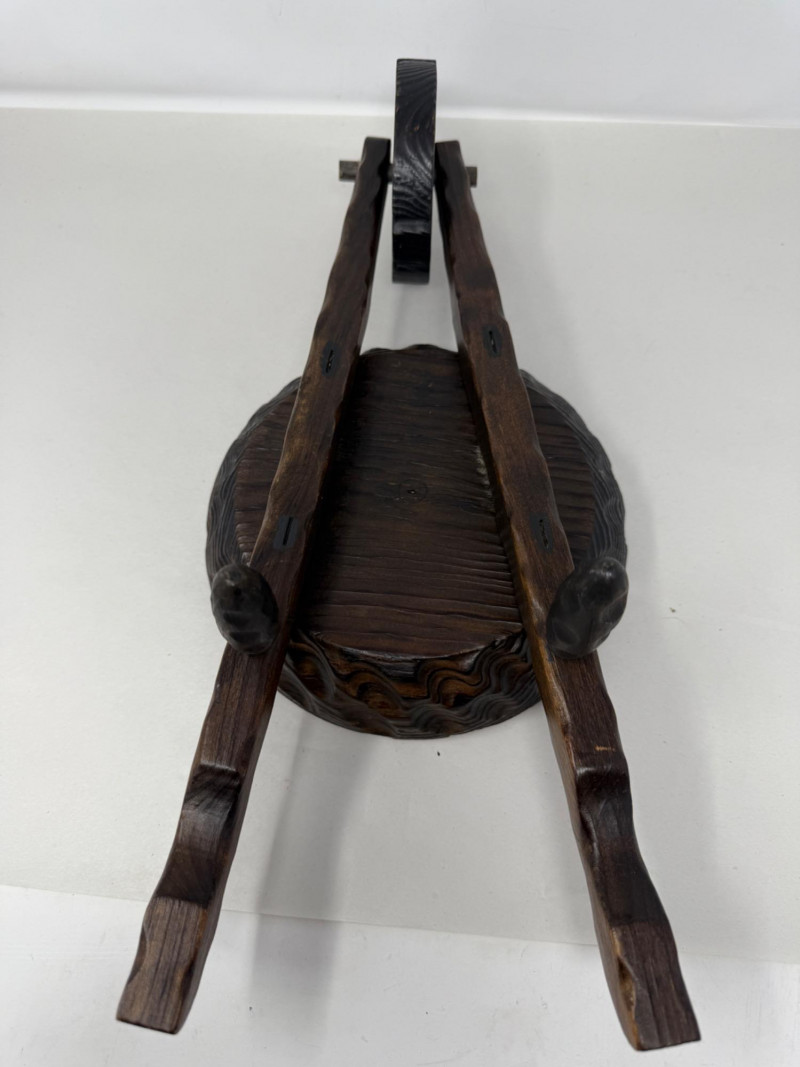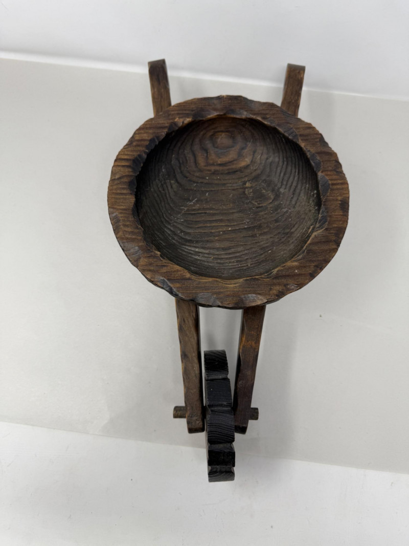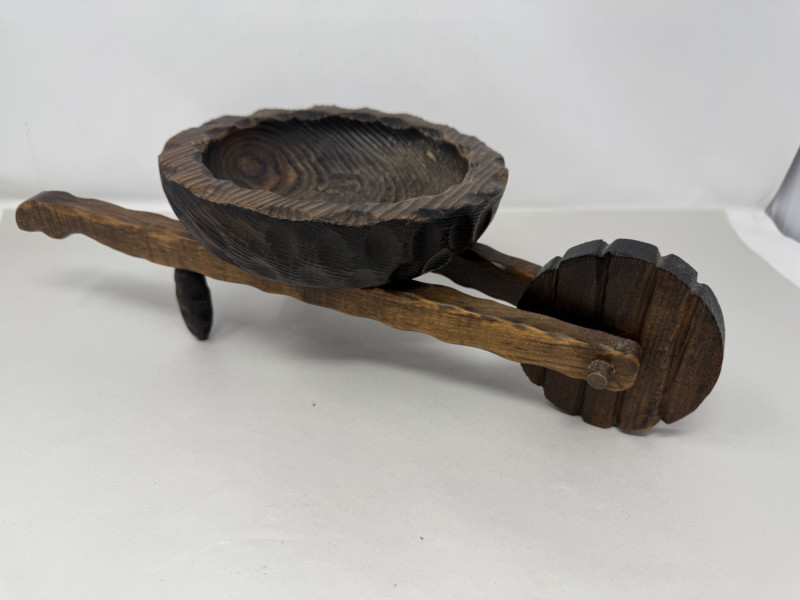 Vintage Hand Carved Wood Wheelbarrow with Attached Snack Bowl. Wheel spins