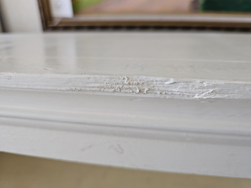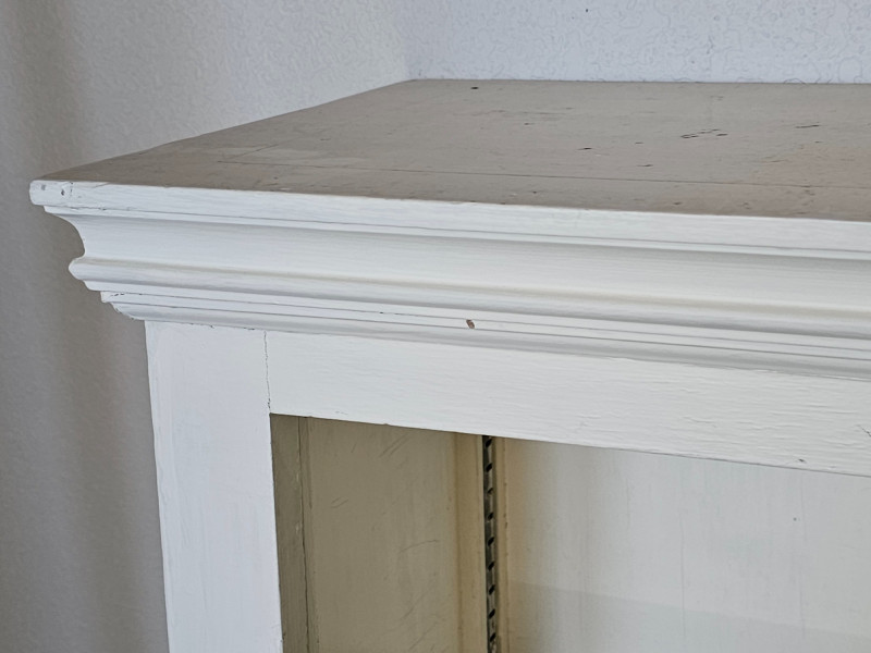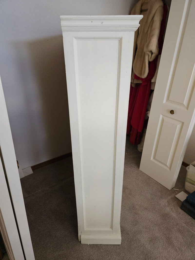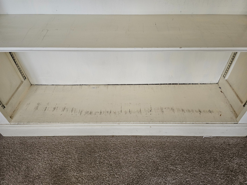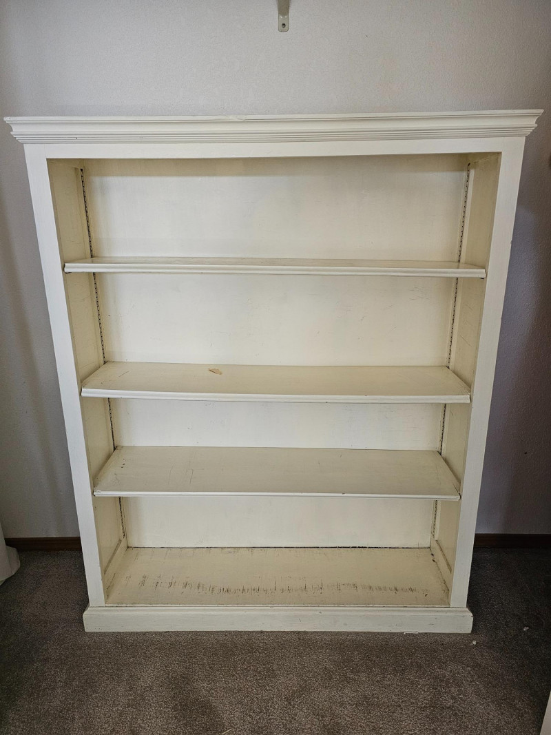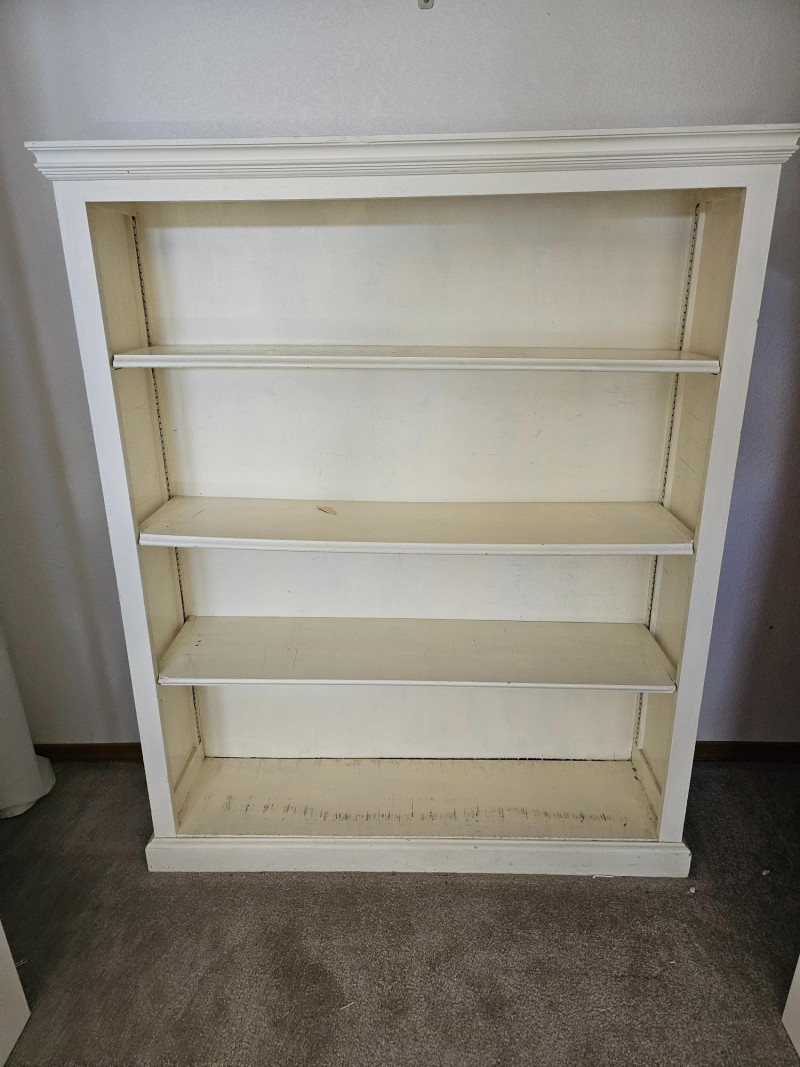 White Adjustable 4-Shelf Bookcase #1 Wood construction Wood adjustable shelves are a bit warped over time under load Could easily be repainted and refurbished, currently in fair condition but solid and usable 53"T x 44"W x 12"D