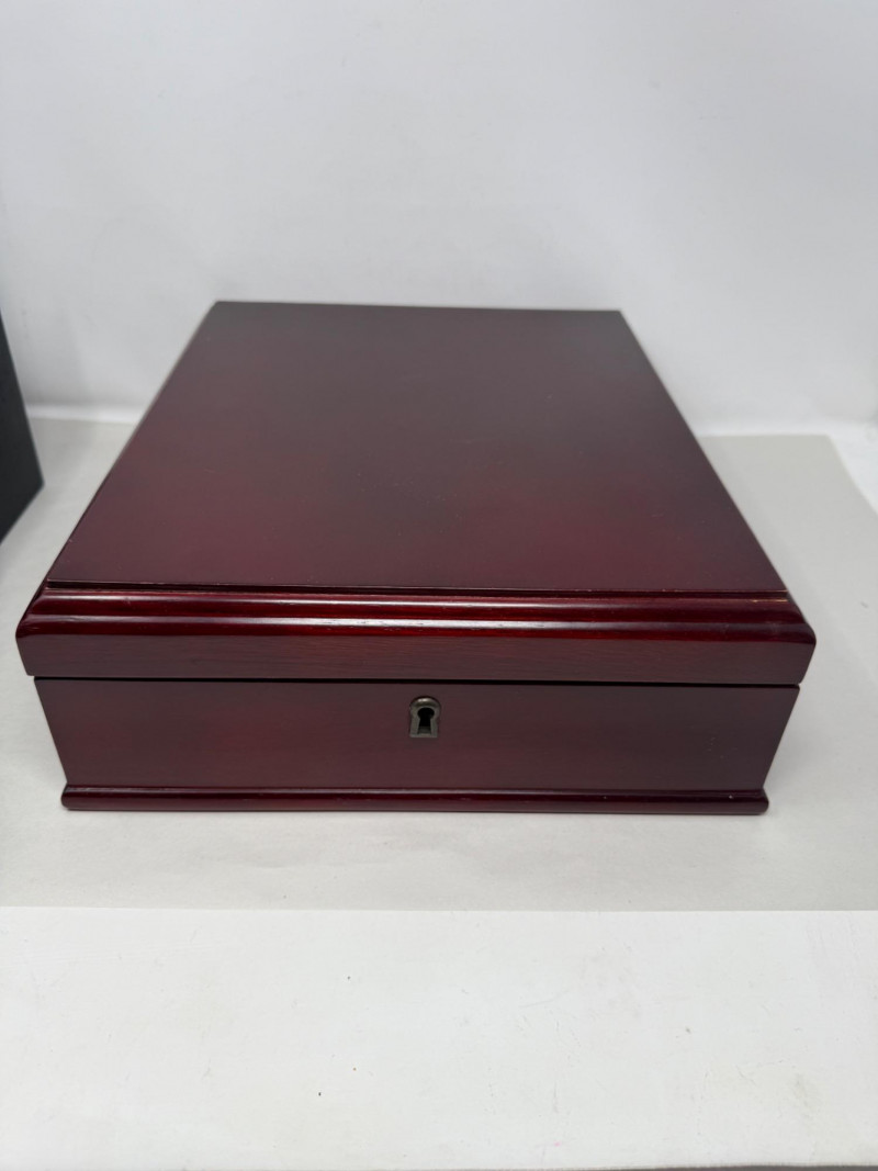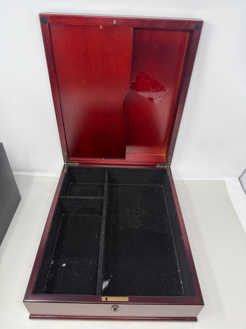 Storage Boxes Cherry tone wood box with lock, no key. 12.5x14.75x4.5”