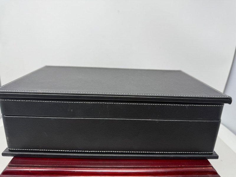 Black vinyl box with white stitching and felt interior.12.5x7.5x3.5”