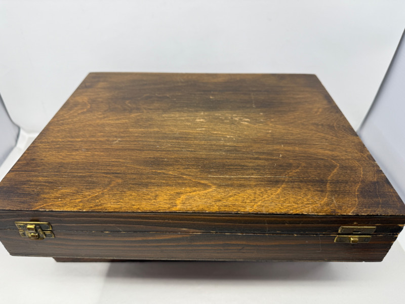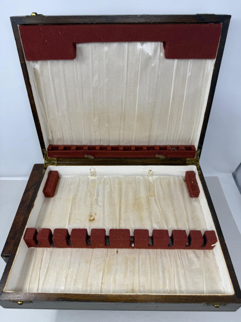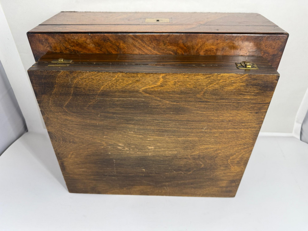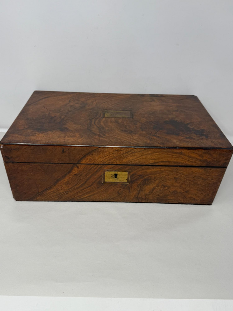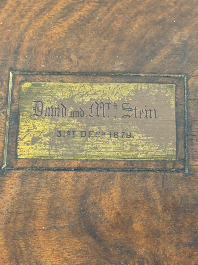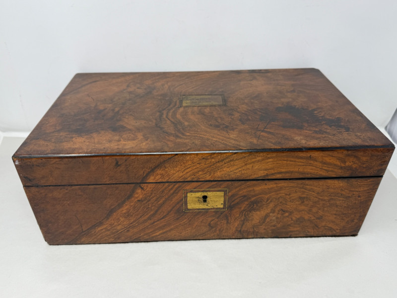 1879 Lap Desk Box & Silver Storage Box 1879 Lap desk box with interior desk portion missing to expose the beautiful lockable (no key) walnut burl box with engraved metal plate on top that says David & Mrs Stein 31st December 1879 Measures 16x9.5x5.5” Silver storage box with ivory satin interior in fair condition. Latch closure with one missing.