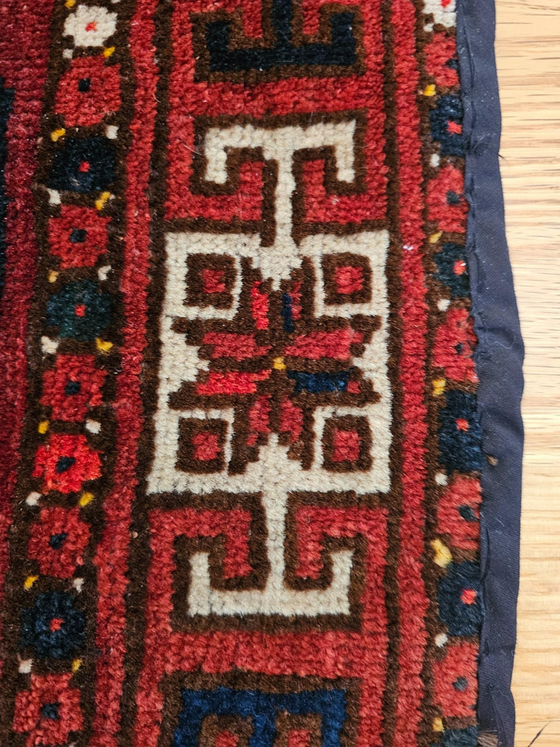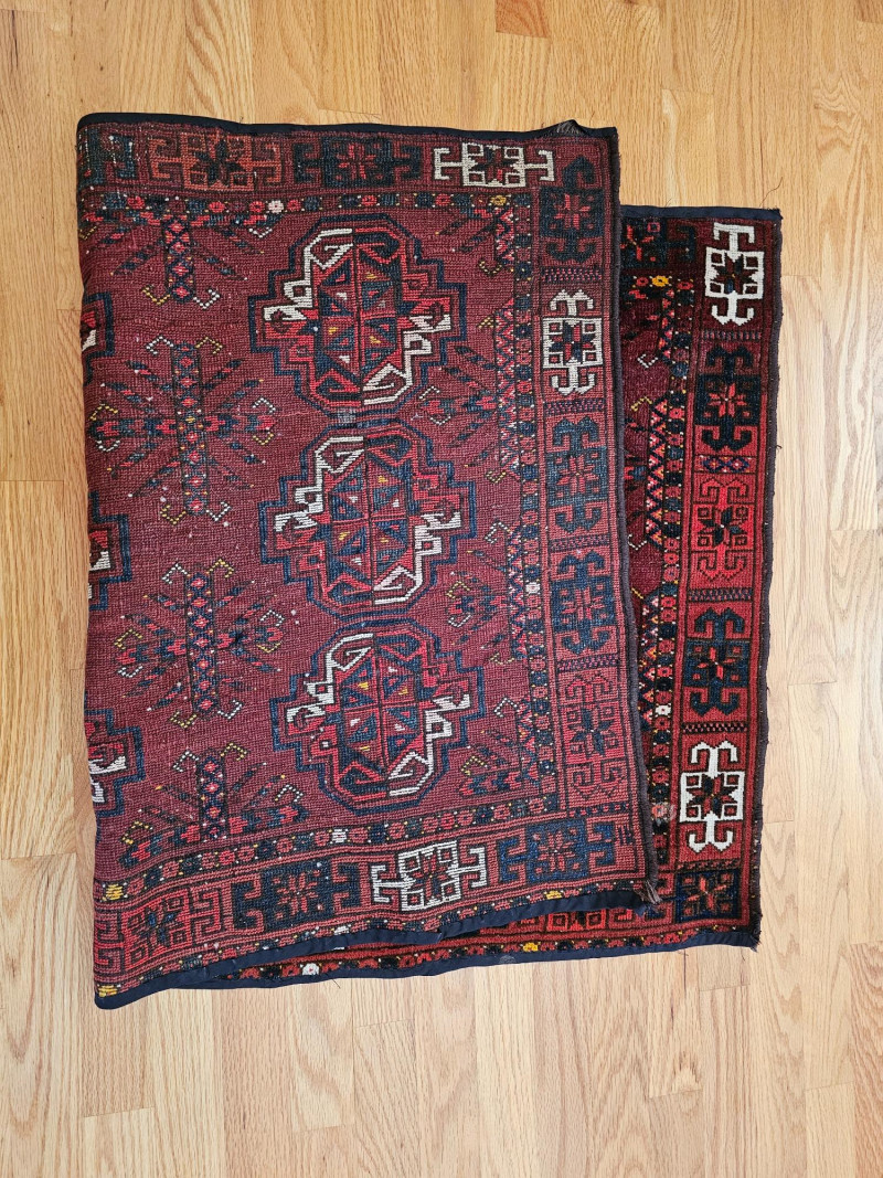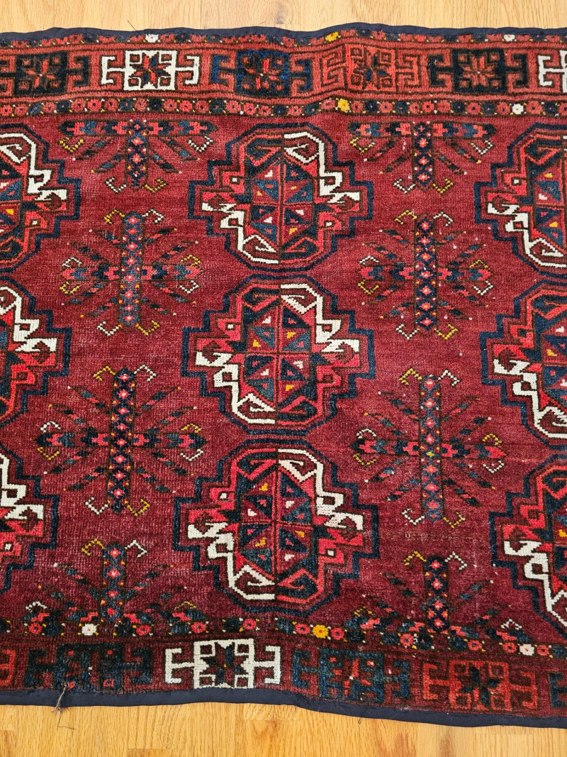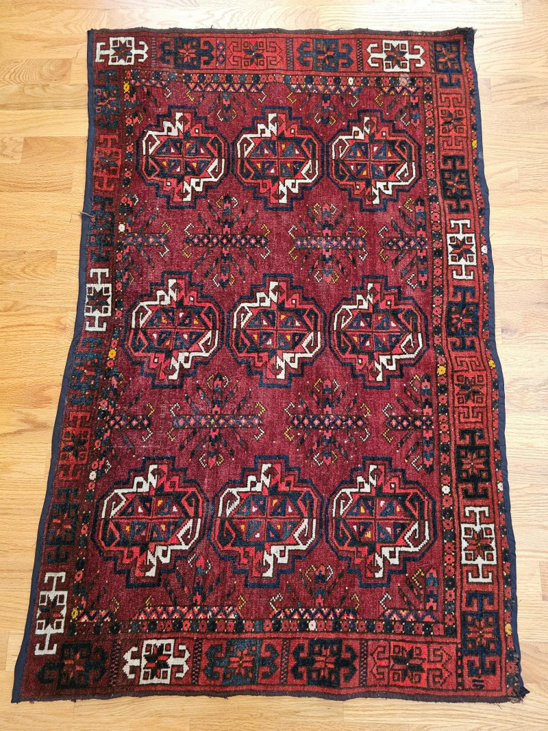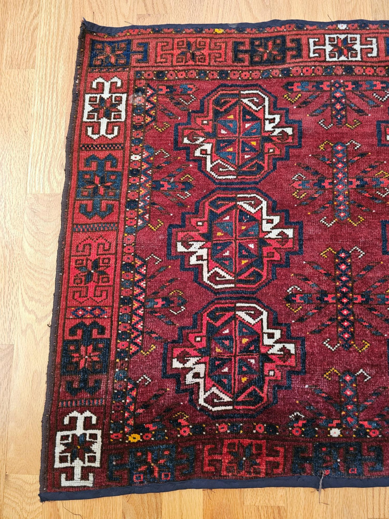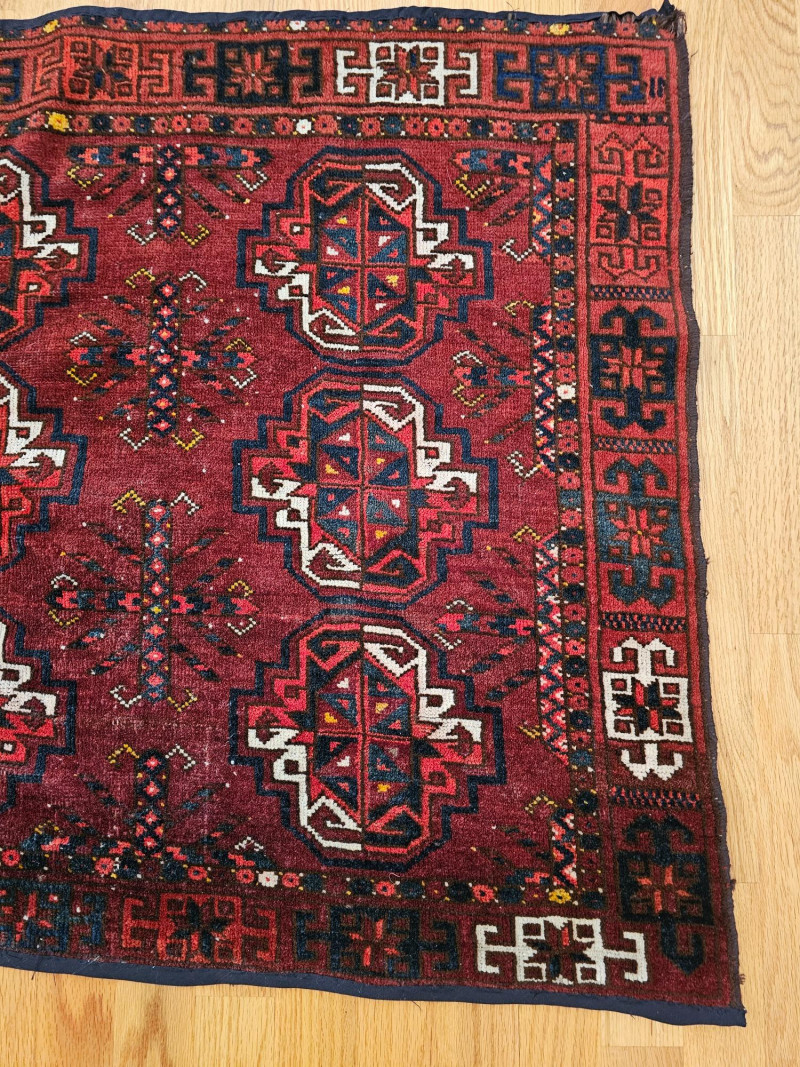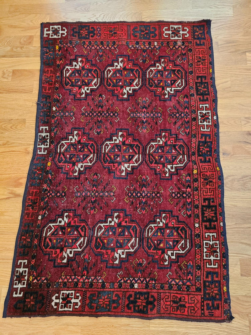 Vintage Handwoven Deep Red Turkoman Rug Turkoman rugs are traditional handwoven carpets originating from Central Asia, primarily woven by nomadic and semi-nomadic Turkoman tribes. These rugs are known for their distinctive geometric patterns, rich colors, and high-quality wool. The designs often incorporate tribal symbols and motifs, reflecting the cultural heritage and traditions of the weavers. Afghan Turkoman rugs, in particular, are highly prized for their durability and intricate craftsmanship. The deep red hues, often derived from natural dyes, are characteristic of these rugs. The repeating geometric patterns, such as the 'gul' motif, are a hallmark of Turkoman weaving, making each rug a unique piece of art with historical and cultural significance. This rug appears to be in used condition with a few flaws (see pics) 45.5" x 29.5"
