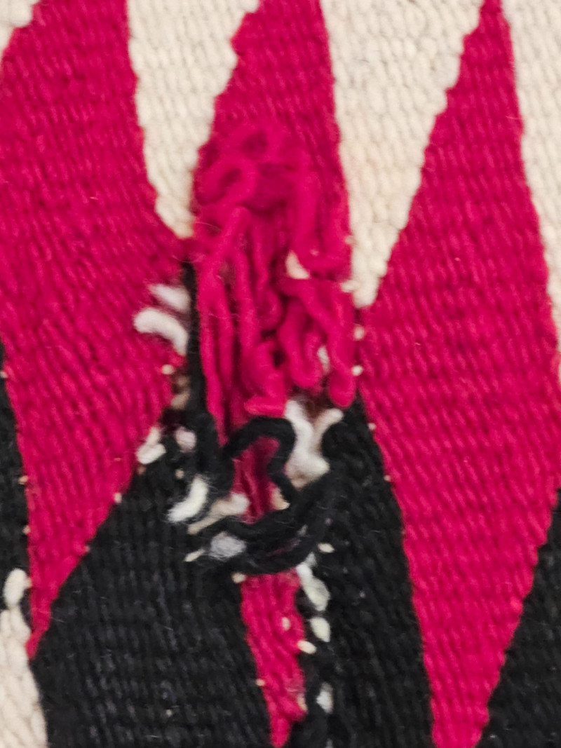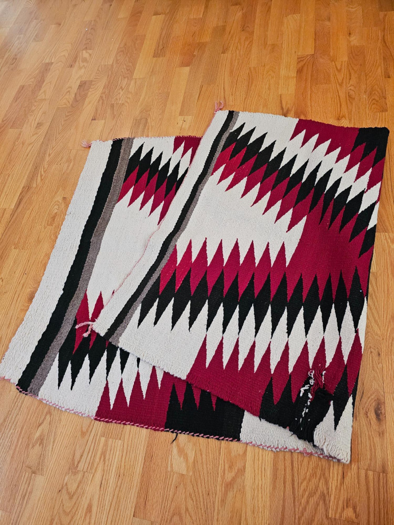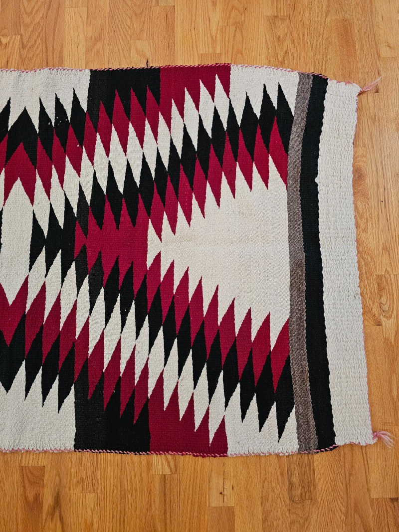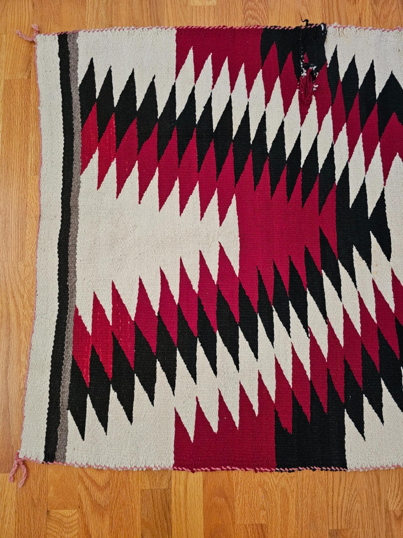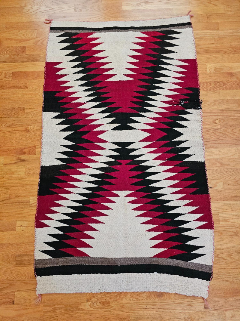Vintage Navajo Indian Double-Saddle Blanket The blanket depicts a prominent pattern featuring geometric shapes, particularly a series of interconnected diamond-like patterns created by zigzags in red, black, and white. This style of bold geometric design is characteristic of many Navajo rugs and blankets, particularly those from the "Transitional" period. This blanket appears to be in used condition with some flaws (see pics) 60" x 36"