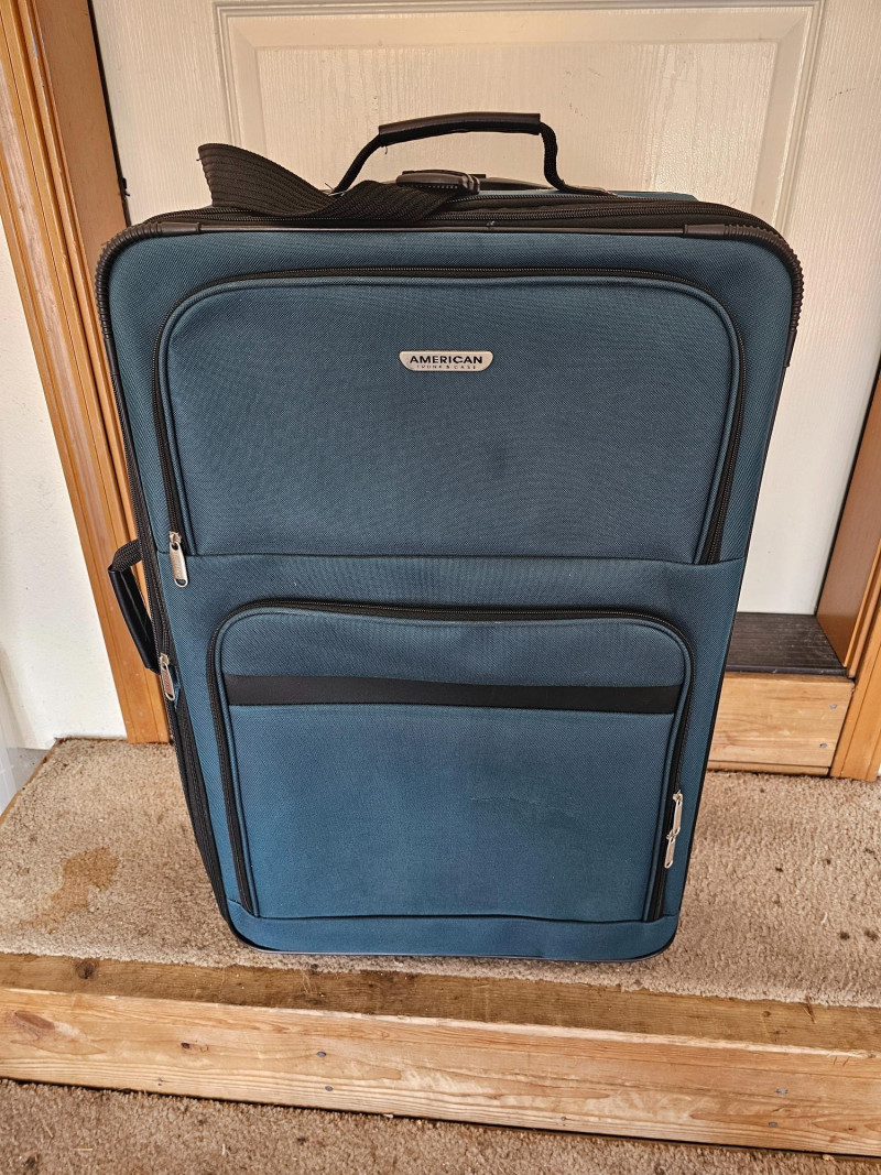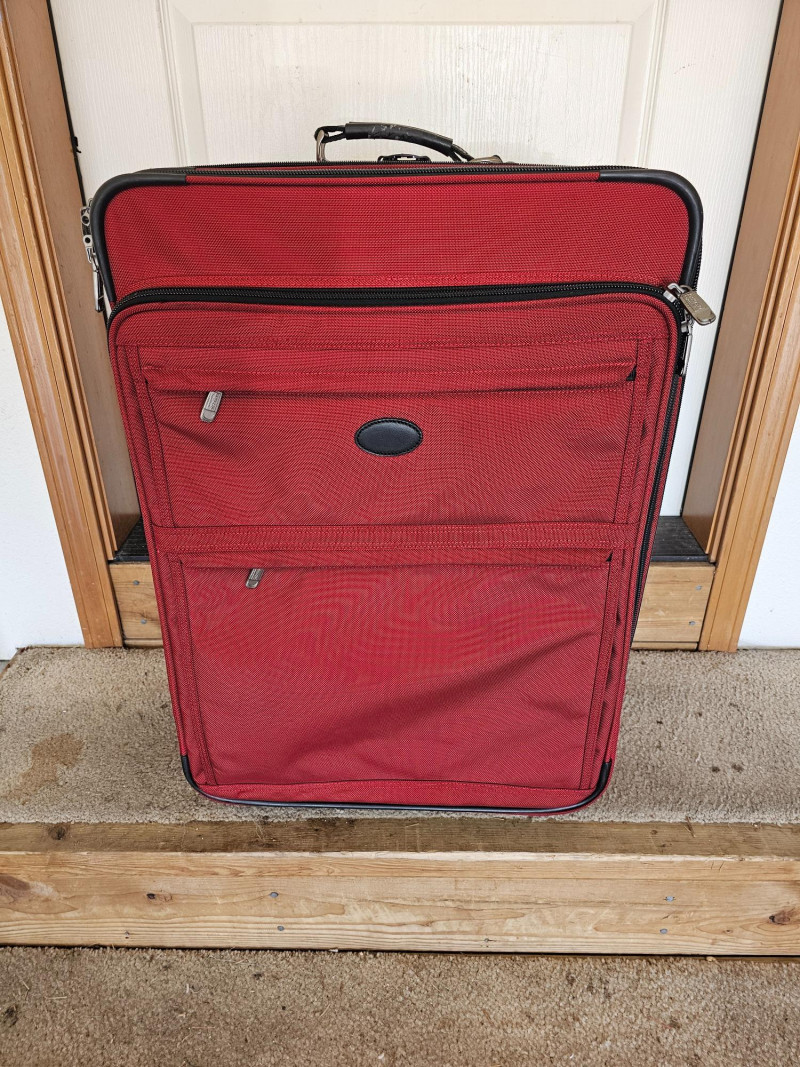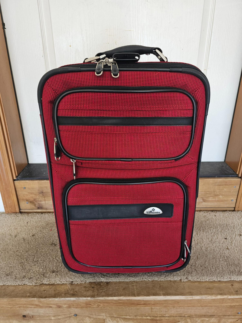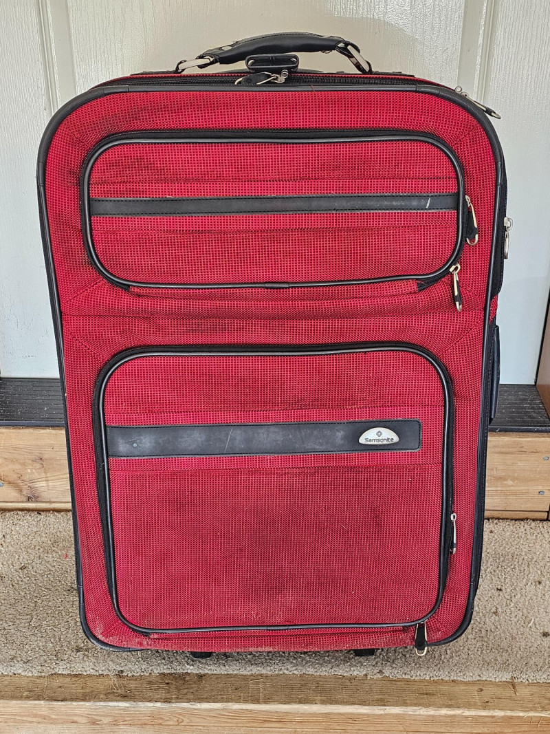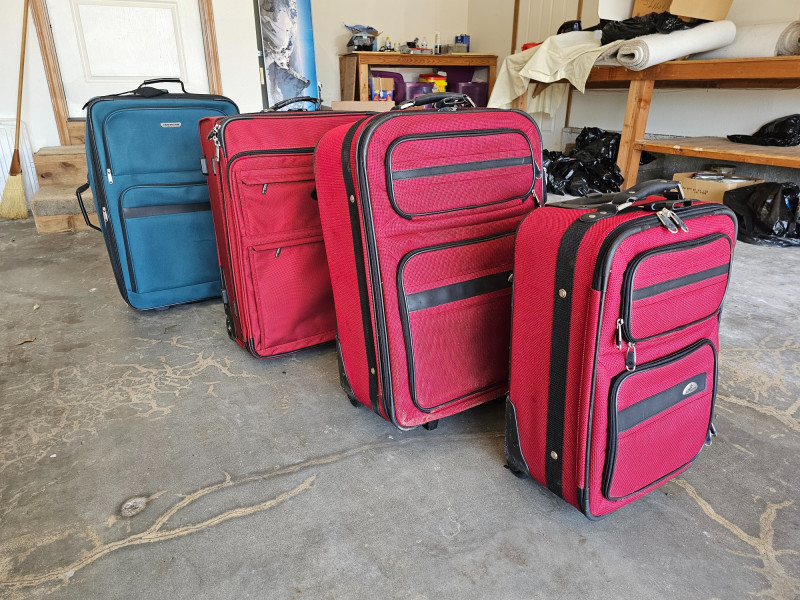 (4) Pieces Of Luggage (1) Red Samsonite Carry-On 22"T x 14"W x 9"D (1) Red Samsonite Suitcase 28"T x 20"W x 11"D (1) Teal American Trunk Case Suitcase 28"T x 18"W x 10"D (1) Red Kirkland Suitacase 27"T x 19"W x 12"D All have wheels and handles All in good condition, could use a wipe down (bit dusty). Normal wear & tear one would expect from used luggage (see pics for condition) 4 suitcases in total