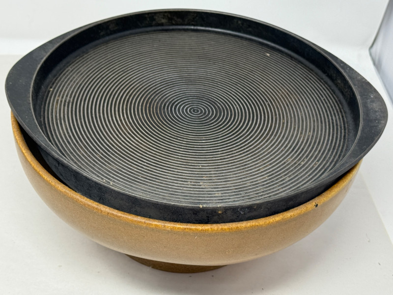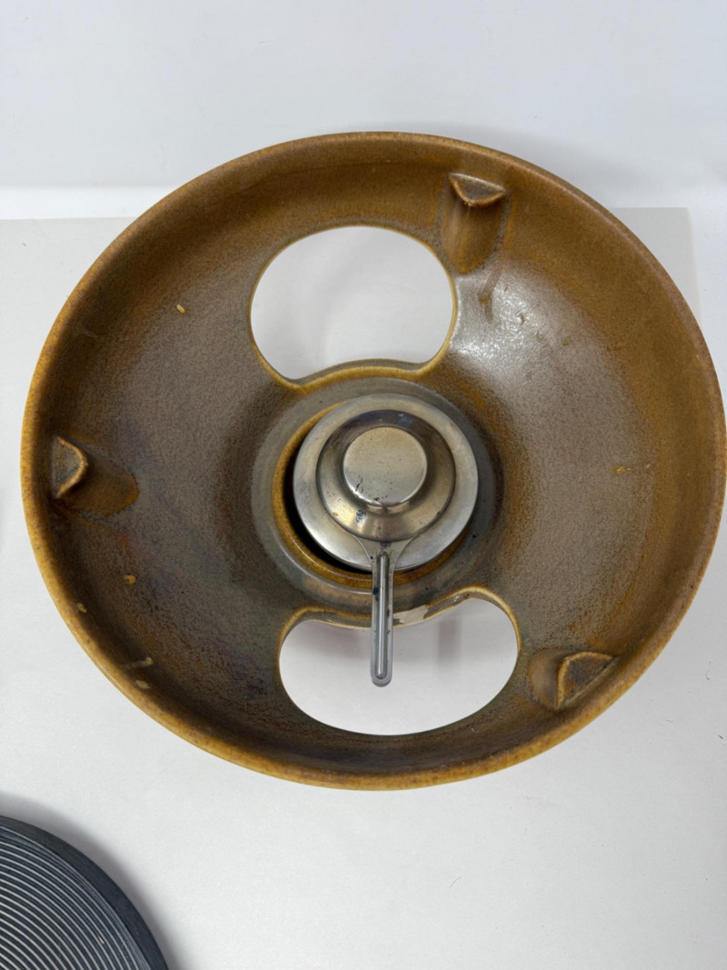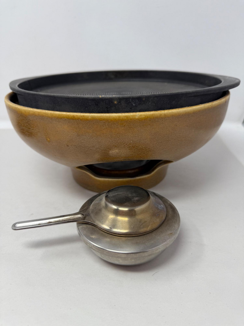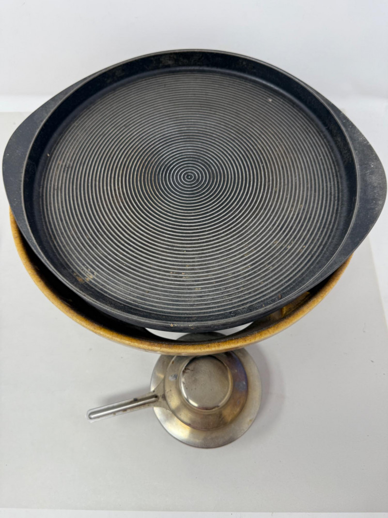 Sigg Switzerland Raclette. These ceramic raclettes were designed to melt cheese at the table, providing a unique and interactive dining experience. The use of ceramic ensured even heat distribution. Measures 11.75x5.5”