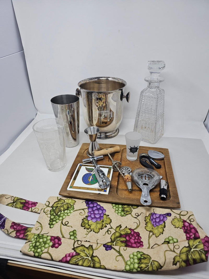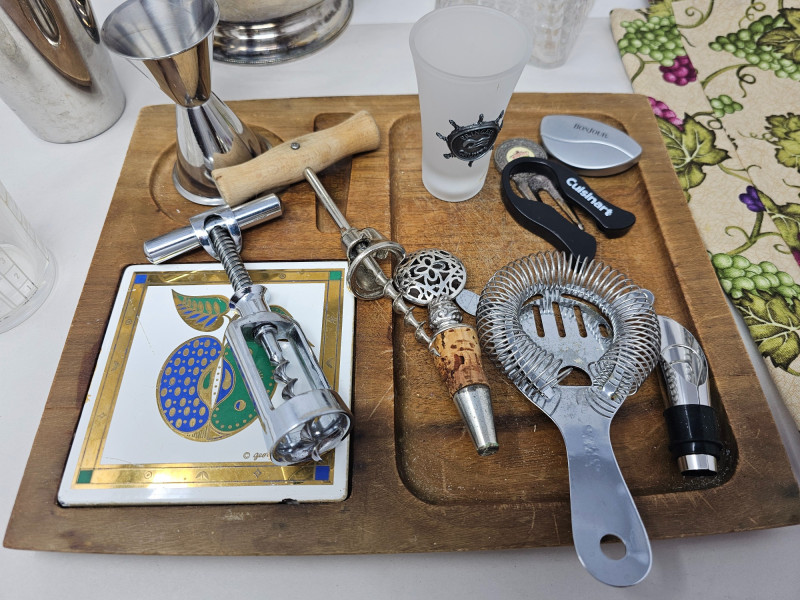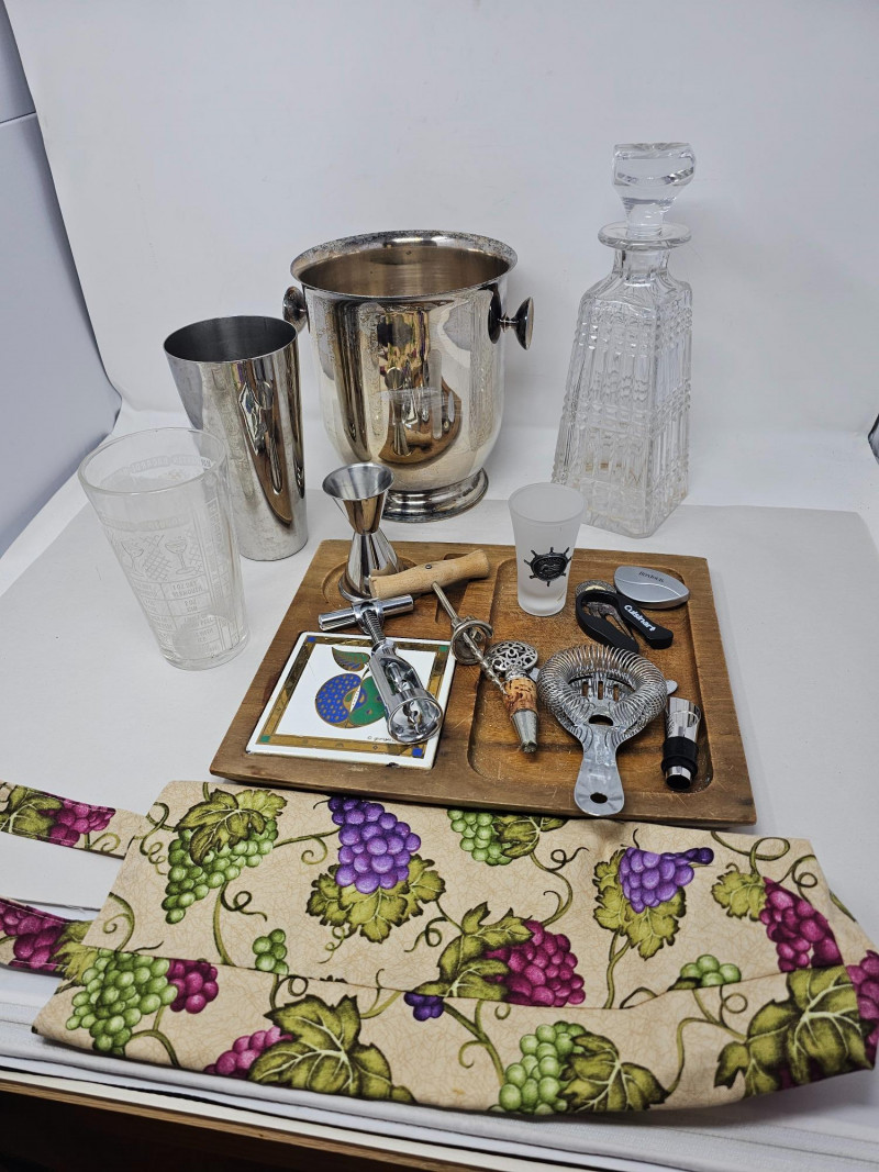 Miscellaneous Barware Wine openers, fancy wine stoppers, foil cutters, shot glasses, strainer, ice bucket, shaker cup, decanter, and pounders glass 15 pieces in all!