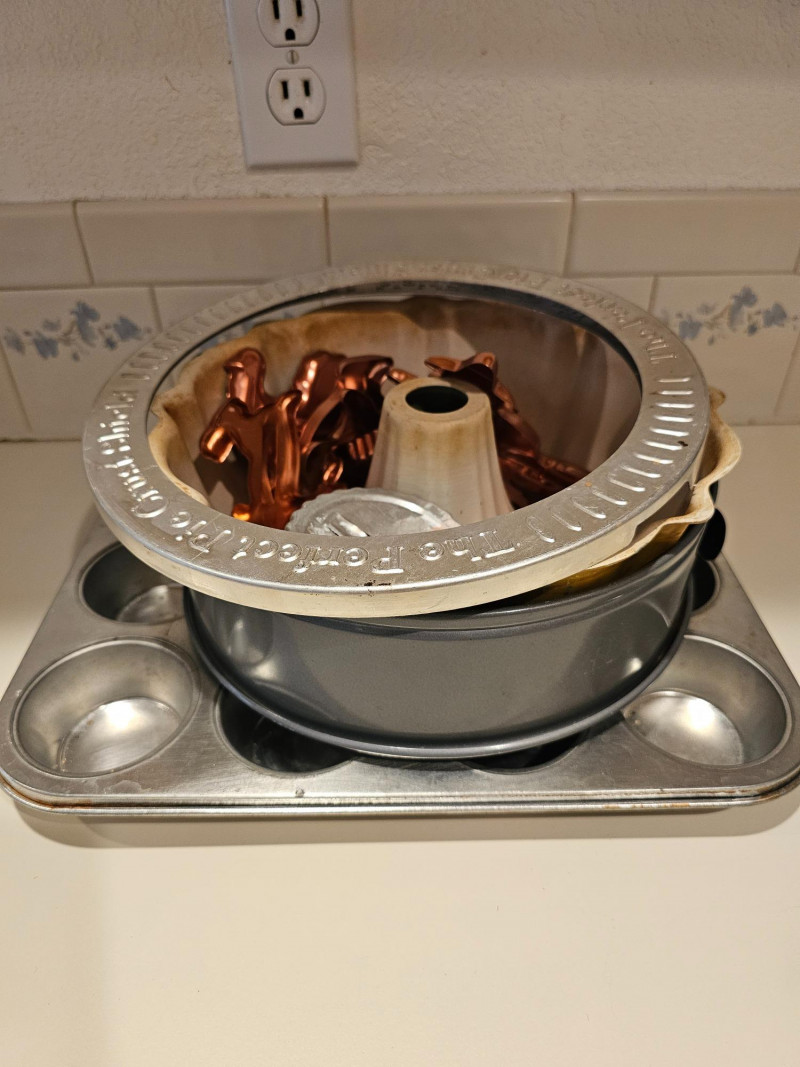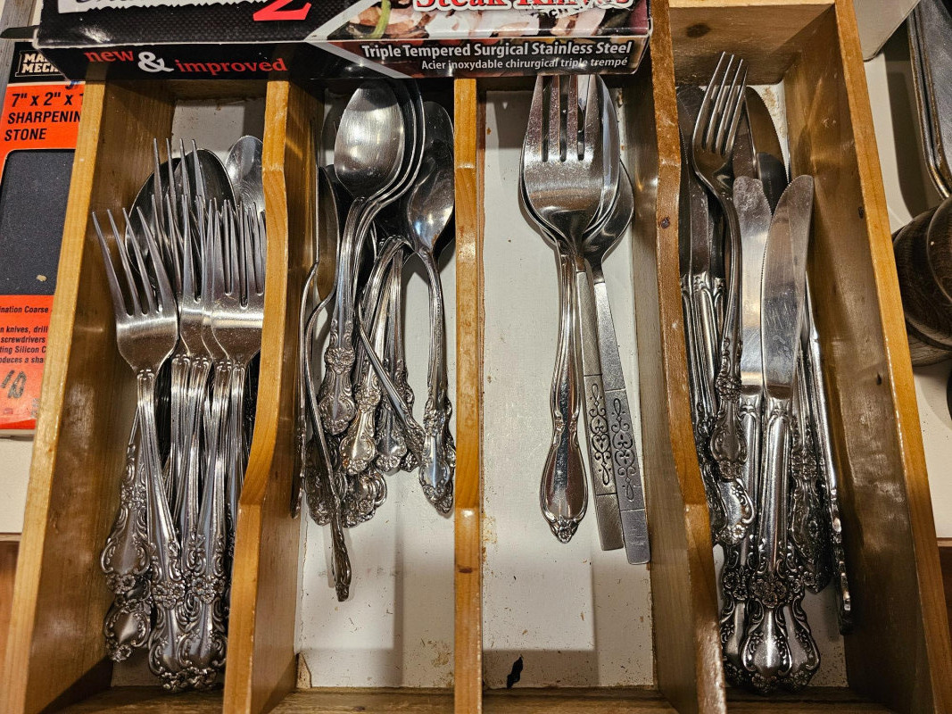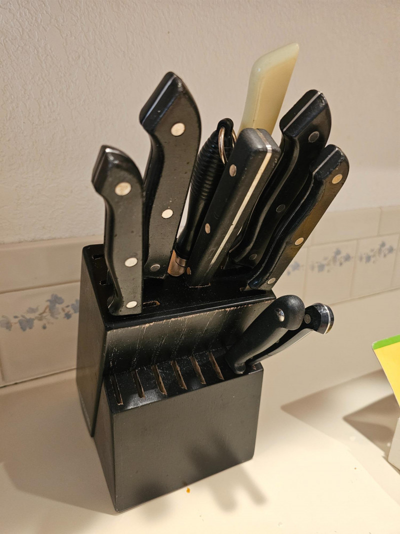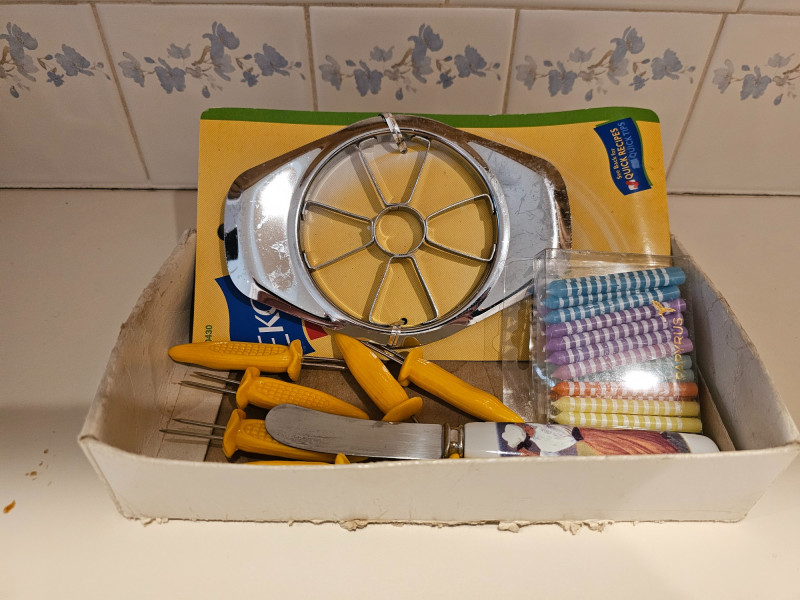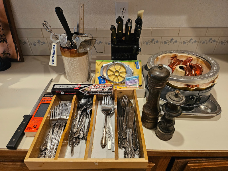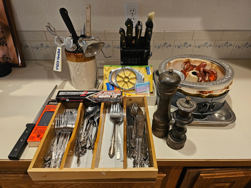 The Kitchen Drawers Silverware, knife block, knives, baking dishes, crock with utensils, sharpening block, corn cob skewers, salt & pepper mill, cookie cutters Lots of great stuff!