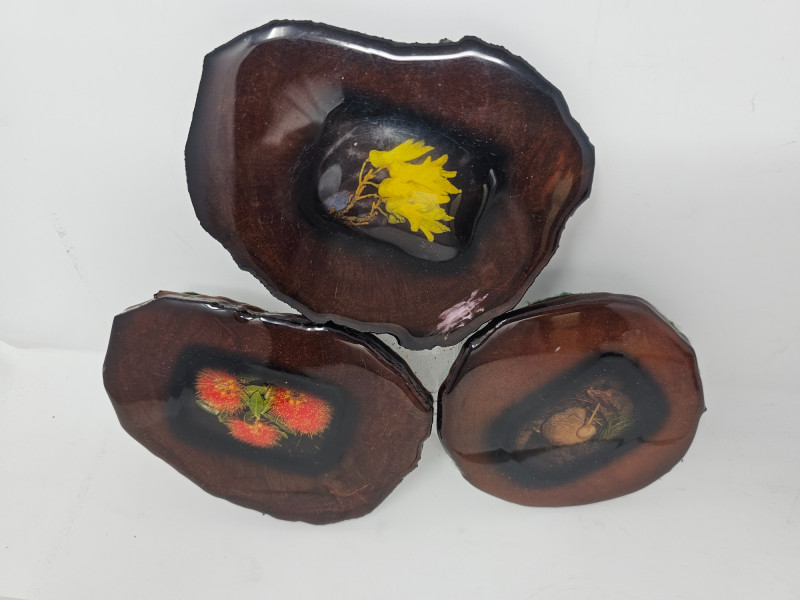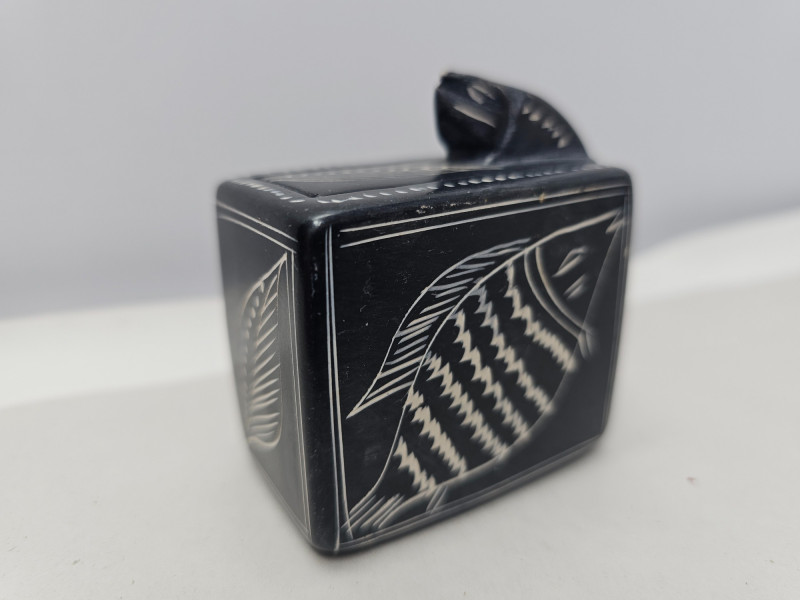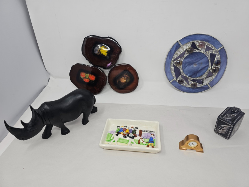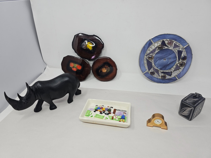 Miscellaneous Cool Stuff Devonmoor Pottery pin dish Handcarved wood rhinoceros (horn repair) Mini mantle clock Handmade stained leaded glass clock face Vintage Kenyan soapstone box with a snake design Flowers epoxied on wood rounds