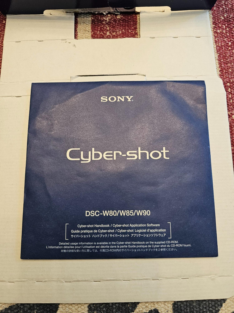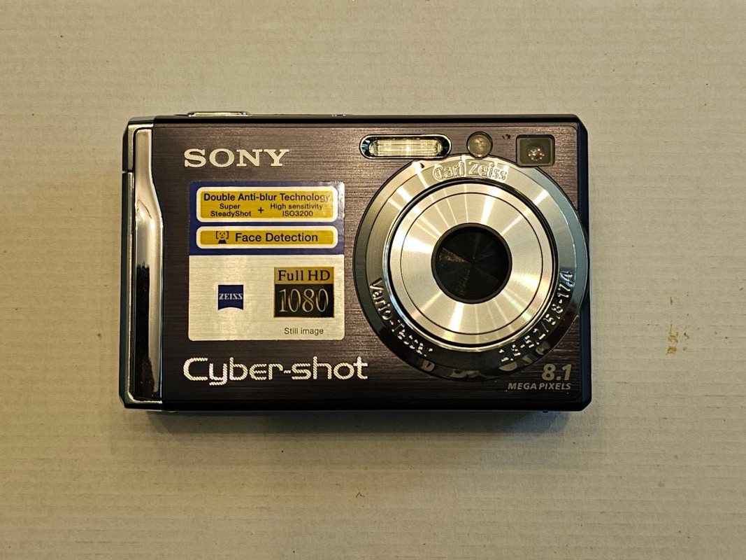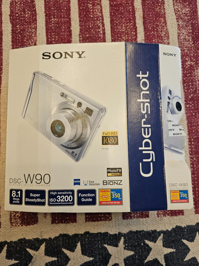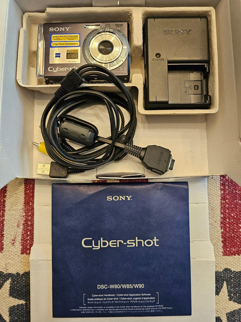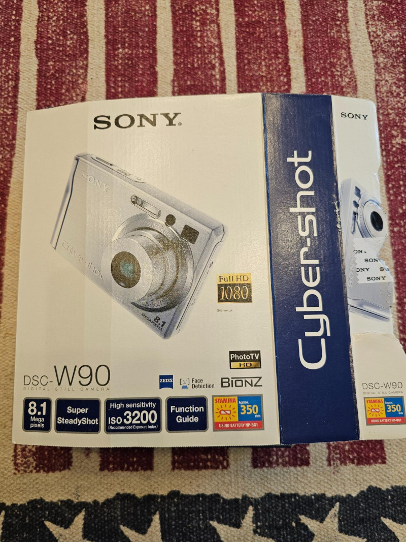 Sony Cybershot DSC-W90 Digital Camera Resolution: 8.1-megapixel Super HAD CCD sensor, capturing enough detail for large prints. Lens: Carl Zeiss 3x optical zoom lens (equivalent to 35-105mm on a 35mm camera). Image Stabilization: Super SteadyShot optical image stabilization. Sensitivity: High sensitivity mode up to ISO 3200 for low-light shooting. Display: 2.5-inch LCD screen. Features: Face detection In-camera retouching and red-eye reduction HD output and HD slideshow with music 9-Point Auto Focus D-Range Optimization 31 MB internal memory, compatible with Memory Stick Duo/PRO Duo media MPEG Movie VX Fine Mode for VGA video recording at 30fps Stamina battery life (up to 350 shots) Near New condition in original box and packaging Includes memory card, rechargeable battery, charger, AV cable, CD software Tested - Works!