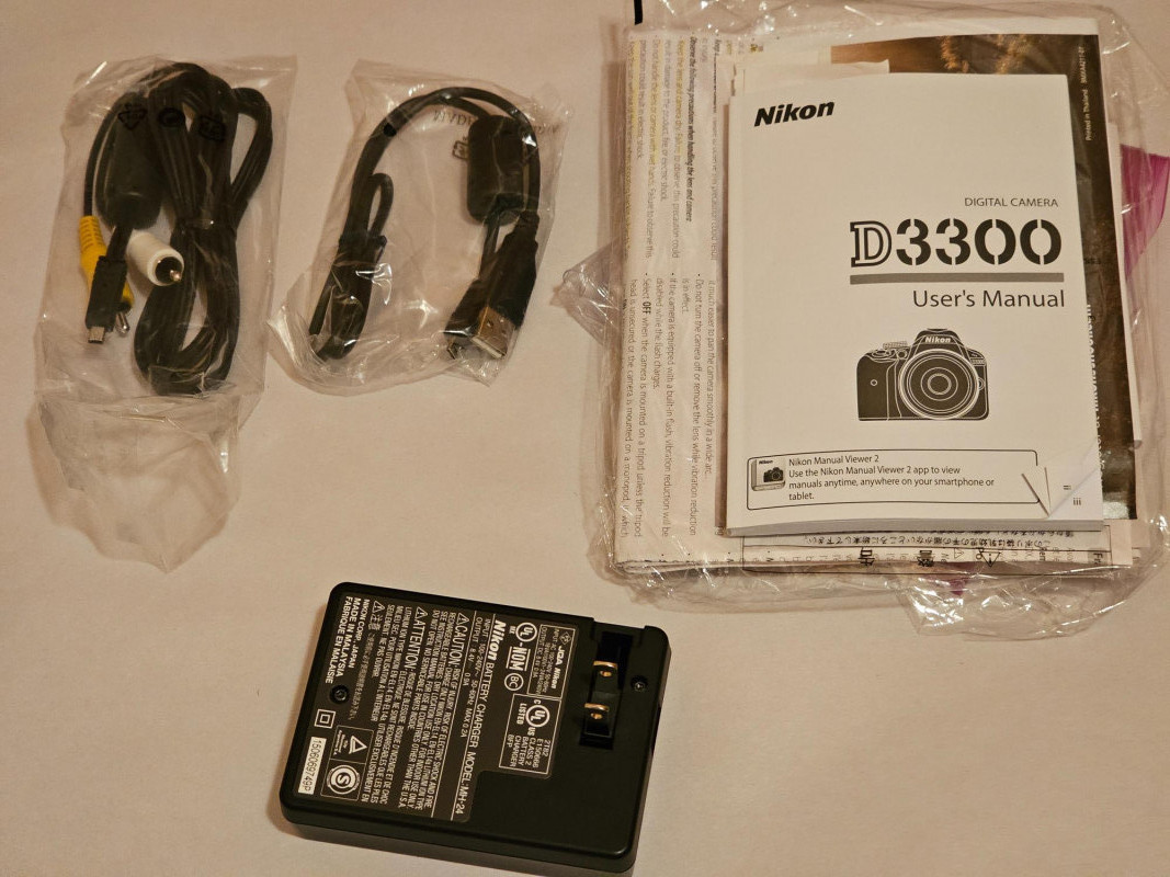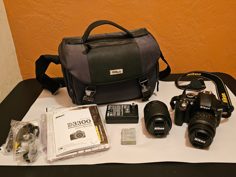 Nikon D3300 Camera Package Nikon D3300 DX Format DSLR Camera Nikon AF-S DX NIKKOR 18-55mm 1:3.5 - 5.6G ED VR II lens Nikon AF-S DX NIKKOR 55-200mm 1:4 - 5.6G ED VR II lens Nikon Lithium Ion Battery Pack & Wall Charger Nikon Camera Bag With Storage User's Manual & Documentation Additional cords & cables Tested - Works Great!