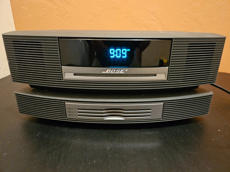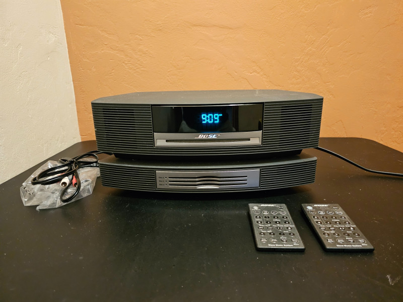 BOSE Wave Music System Model #AWRCC1 AM/FM/CD/AUX Stereo with amazing BOSE sound Includes 3-CD Changer Accessory Includes 2 remotes, power cord & aux cords In good condition! Tested - Works! 6.5"T x 14.5"W x 9"D