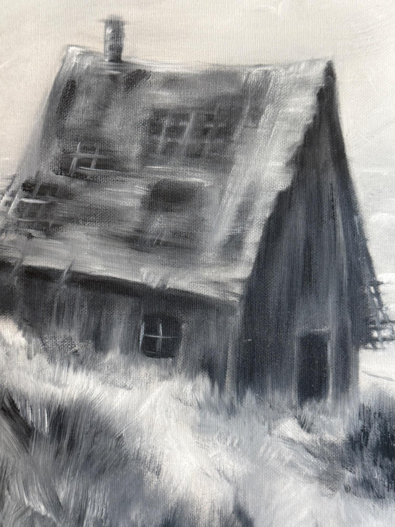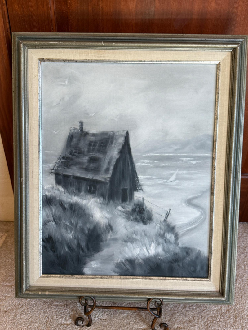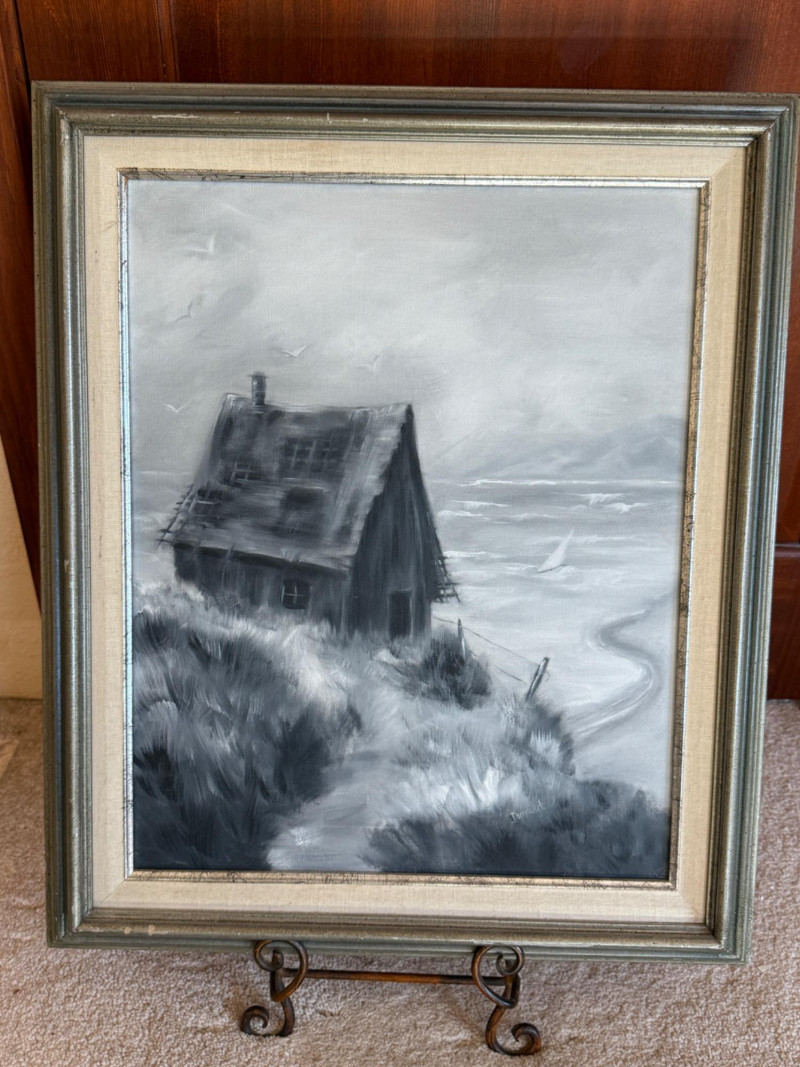 Lot # 19 - Original Acrylic Beach Cabin Painting Silver Frame by Dunnington